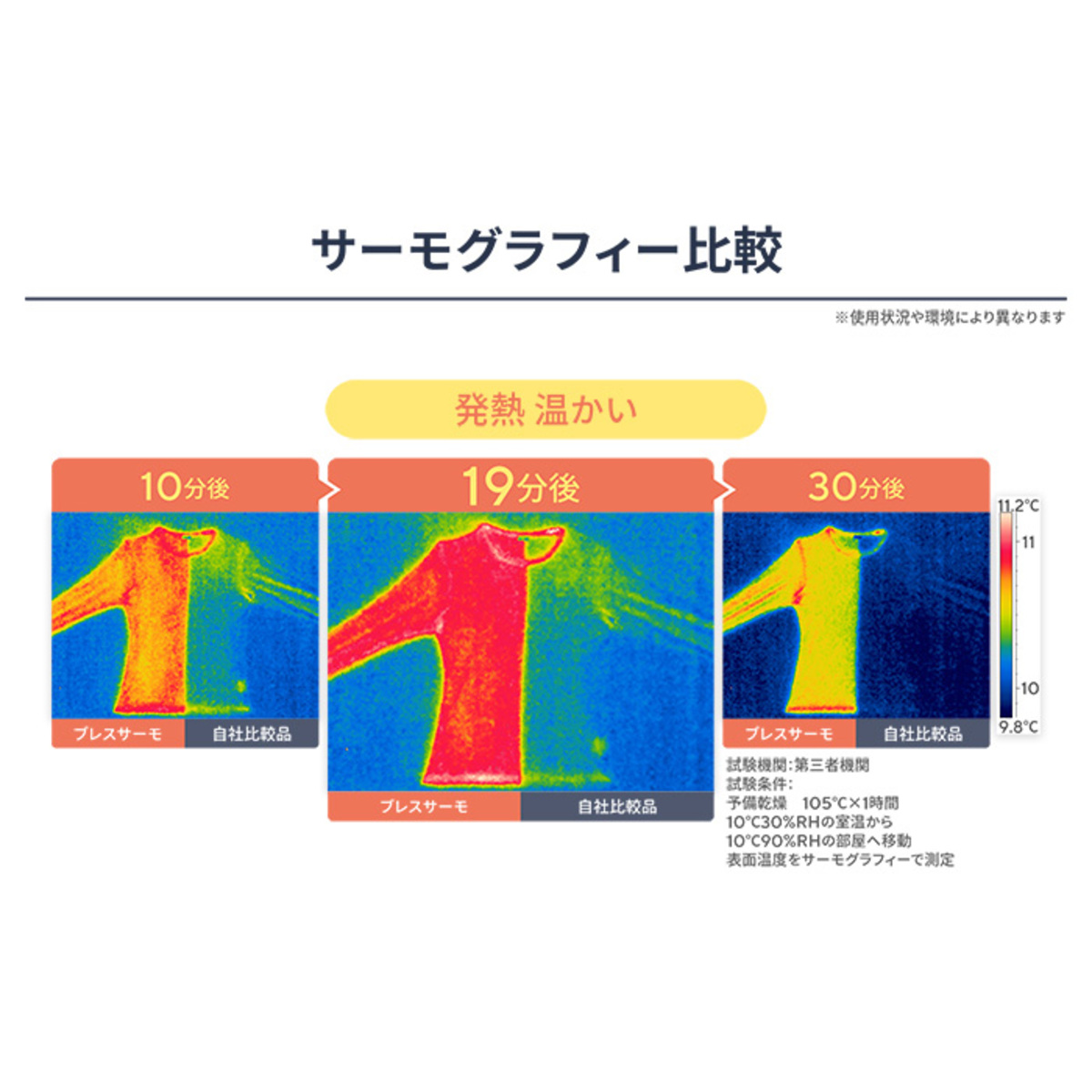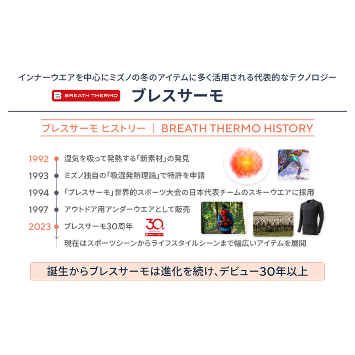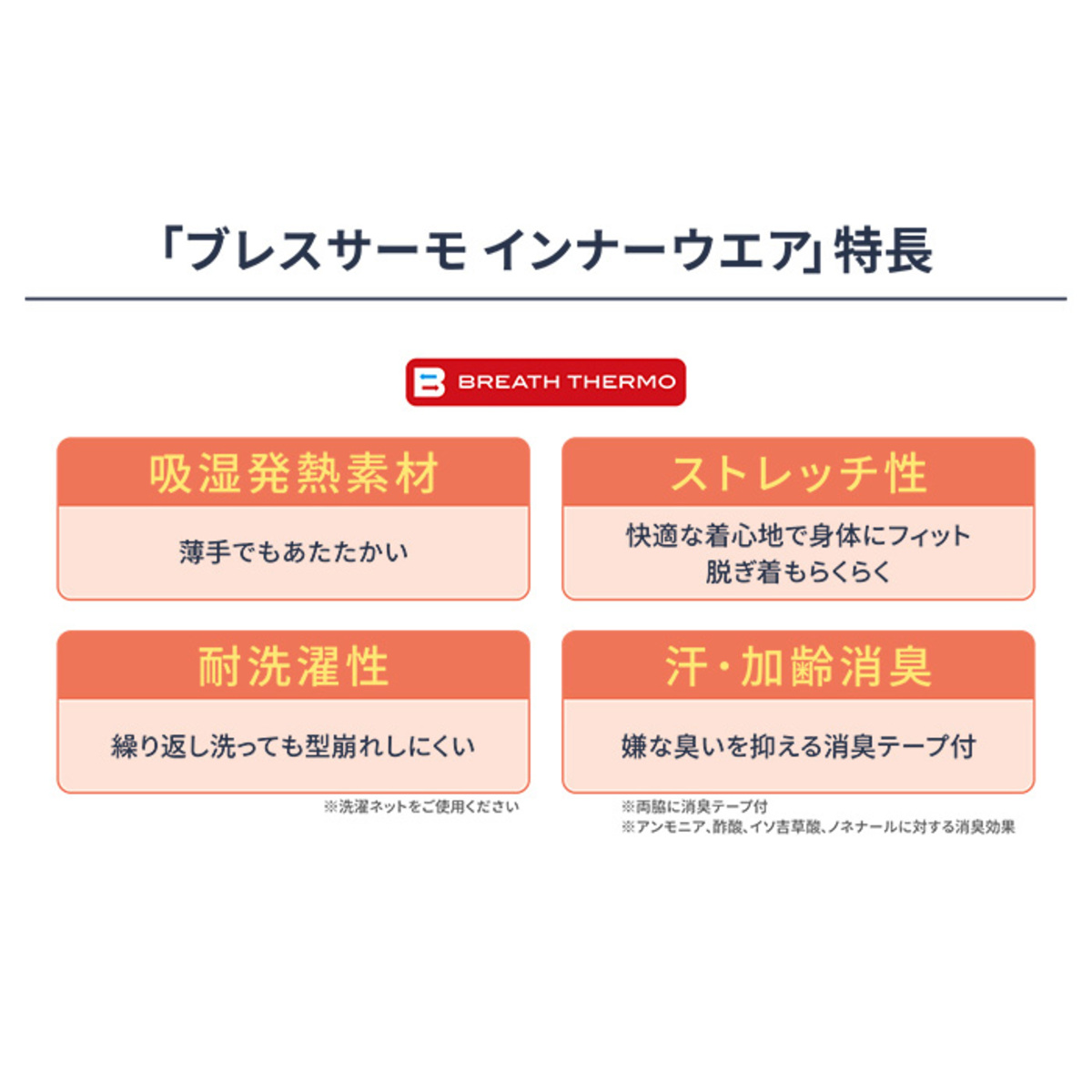 吸湿発熱素材「ブレスサーモ」を使用したアンダーウェア。ブレスサーモは、人体が発する水分(水蒸気)を吸収して発熱する素材。人間は常に水分を放散しているから、じっとしたままでも温かいのはそのためです