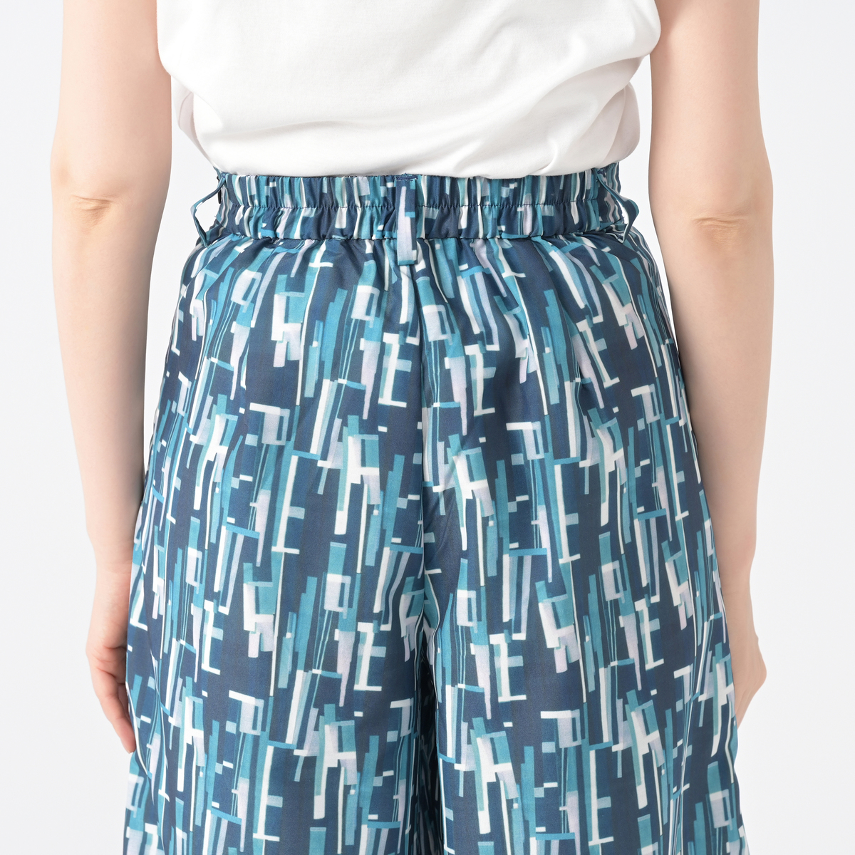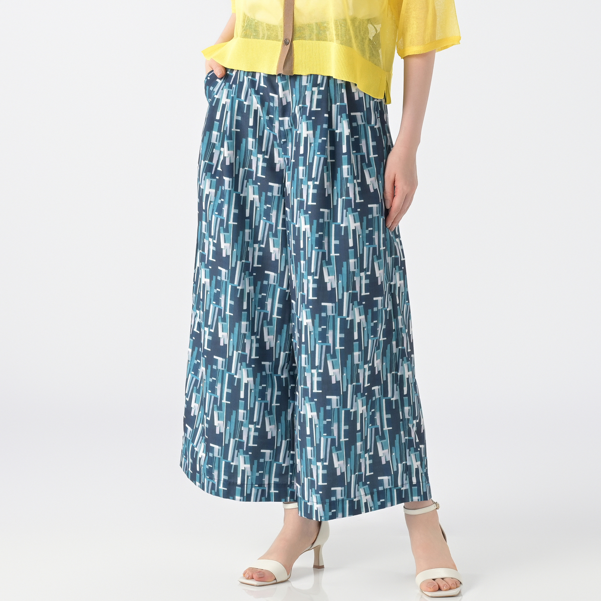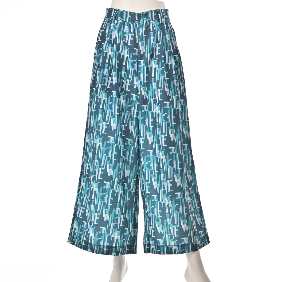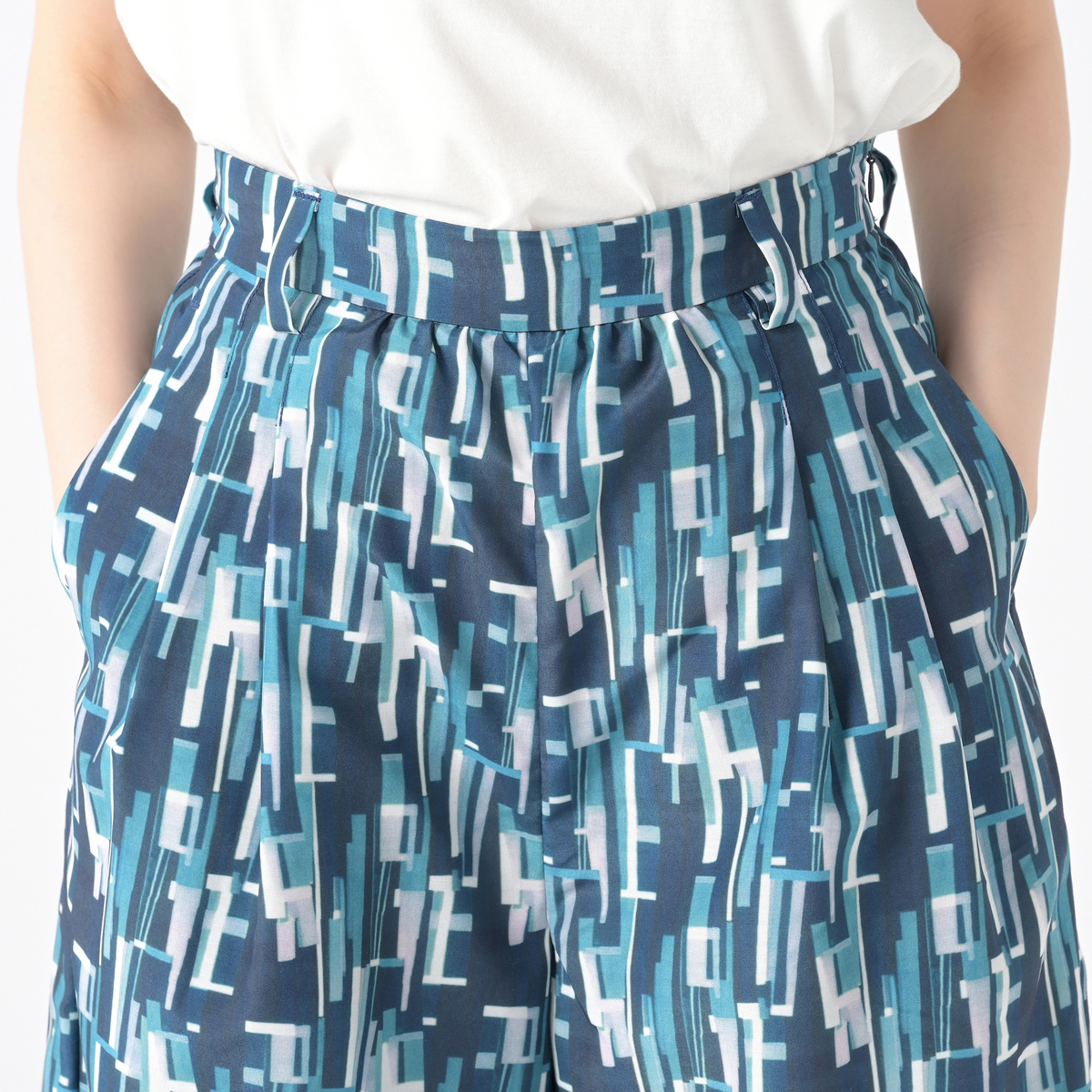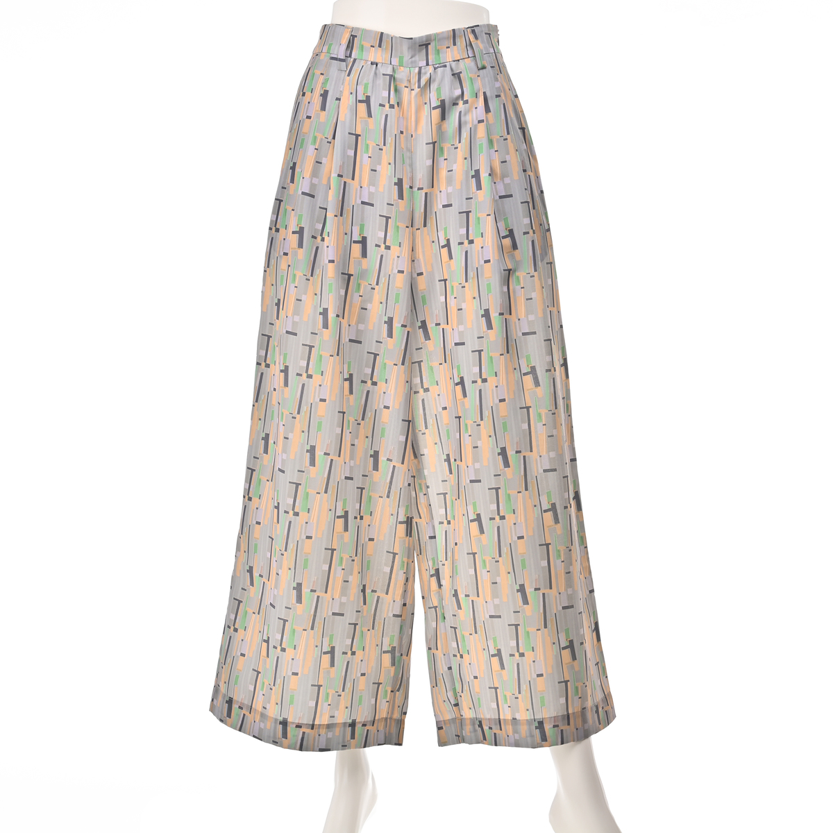 オリジナルの幾何学調プリントが目を引くワイドシルエットのパンツ。ゆったりとしたデザインで、ウエスト後ろは中心にギャザーを寄せた平ゴム入り。左脇のファスナーで着脱も簡単です。前身頃にはタックを入れて、動きのある表情に仕上げています
