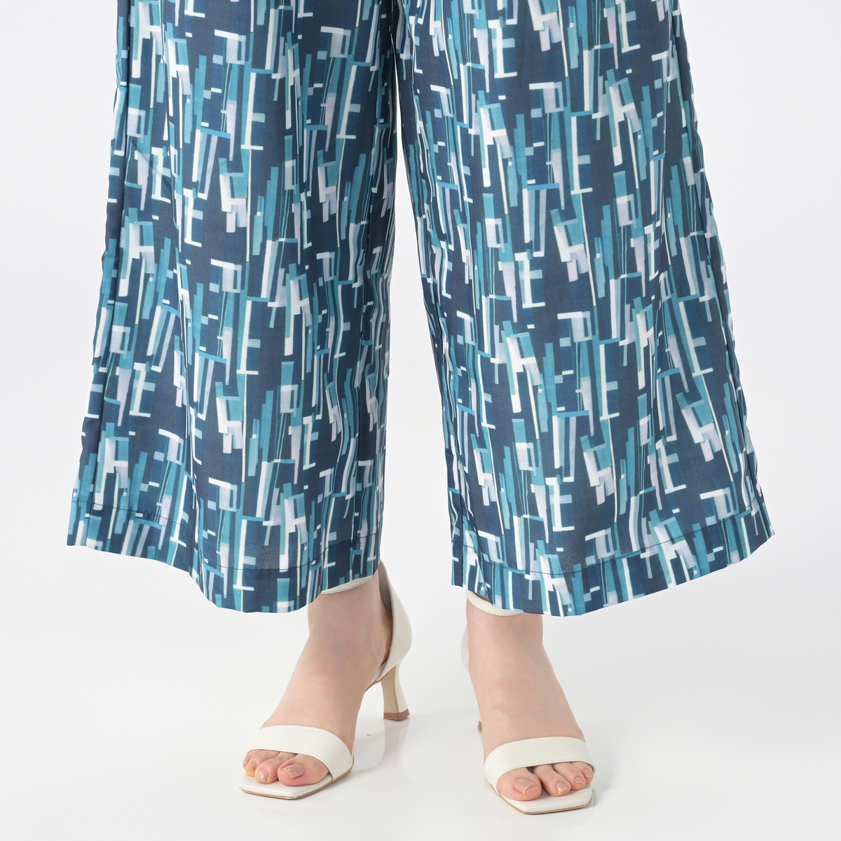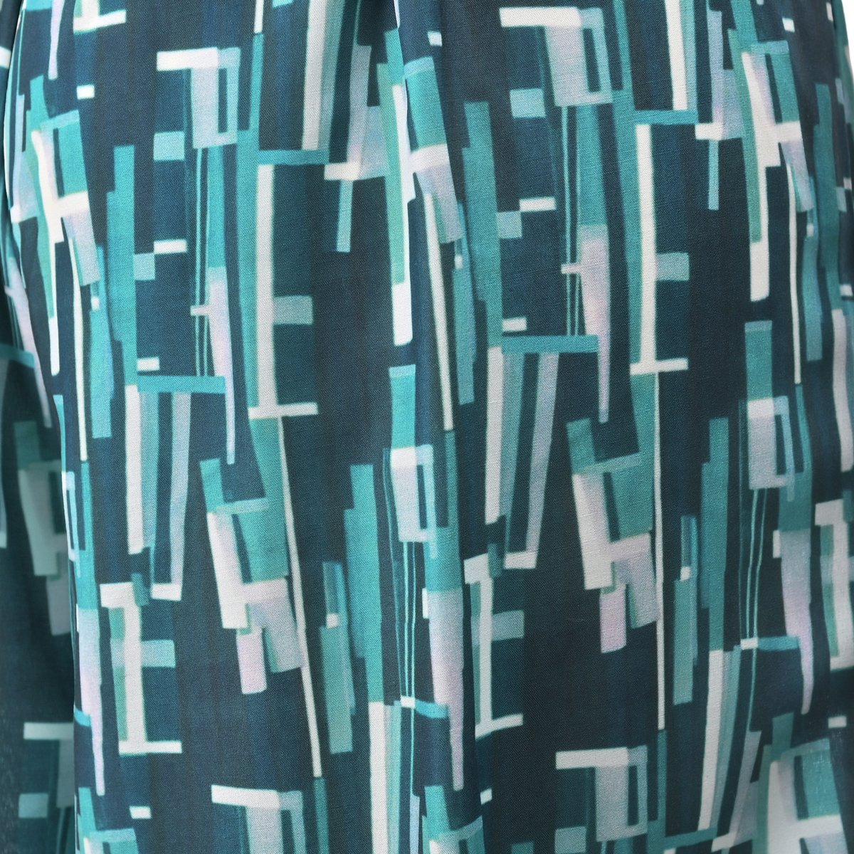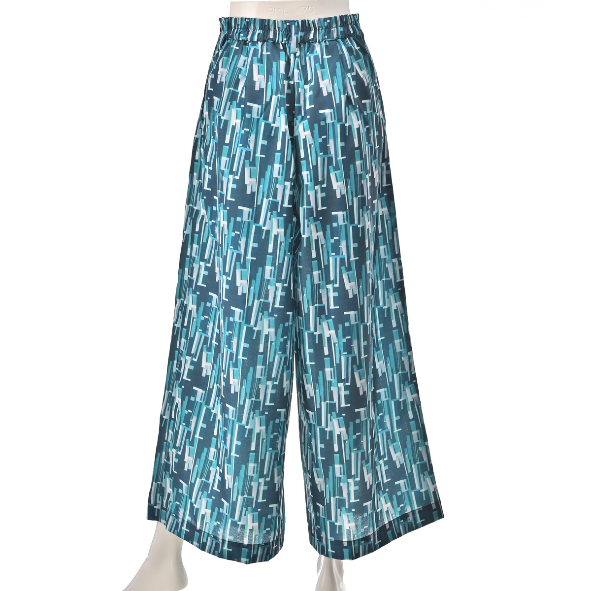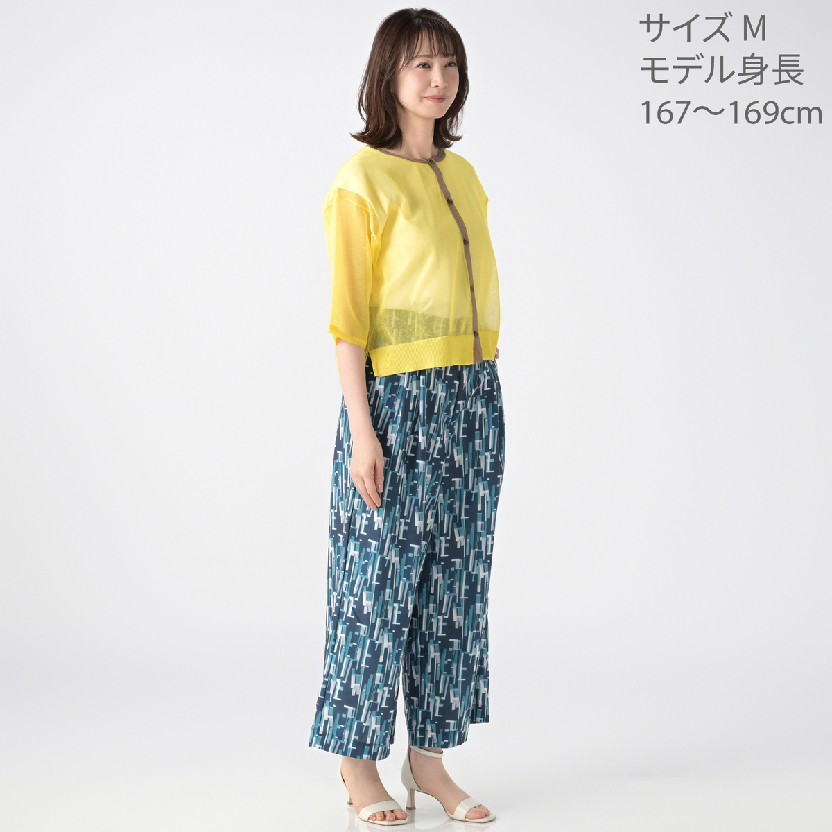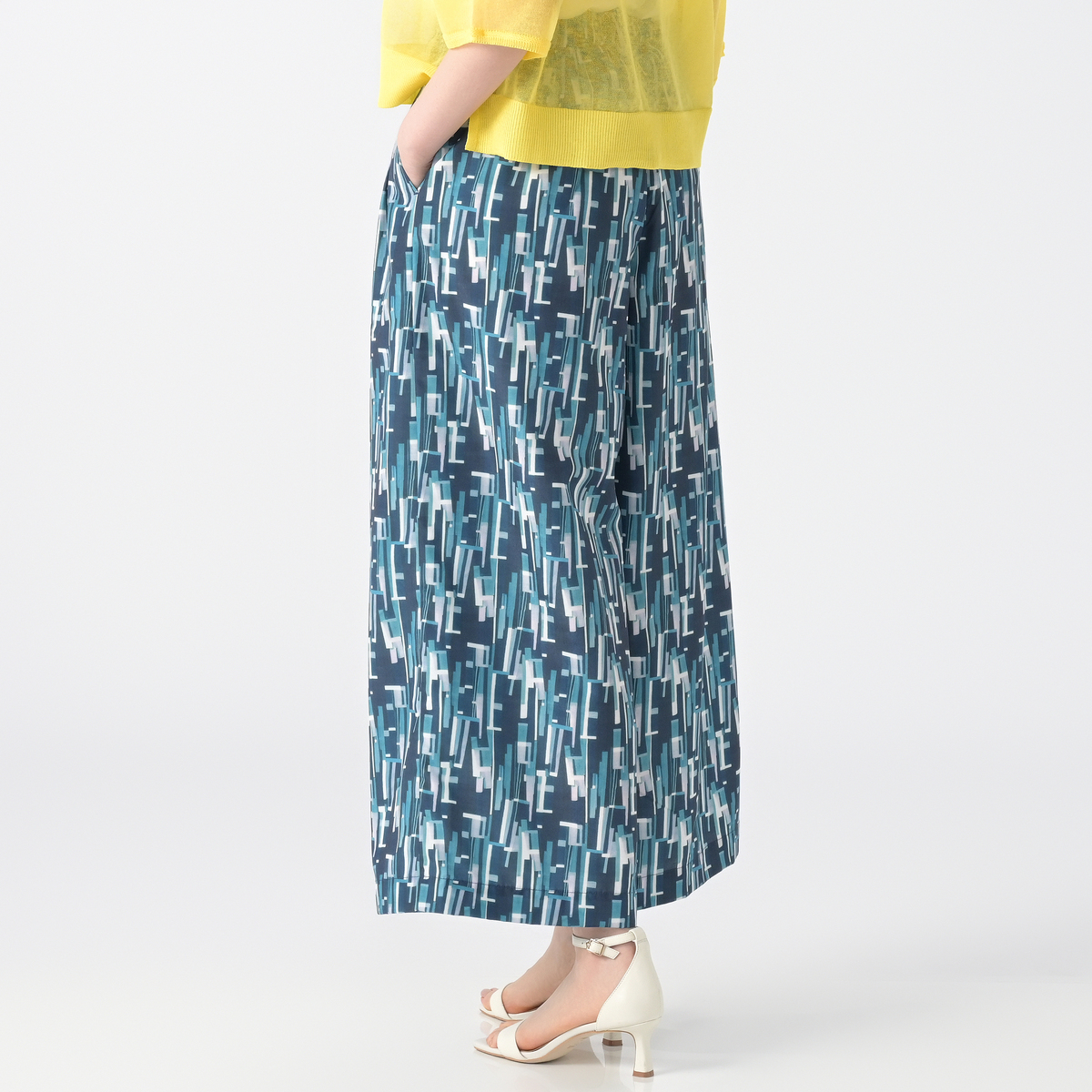 オリジナルの幾何学調プリントが目を引くワイドシルエットのパンツ。ゆったりとしたデザインで、ウエスト後ろは中心にギャザーを寄せた平ゴム入り。左脇のファスナーで着脱も簡単です。前身頃にはタックを入れて、動きのある表情に仕上げています