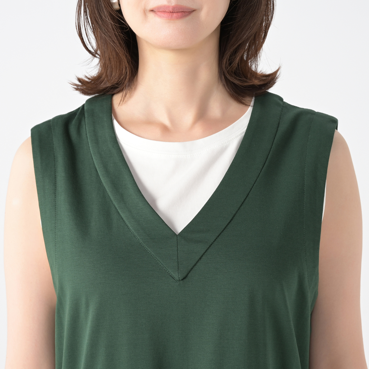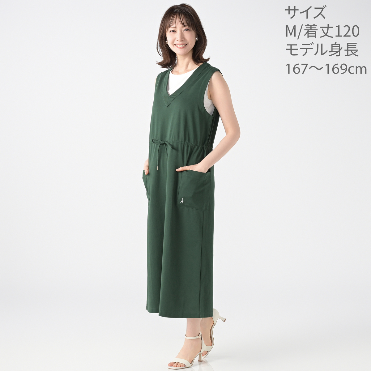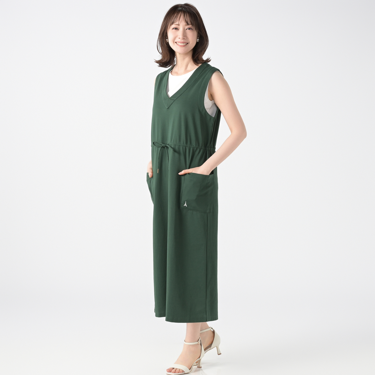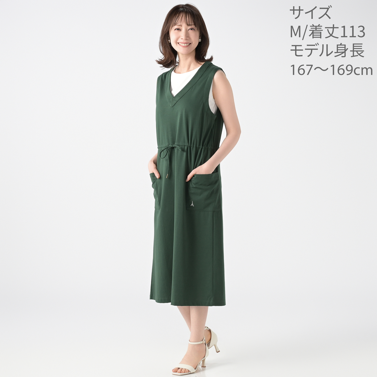ワンピースには適度な肉感とハリ感のあるストレッチポンチ、インナータンクには適度な伸縮性のあるスムース素材を使用。どちらも綿高混率のカットソー素材です