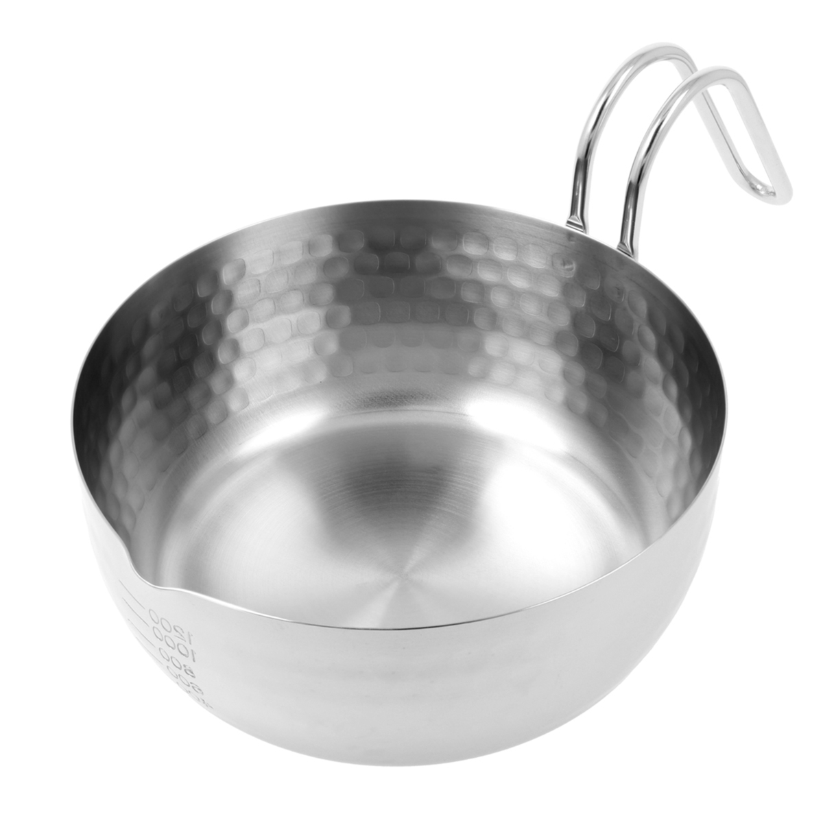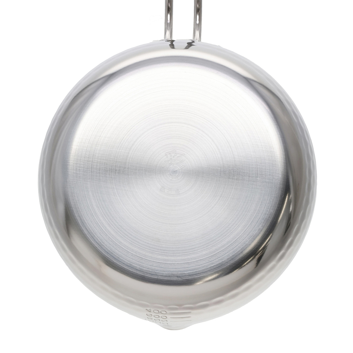 フチ巻きを行わず、切りっぱなしのフチを切削加工することで、注ぎ口からスムーズに汁を注ぐことができ、液だれしにくい仕様に。ハンドルが湾曲した形状のマルチポットタイプで、ハンドル正面に注ぎ口を設けることで、簡単に注げます。さらに、ハンドル正面にメモリが付いていて、調理しやすいです