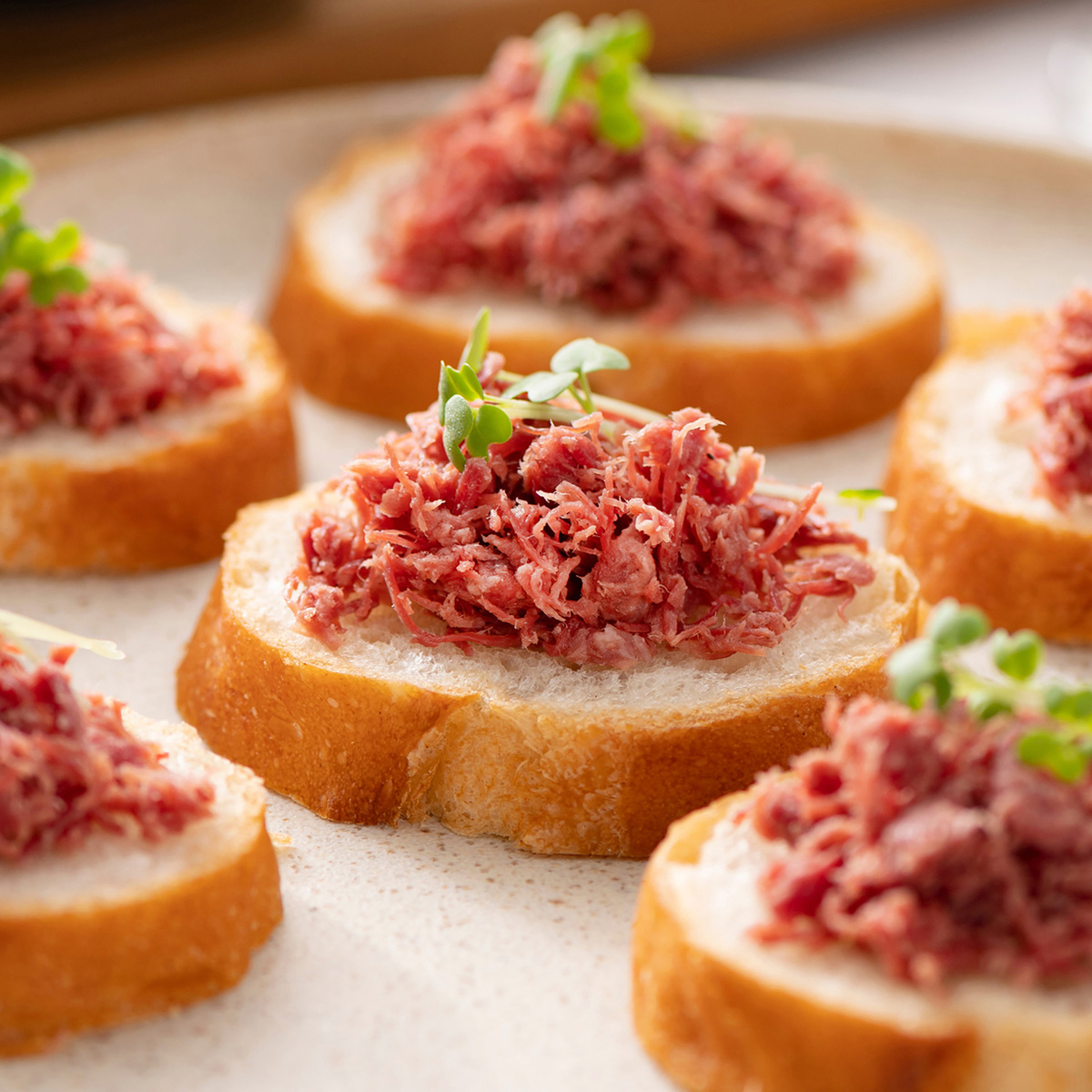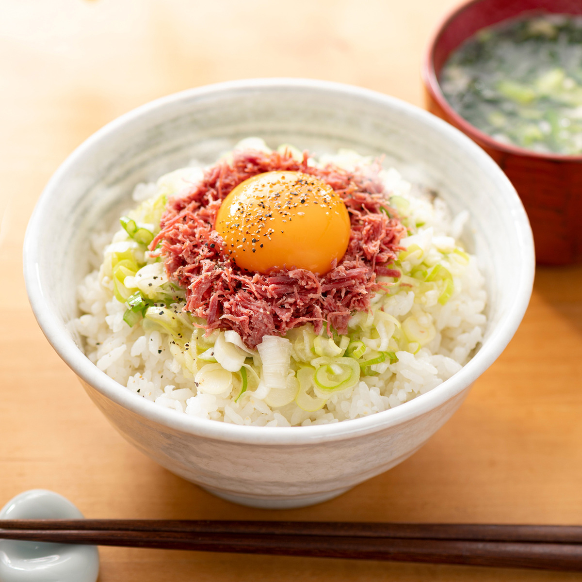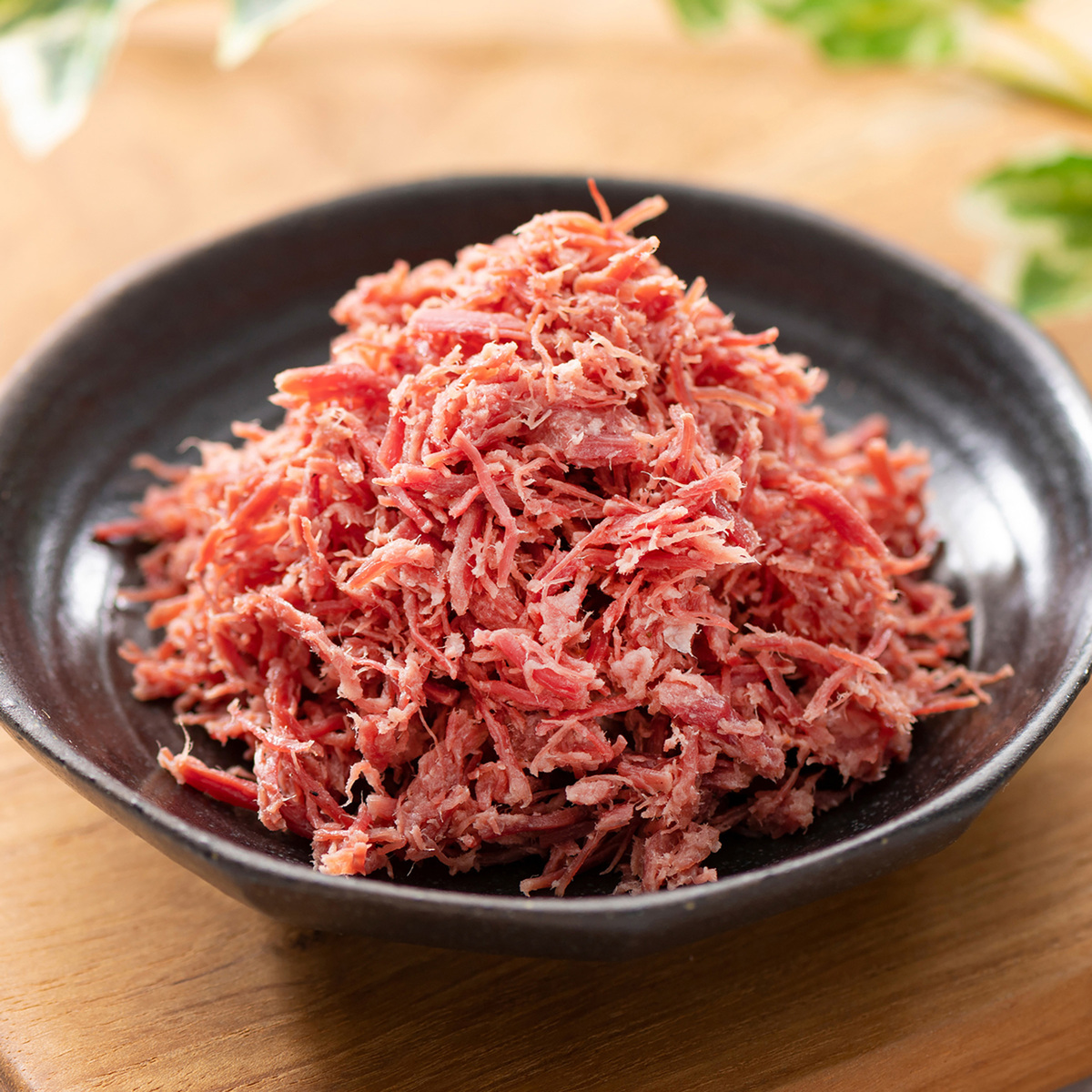 牛肉を塩漬け、ボイルし、余計な脂や灰汁を落として、手で丁寧にほぐしています。手ほぐしすることで、一つひとつのほぐし身で大きく食べ応えがあり、噛むほどに素材の旨みを感じやすいサイズに。さらに、独自の香辛料で味付けしています