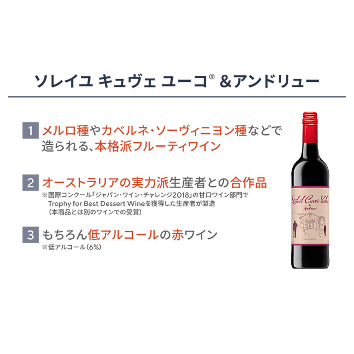 [アレルギー物質特定原材料8品目] なし [セット内容]以下よりお選びください。 ・プレステージ8(各750ml) ソレイユ キュヴェ ユーコ ワインプレステージ×8本 ソレイユ キュヴェ ユーコ ワイン&アンドリュー ・プレ4スパ2白2(各750ml) ソレイユ キュヴェ ユーコ ワインプレステージ×4本 ソレイユ キュヴェ ユーコ ワインスパークリング×2本 ソレイユ キュヴェ ユーコ ワインホワイト750ml×2本 ソレイユ キュヴェ ユーコ ワイン&アンドリュー ・プレ4スパ1白1ロゼ1ライトリー1(各750ml) ソレイユ キュヴェ ユーコ ワインプレステージ×4本 ソレイユ キュヴェ ユーコ ワインスパークリング ソレイユ キュヴェ ユーコ ワインホワイト ソレイユ キュヴェ ユーコ ワインライトリーホワイト ソレイユ キュヴェ ユーコ ワインライトリーロゼ ソレイユ キュヴェ ユーコ ワイン&アンドリュー [ぶどう品種] スパークリング:ランブルスコ サラミーノ、ランブルスコ マラーニ ホワイト:モスカート・ビアンコ主体、シャルドネ スパークル ホワイト:モスカート主体 スパークル ロゼ:マスカット・ゴールド主体、シラーズ [アルコール度数] 6% [保存方法] 開封前:直射日光や強い光、高温多湿を避けて冷暗所で保存します 開封後:開封後はお早めにお召し上がりください [注意事項] ※飲酒は20歳になってから ※妊娠中や授乳期の飲酒は、胎児・乳児の発育に悪影響を与えるおそれがあります ※ワインの成分が沈殿し、おりが生じる場合がありますが、品質には問題ありません <ソレイユ キュヴェ ユーコ スパークリング/ソレイユ キュヴェ ユーコ ライトリー スパークル ホワイト/ソレイユ キュヴェ ユーコ ライトリー スパークル ロゼ> ※開封前は、瓶を揺すらないでください ※吹きこぼれ防止のため、十分に冷やしてから開栓してください ※スパークリングワインは、開栓時ガス圧により中身がこぼれることがあります [原産国] プレステージ:フランス スパークリング:イタリア ホワイト、ライトリーホワイト、ロゼ、アンドリュー:オーストラリア [原材料] ソレイユ キュヴェ ユーコ プレステージ: ぶどう/酸化防止剤(亜硫酸塩)、二炭酸ジメチル ソレイユ キュヴェ ユーコ スパークリング: ぶどう(ランブルスコ サラミーノ、ランブルスコ マラーニ)/酸化防止剤(亜硫酸塩) 炭酸ガス含有 ソレイユ キュヴェ ユーコ プレステージ ホワイト: ぶどう(モスカート・ビアンコ主体、シャルドネ)/酸化防止剤(亜硫酸塩、V.C) ソレイユ キュヴェ ユーコ ライトリー スパークル ホワイト: ぶどう(モスカート主体)/酸化防止剤(亜硫酸塩、V.C)、二炭酸ジメチル 炭酸ガス含有 ソレイユ キュヴェ ユーコ ライトリー スパークル ロゼ: ぶどう(マスカット・ゴールド主体、シラーズ)/酸化防止剤(亜硫酸塩、V.C)、二炭酸ジメチル 炭酸ガス含有 ソレイユ キュヴェ ユーコ&アンドリュー: ぶどう/酸化防止剤(亜硫酸塩)、二炭酸ジメチル