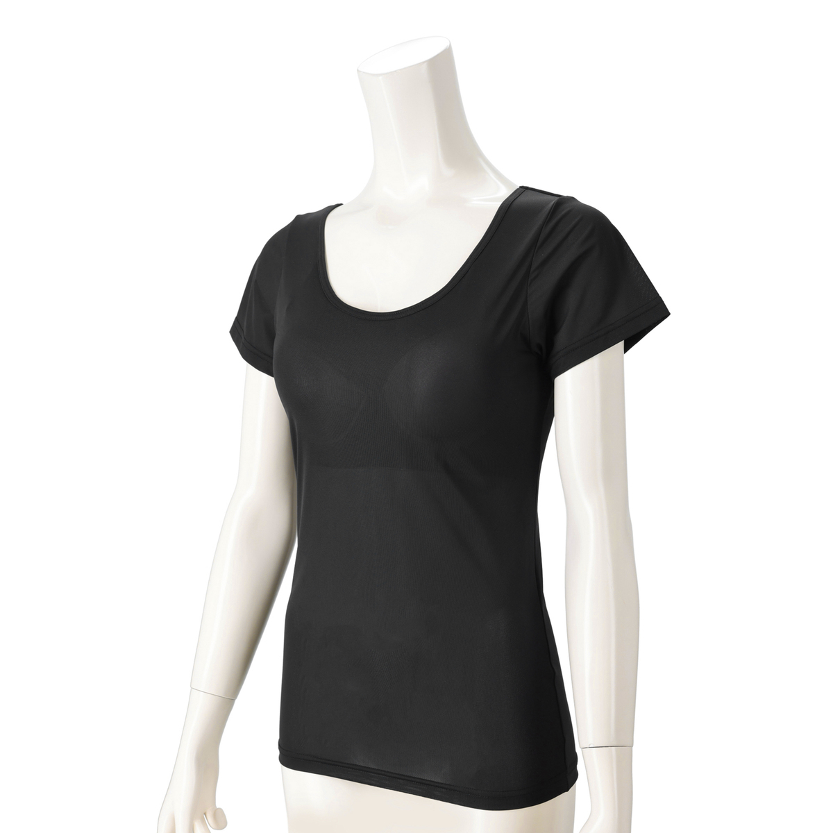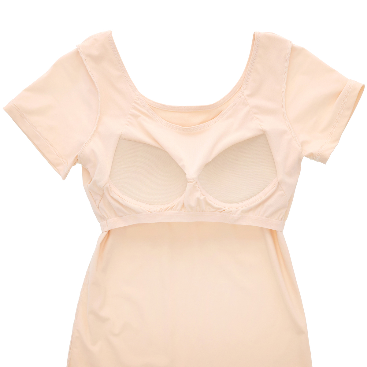 メッシュ素材を使用したカップ付きフレンチスリーブインナー。キシリトール加工を施した素材による清涼感ある着心地で、ブラなしで1枚でさらりとご着用いただけます。内側のカップのアンダー部分にはぐるりストレッチテープ付きで、動いてもカップがずれにくい仕様です