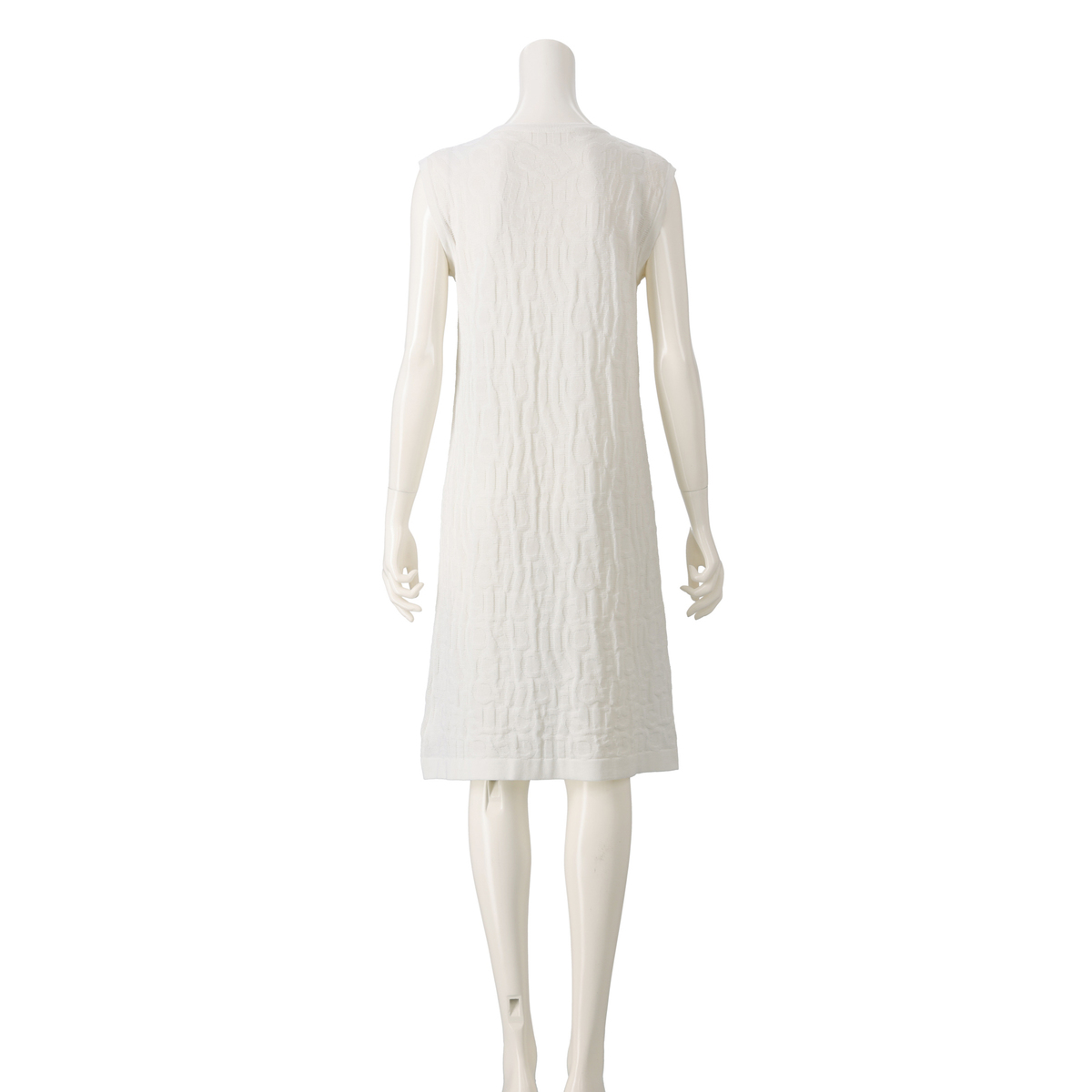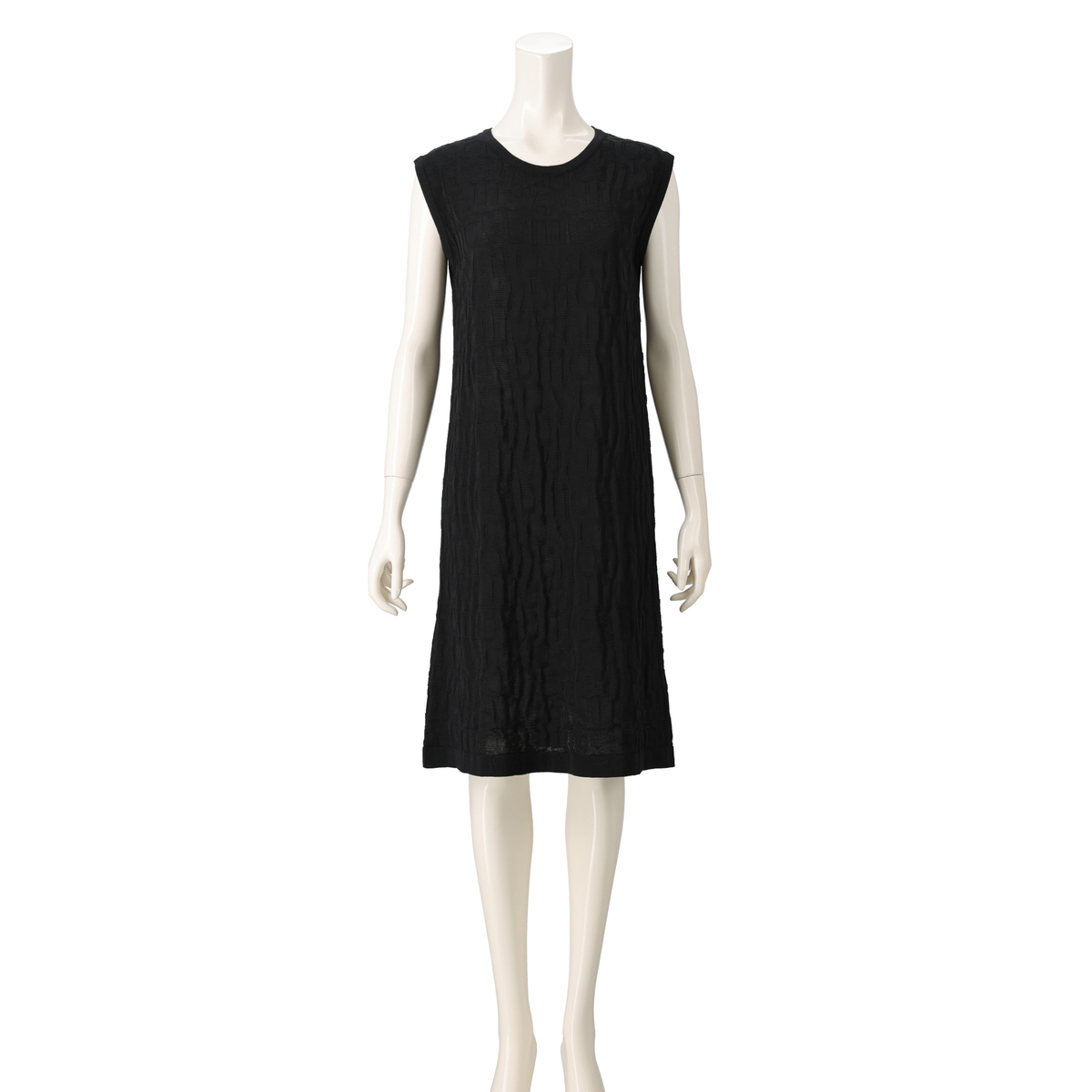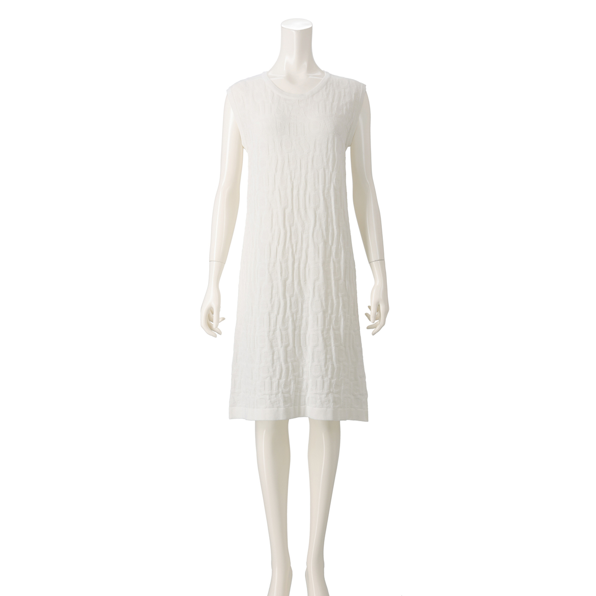 リンクス編みの地柄のワンピース。編地をしっかりとさせ、ロゴが浮き上がる様に編んでいます。頭からかぶって着るだけのシンプルなデザインで、コーディネートを上品に彩ります
