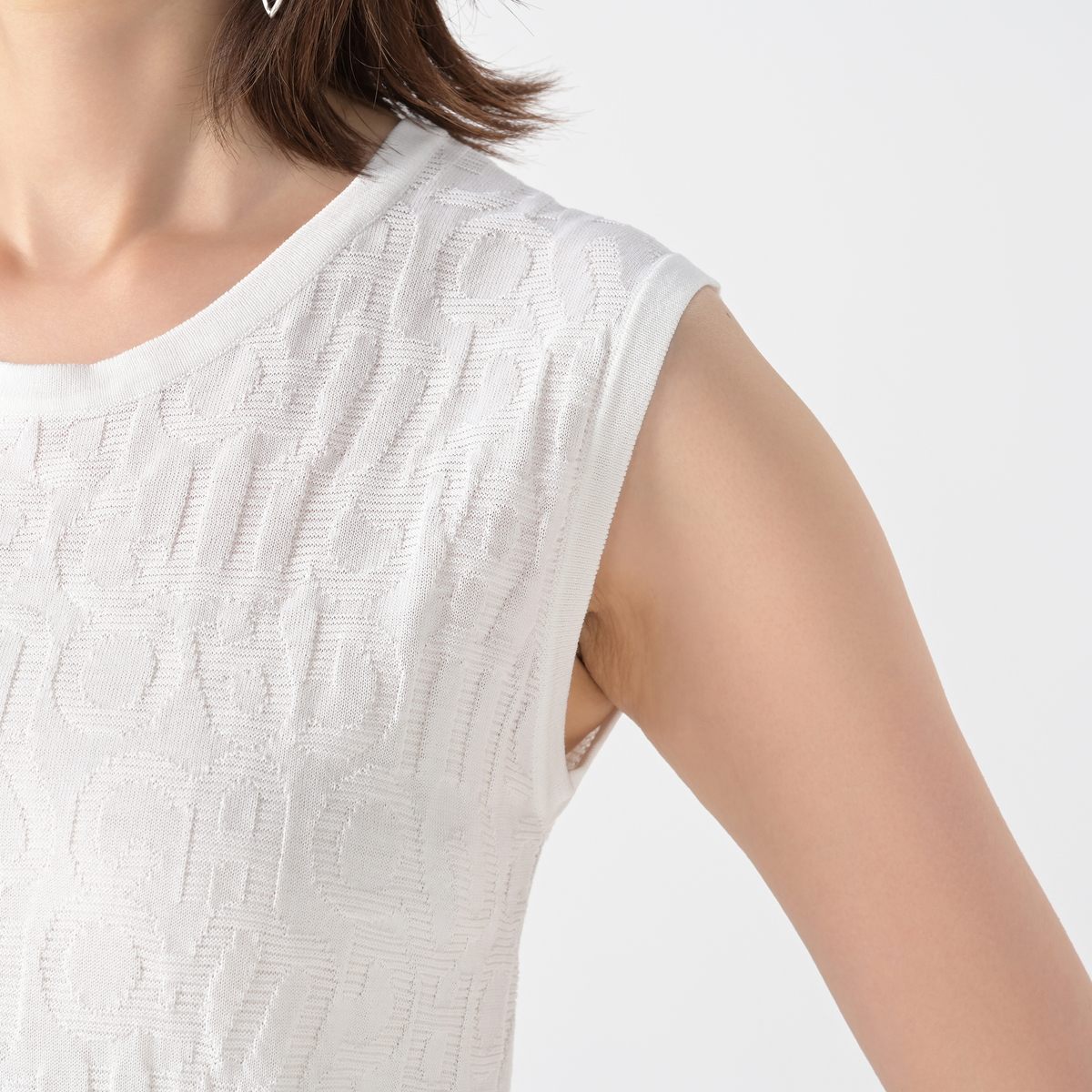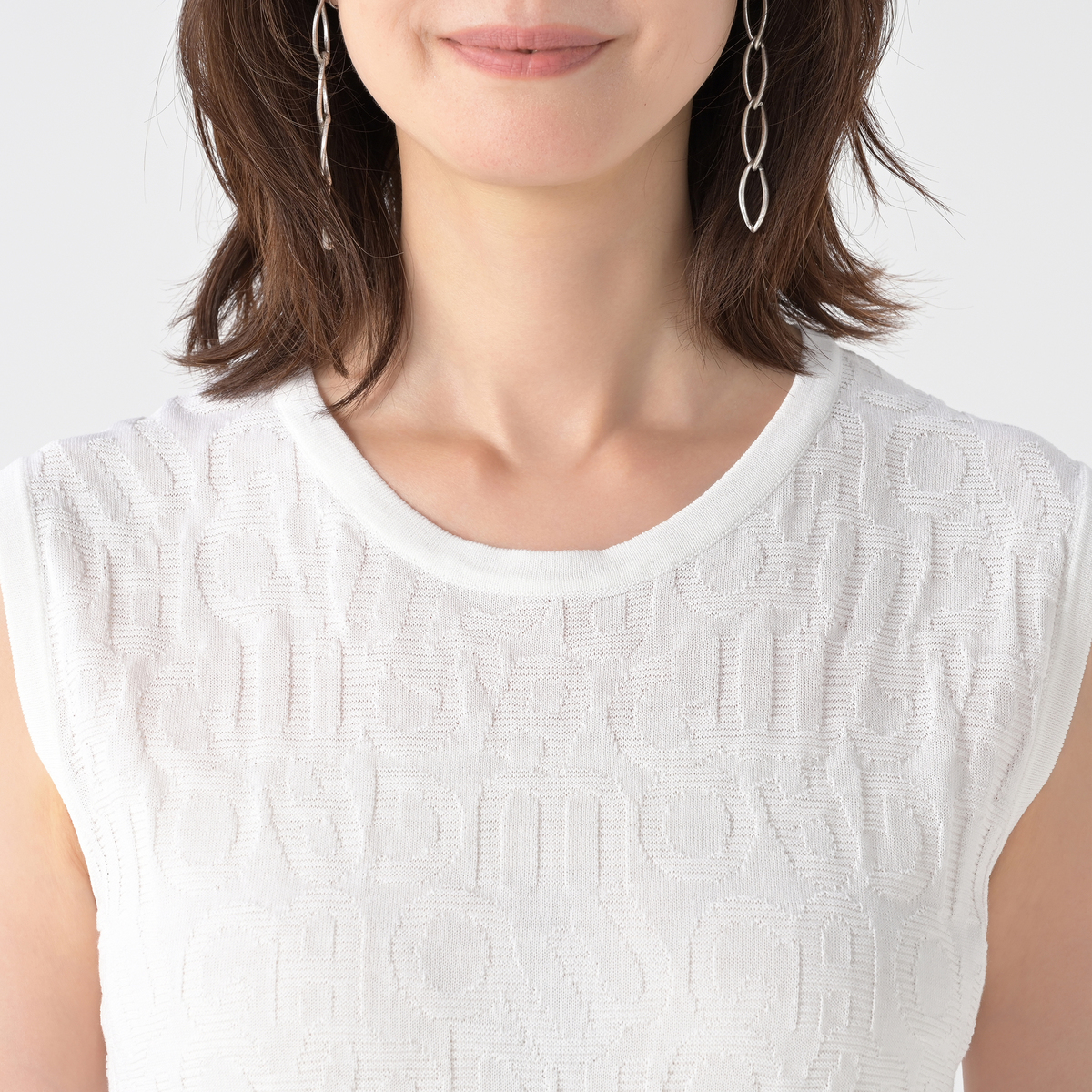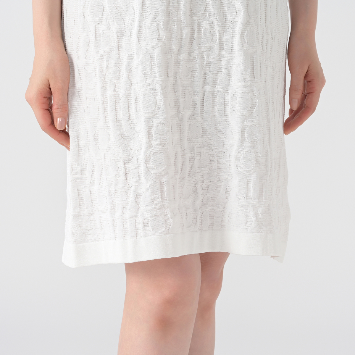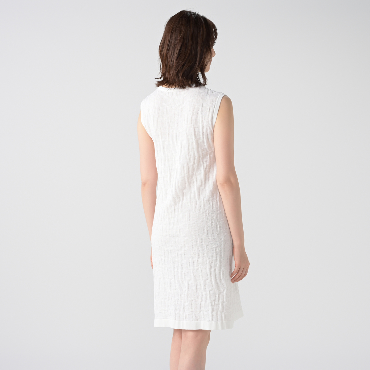 リンクス編みの地柄のワンピース。編地をしっかりとさせ、ロゴが浮き上がる様に編んでいます。頭からかぶって着るだけのシンプルなデザインで、コーディネートを上品に彩ります