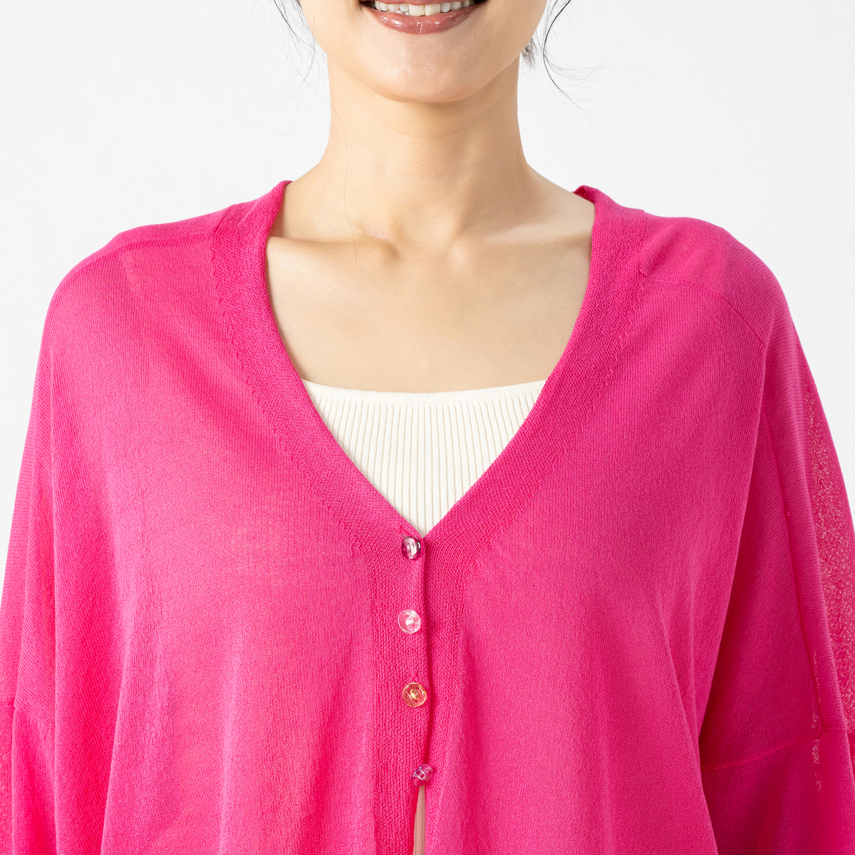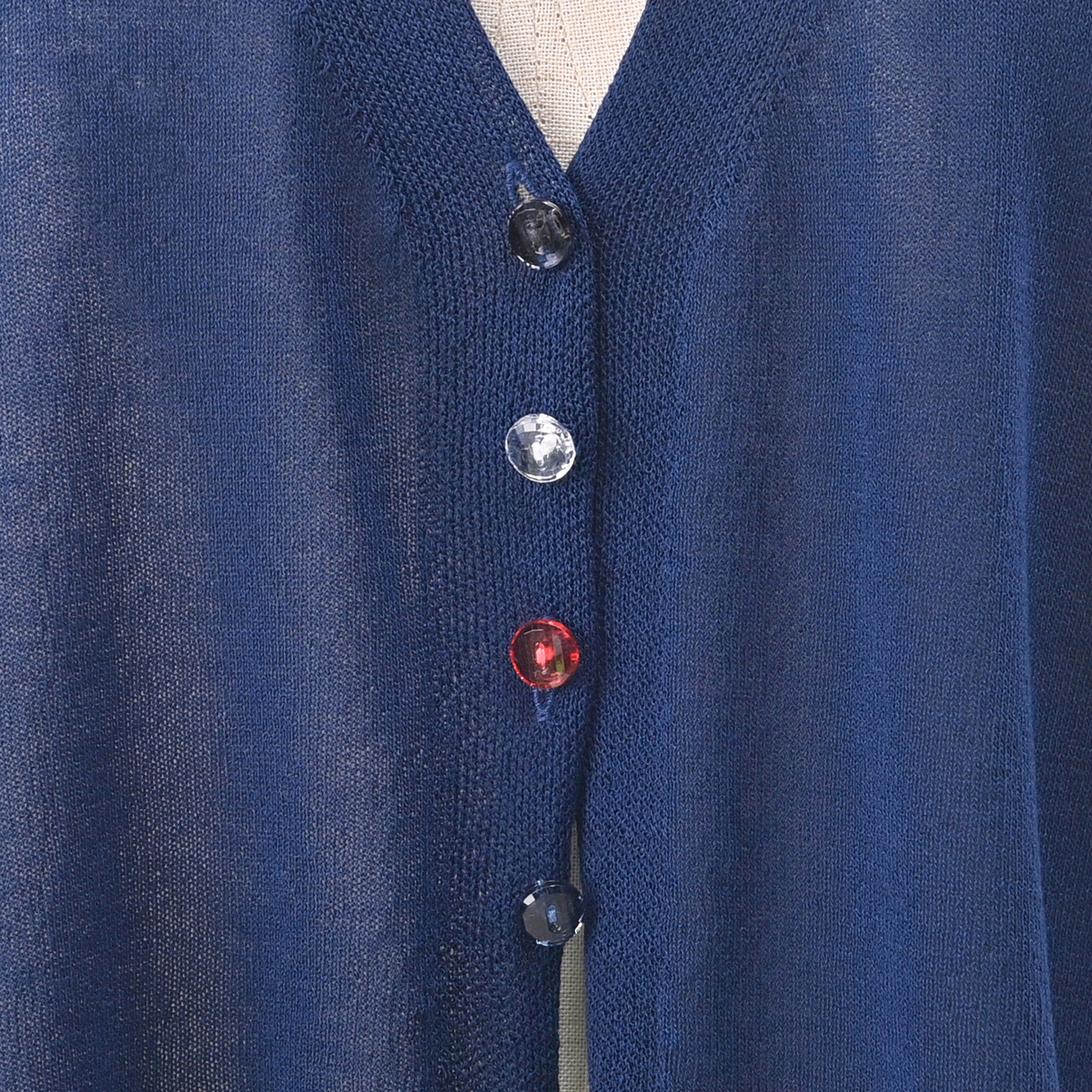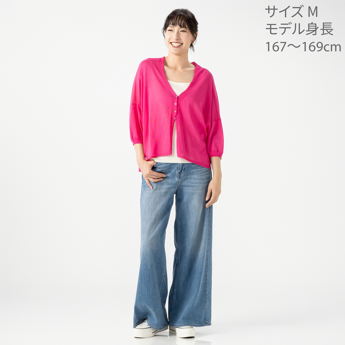 軽やかに羽織れるボレロカーディガン。フロントのカラフルなクリアボタンがアクセントになっています。第二第四ボタンは飾りボタンに。ゆったりしたドロップショルダーや前後差のあるシルエットが抜け感を生み、様々なボトムスとも好相性です