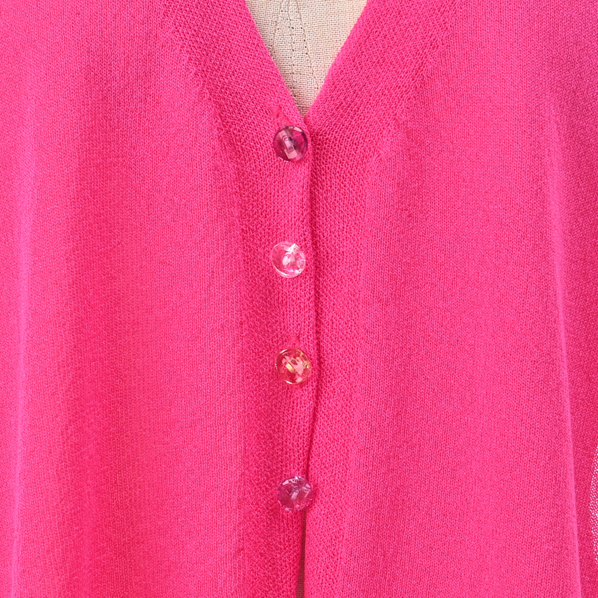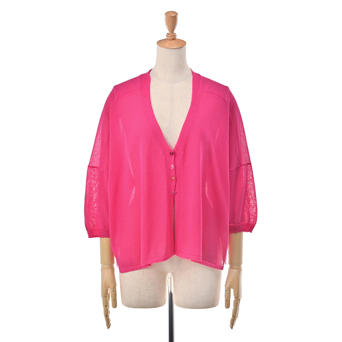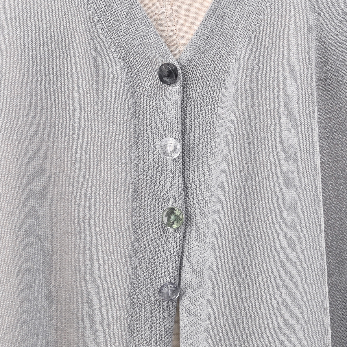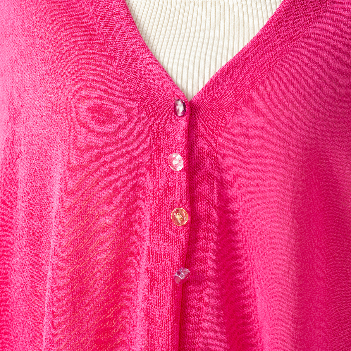 軽やかに羽織れるボレロカーディガン。フロントのカラフルなクリアボタンがアクセントになっています。第二第四ボタンは飾りボタンに。ゆったりしたドロップショルダーや前後差のあるシルエットが抜け感を生み、様々なボトムスとも好相性です