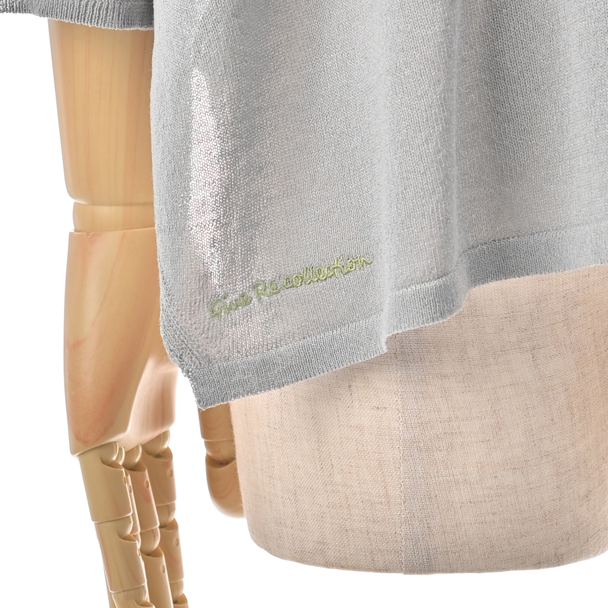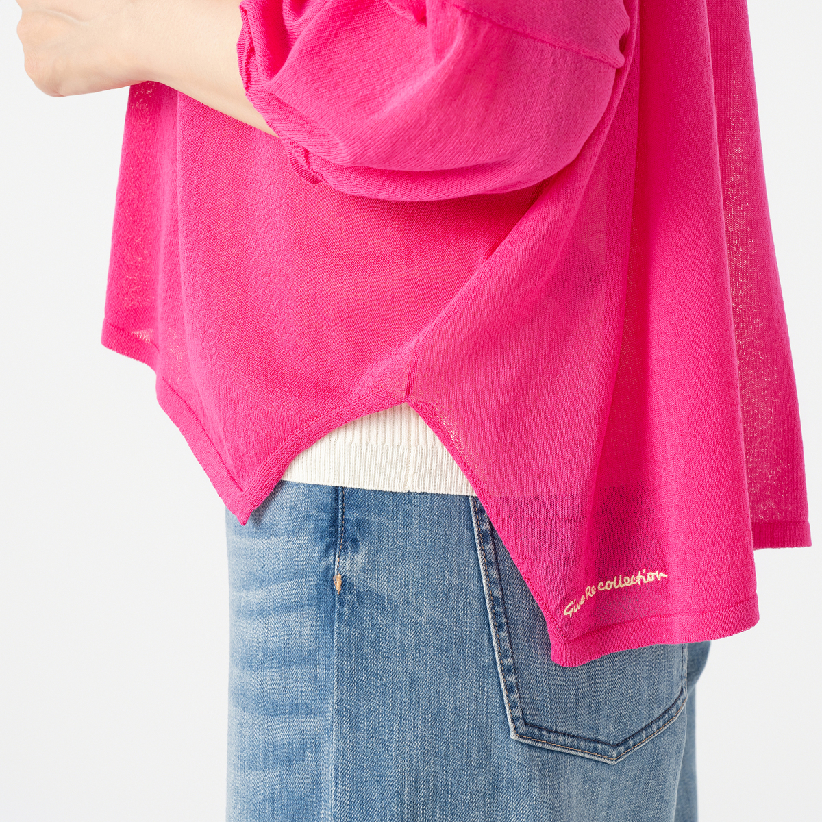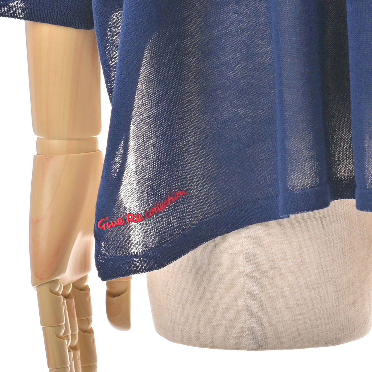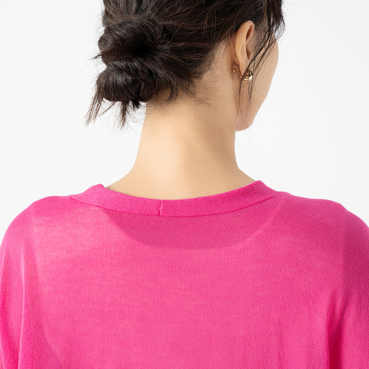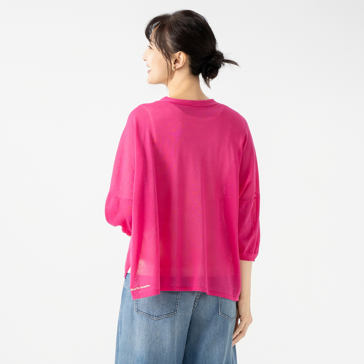 後ろ裾のロゴ刺繍がさりげなく個性を添え、シンプルなスタイリングにもアクセントを加えます。袖は肘が隠れる5〜6分丈。シャリ感のある薄手の天竺編み素材で、さらっとした軽い肌あたりも魅力です