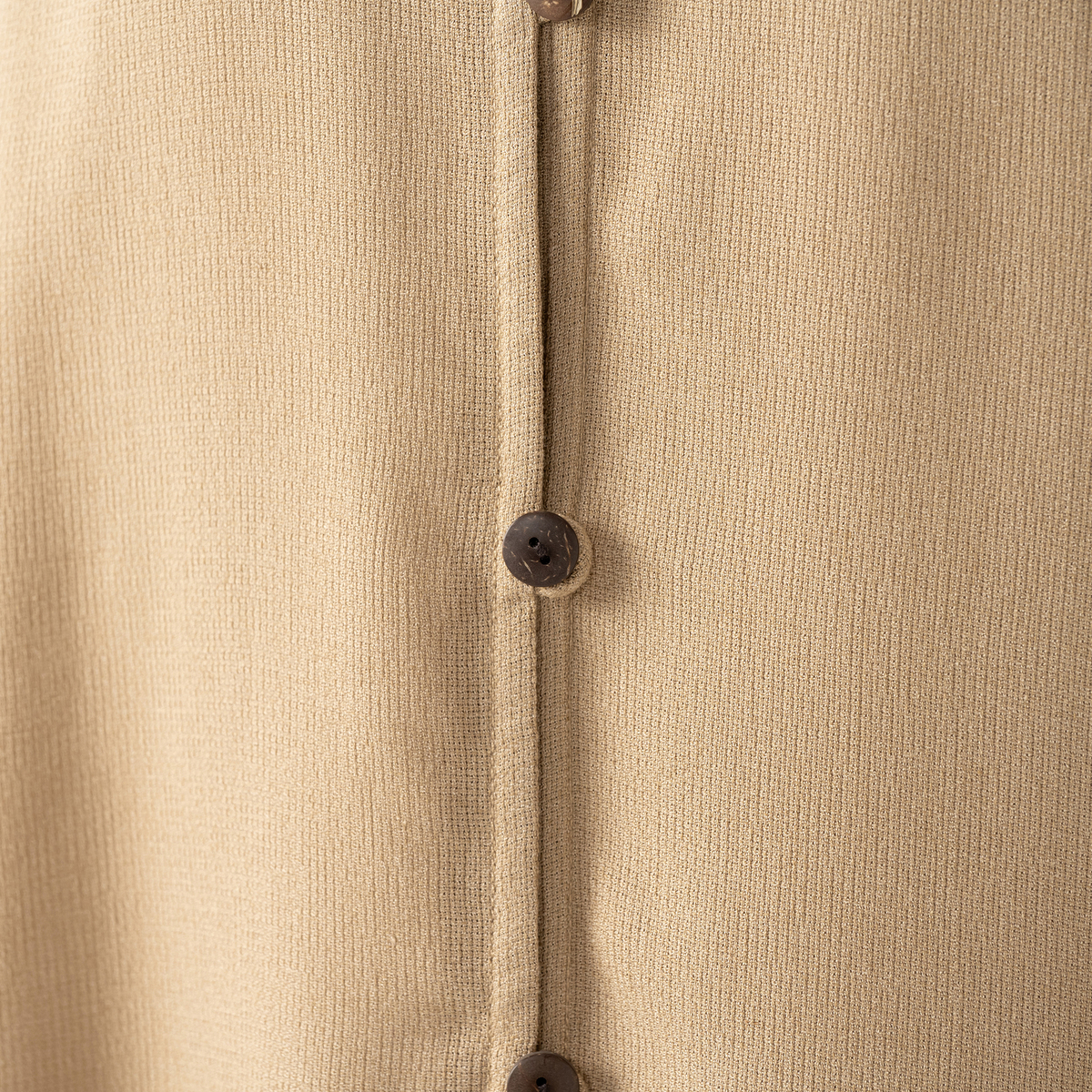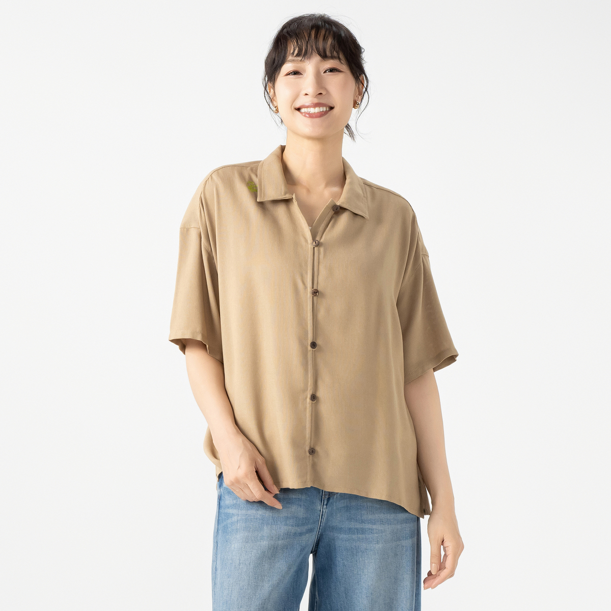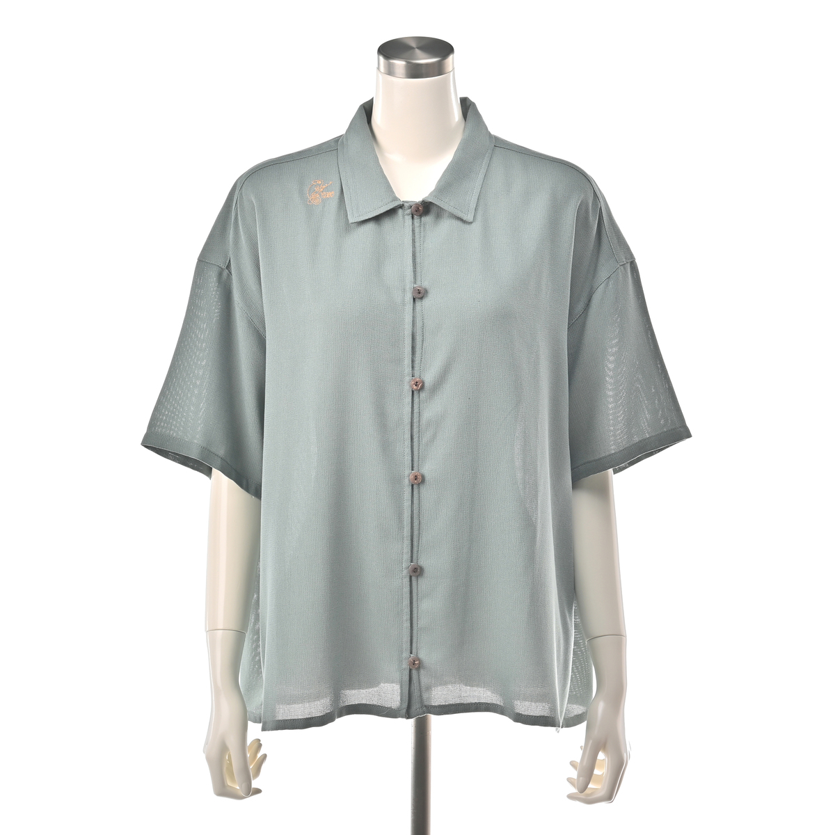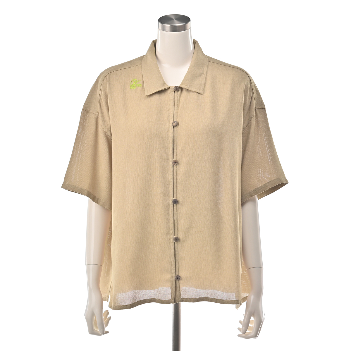 リゾート感を演出するココナッツボタンと、右肩に施したカメレオンの刺繍がポイントのシャツ。ゆったりとしたサイズ感で、短めの着丈と脇スリットが軽やかな印象を演出。前を開けて羽織としても楽しめます