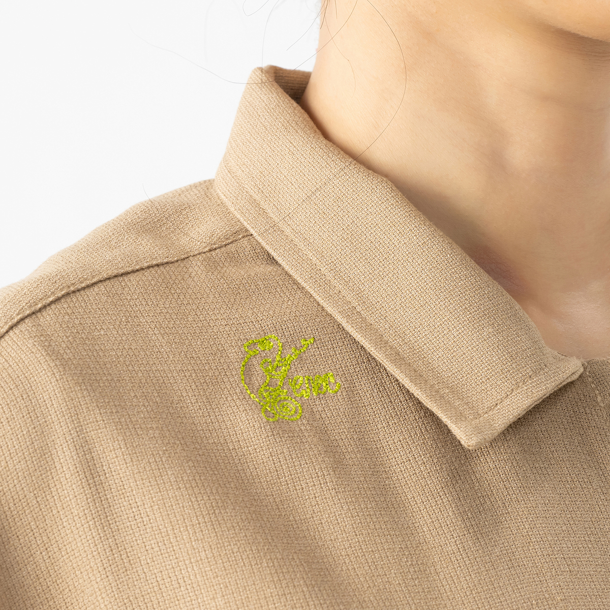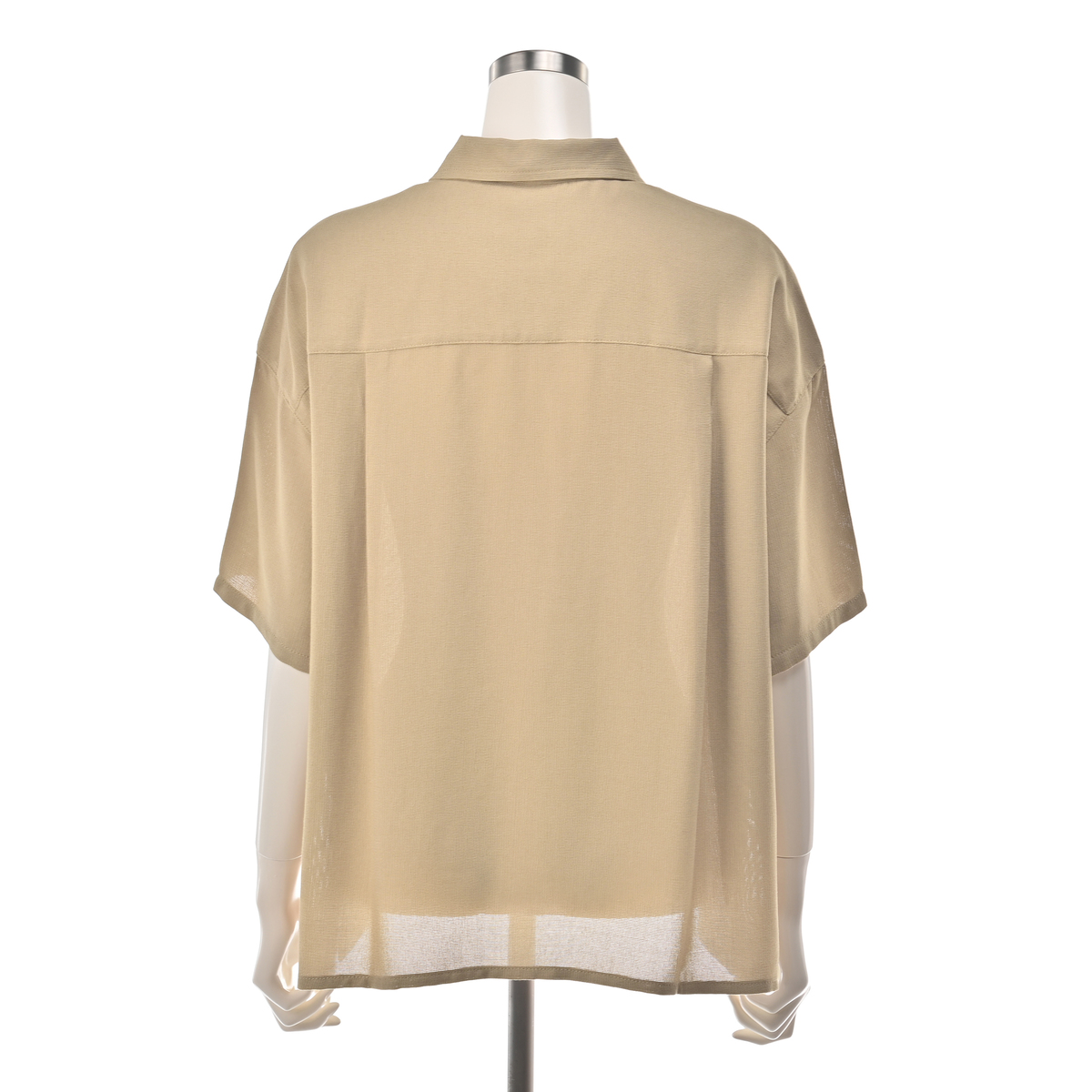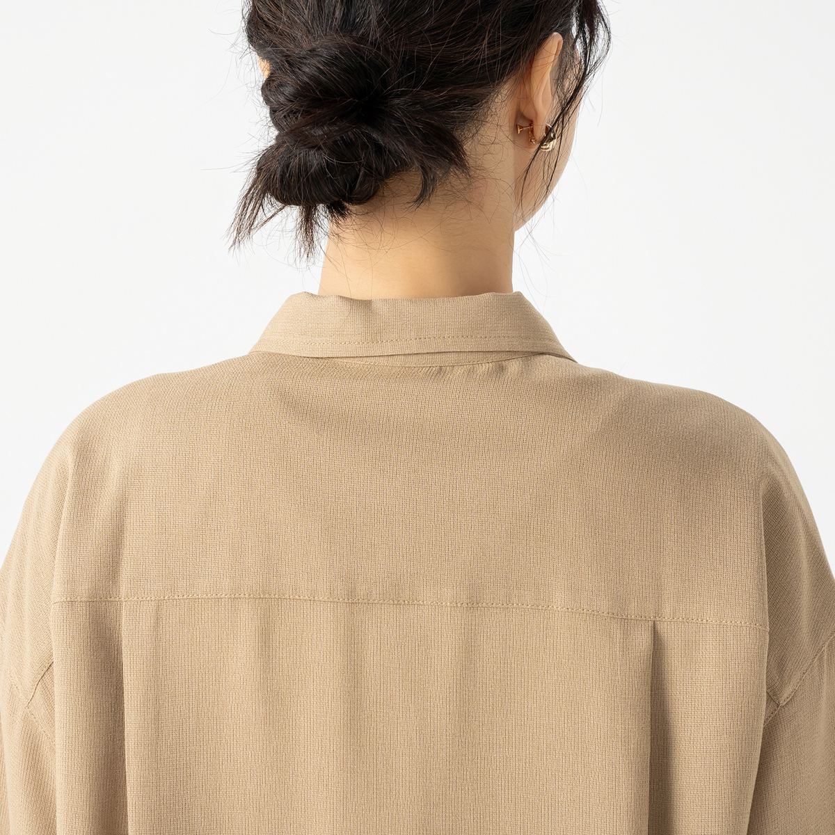 メッシュのような粗目の織感が特徴の、パナマ織風布帛生地を使用。通気性があり、レーヨン混なので肌触り滑らかで落ち感もある素材です。UVカットを備えているのもうれしいポイント。ヨーク裏にはさらりとした風合いのスレキを使用しています