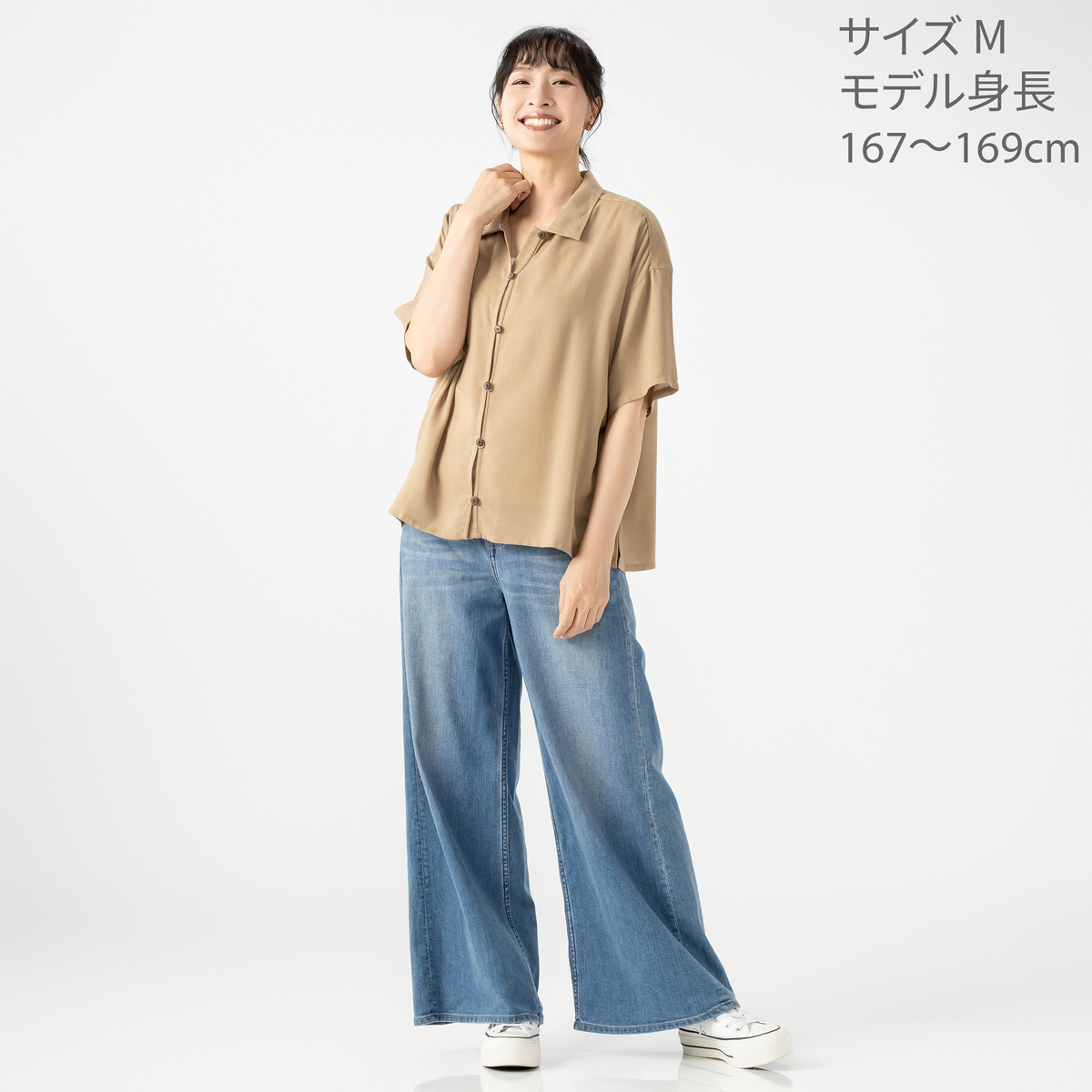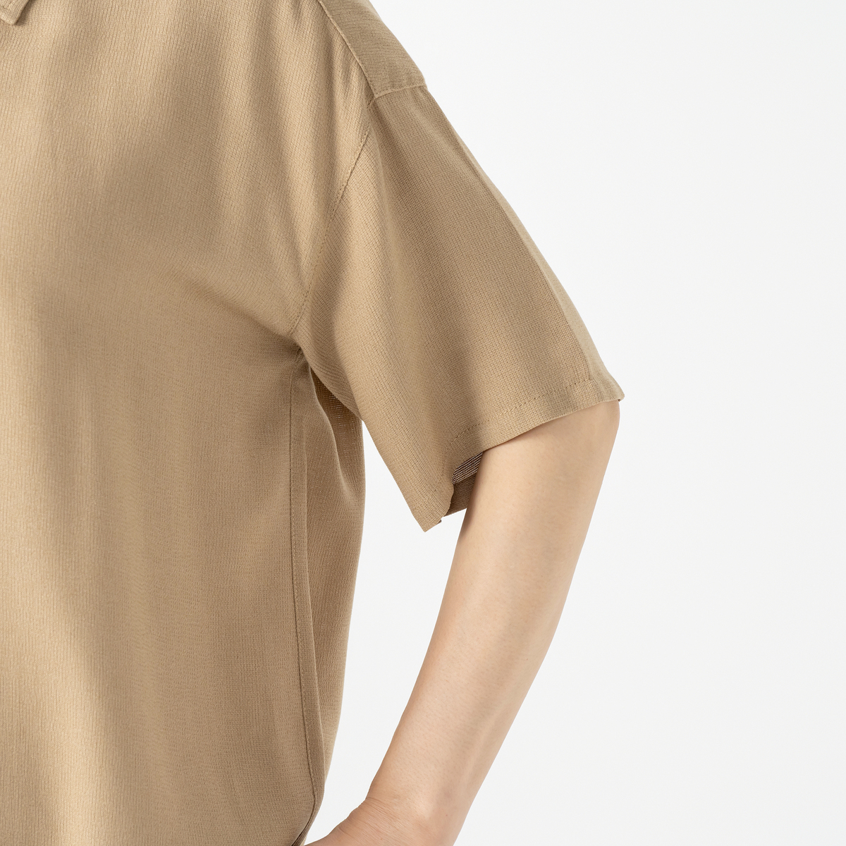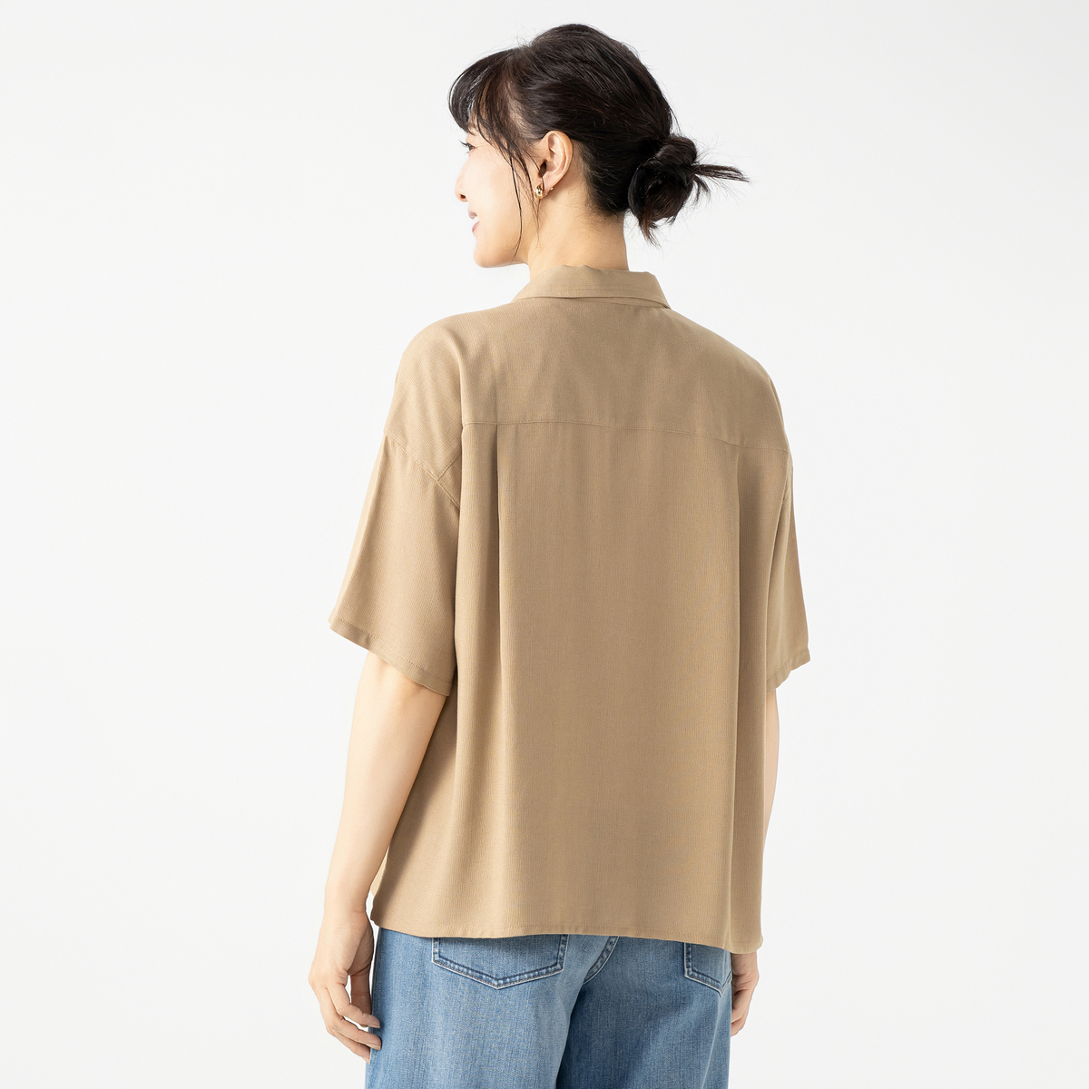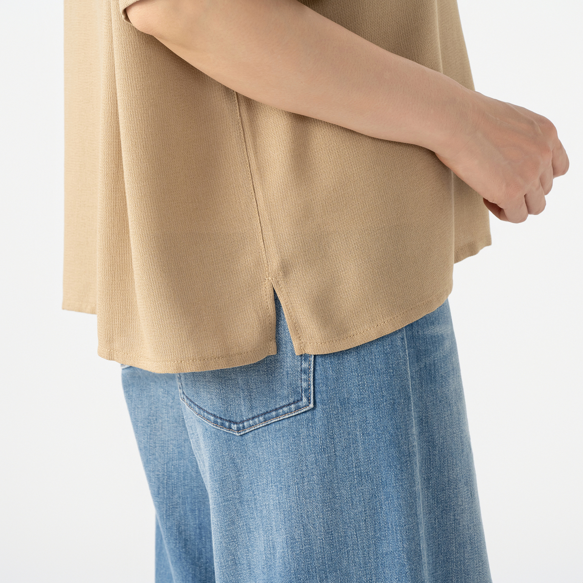 メッシュのような粗目の織感が特徴の、パナマ織風布帛生地を使用。通気性があり、レーヨン混なので肌触り滑らかで落ち感もある素材です。UVカットを備えているのもうれしいポイント。ヨーク裏にはさらりとした風合いのスレキを使用しています