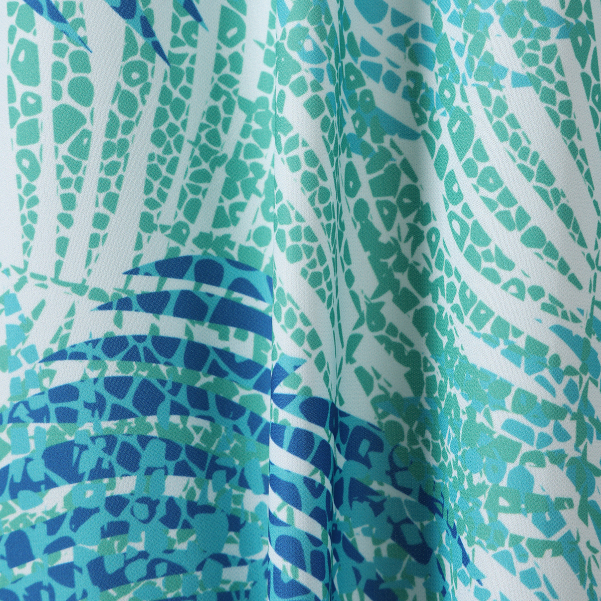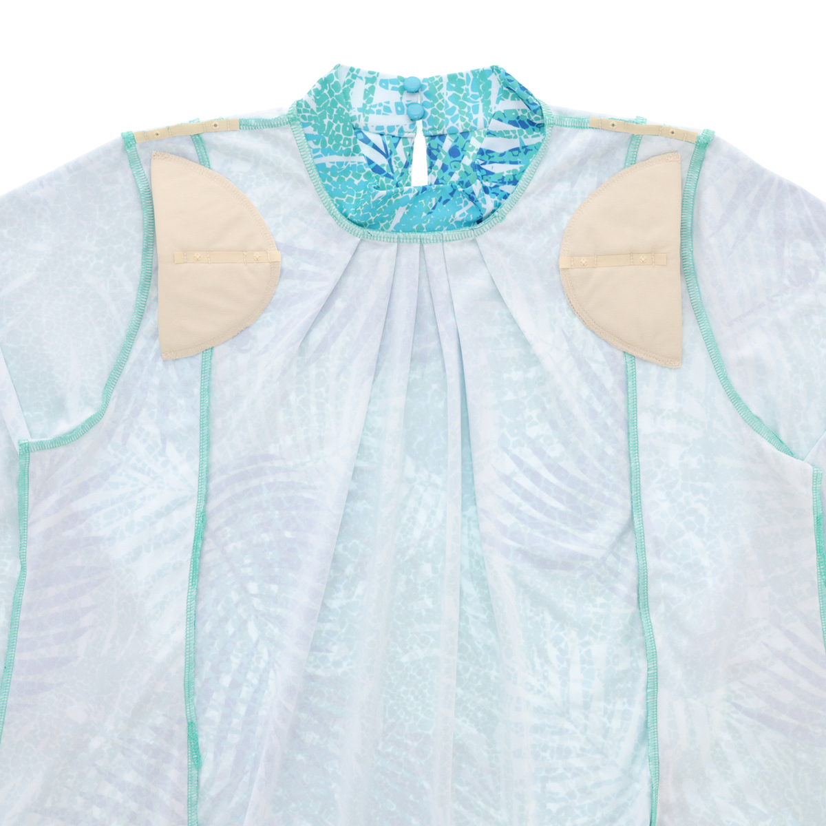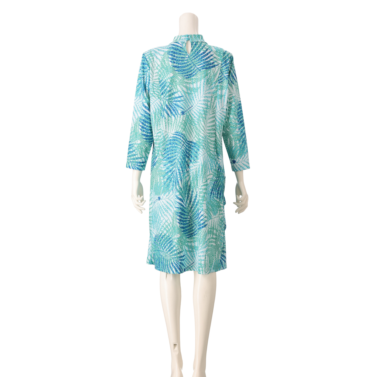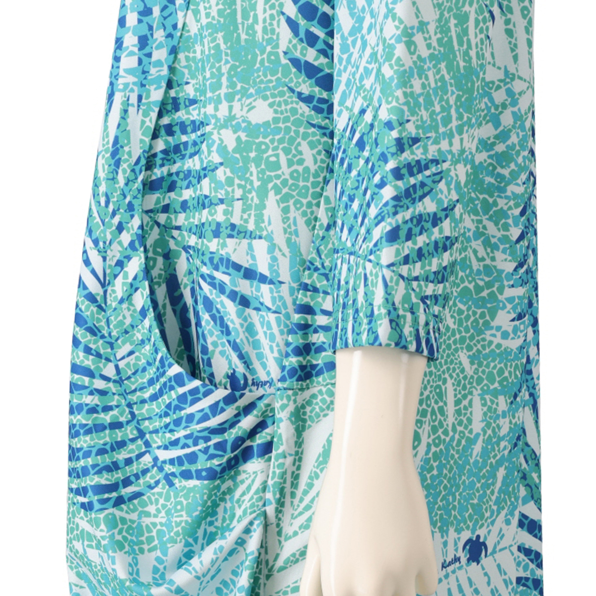 葉っぱ柄がアクセントのひざ丈ワンピース。UVカット素材を使用しました。“ナ・ニウ”はハワイにあるヤシの木の種類(ココヤシ)。葉っぱの柄をモチーフにデザインしました