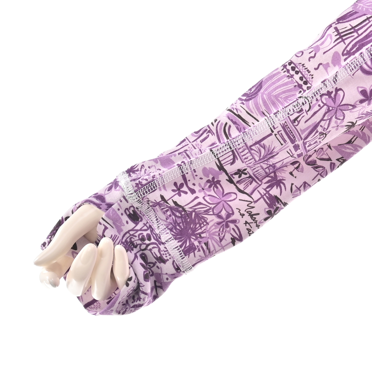 アーチ状の切替が入った袖は、長めの設計で親指が出せるサムホール付き。手の甲までカバーできるので、屋外などでのシーンにも活躍。UVカット効果もあります