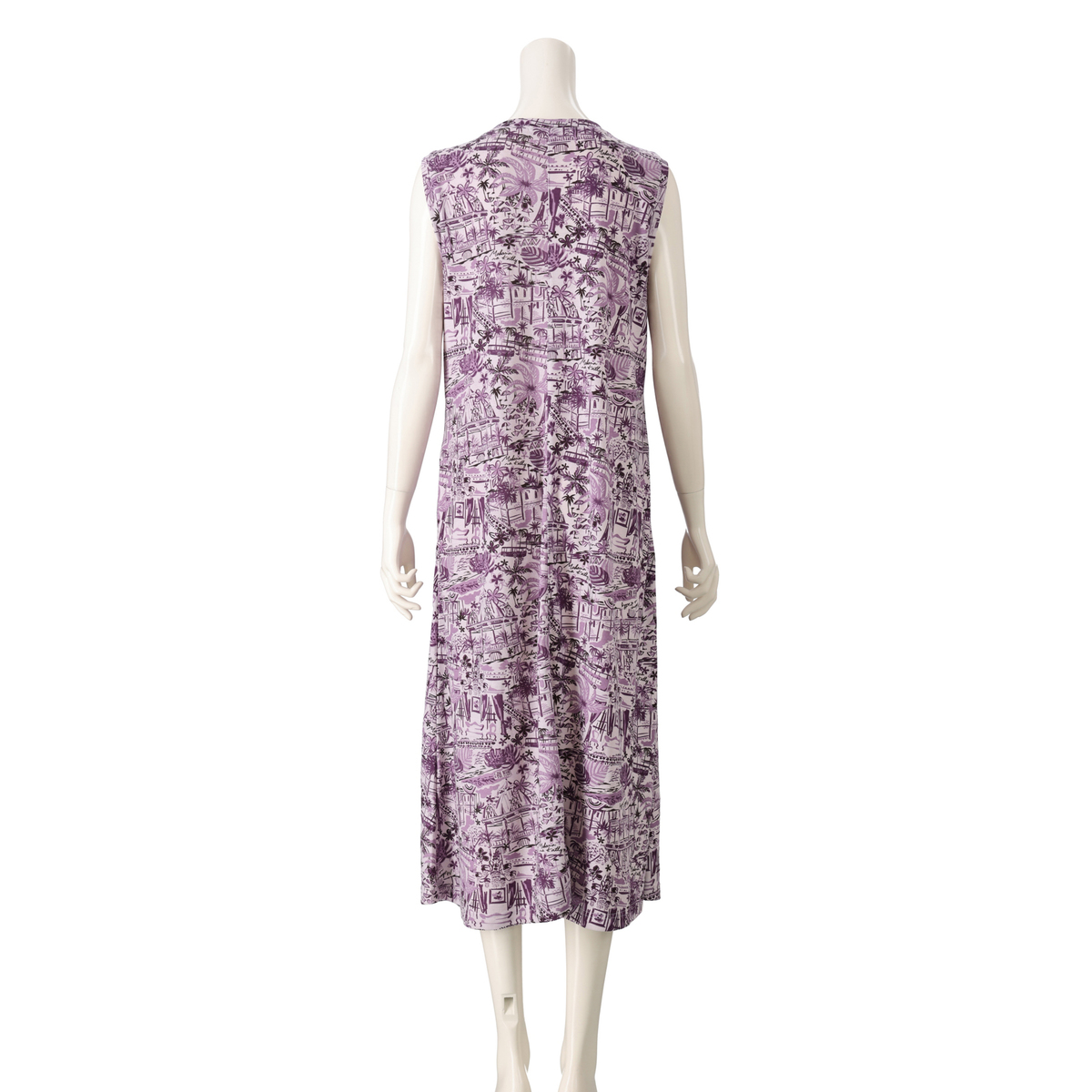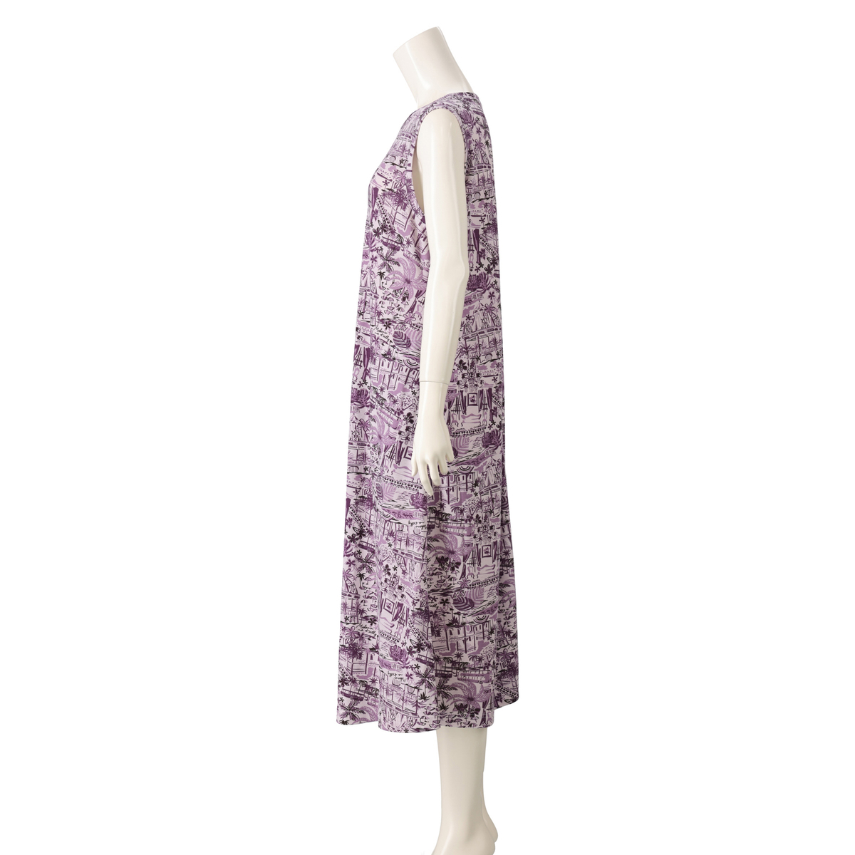 ハワイアンプリントが目を引くノースリーブワンピースです。オルオルとは、ハワイ語で心地よいの意味。すっきりとしたノースリーブのデザインで、リゾートや日常使いにも活躍します