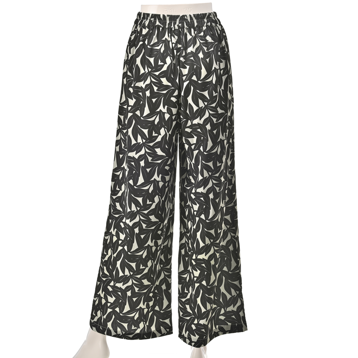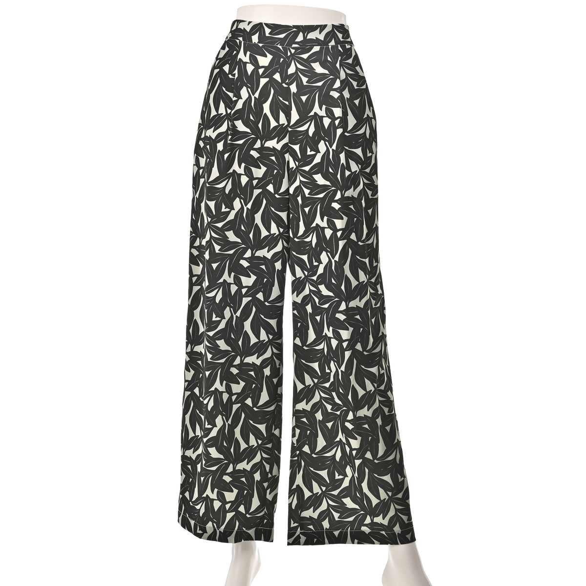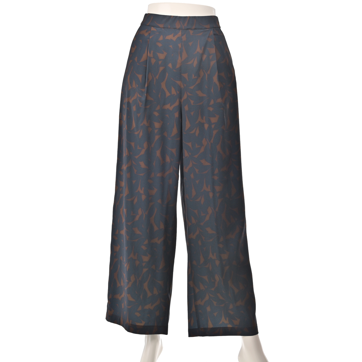 大きめのリーフプリントをあしらったワイドパンツ。グレージュに黒、ブラウンにネイビーと落ち着いた配色の2色展開で、コーディネートに取り入れやすい一着です。