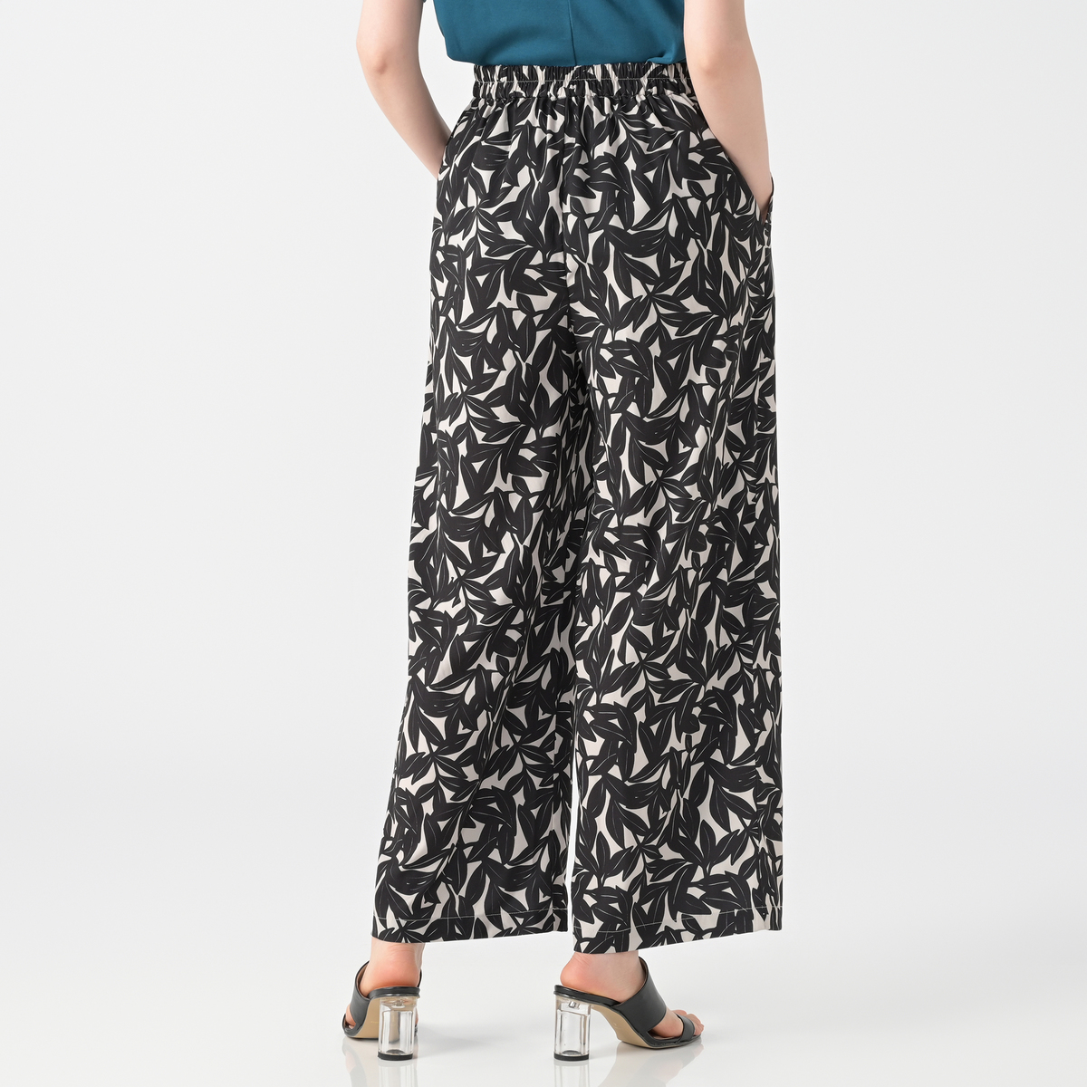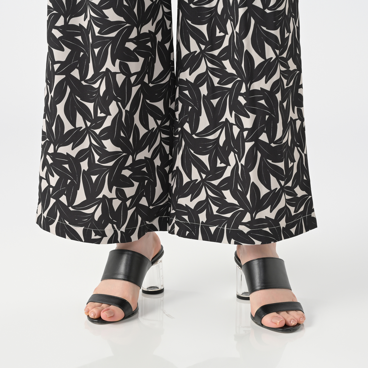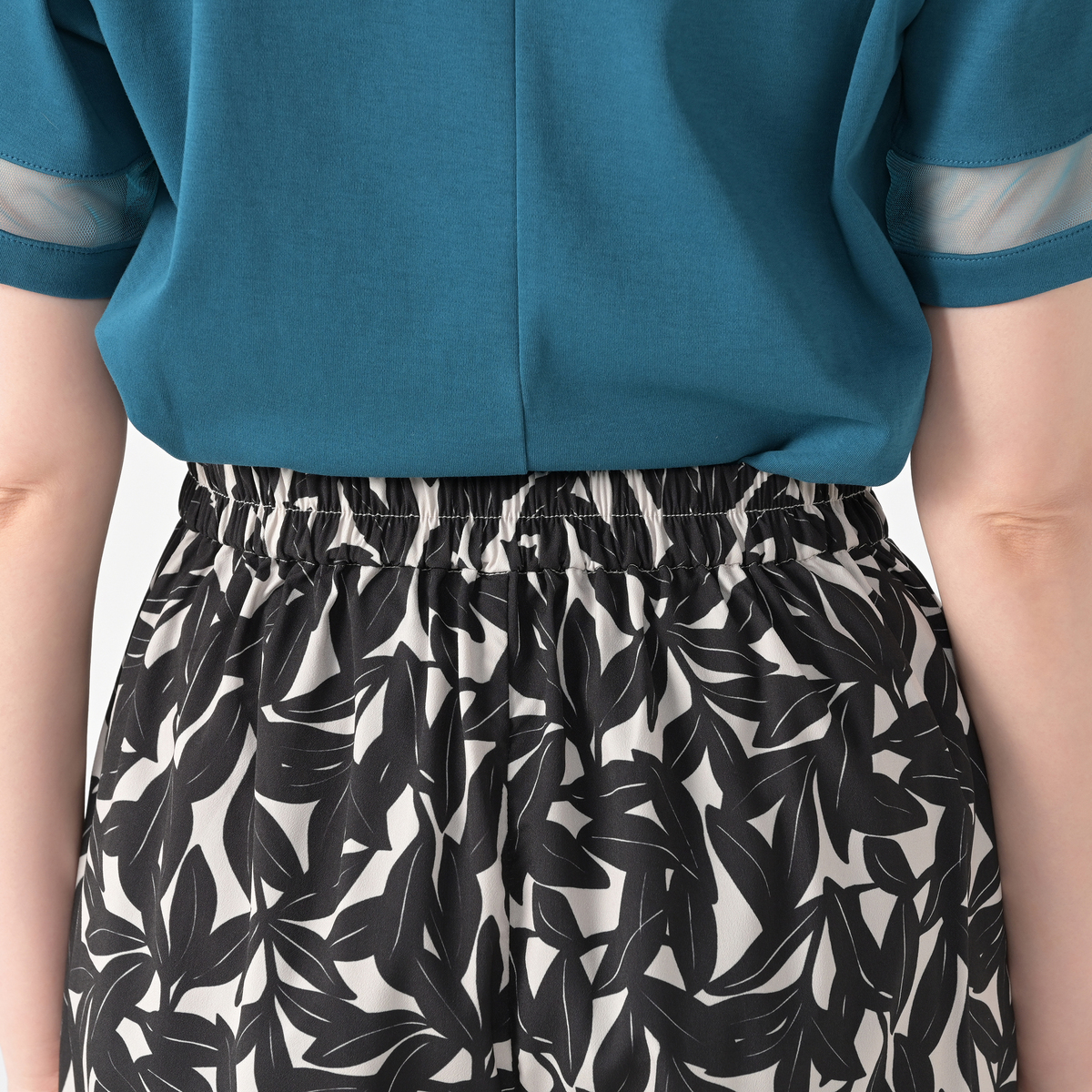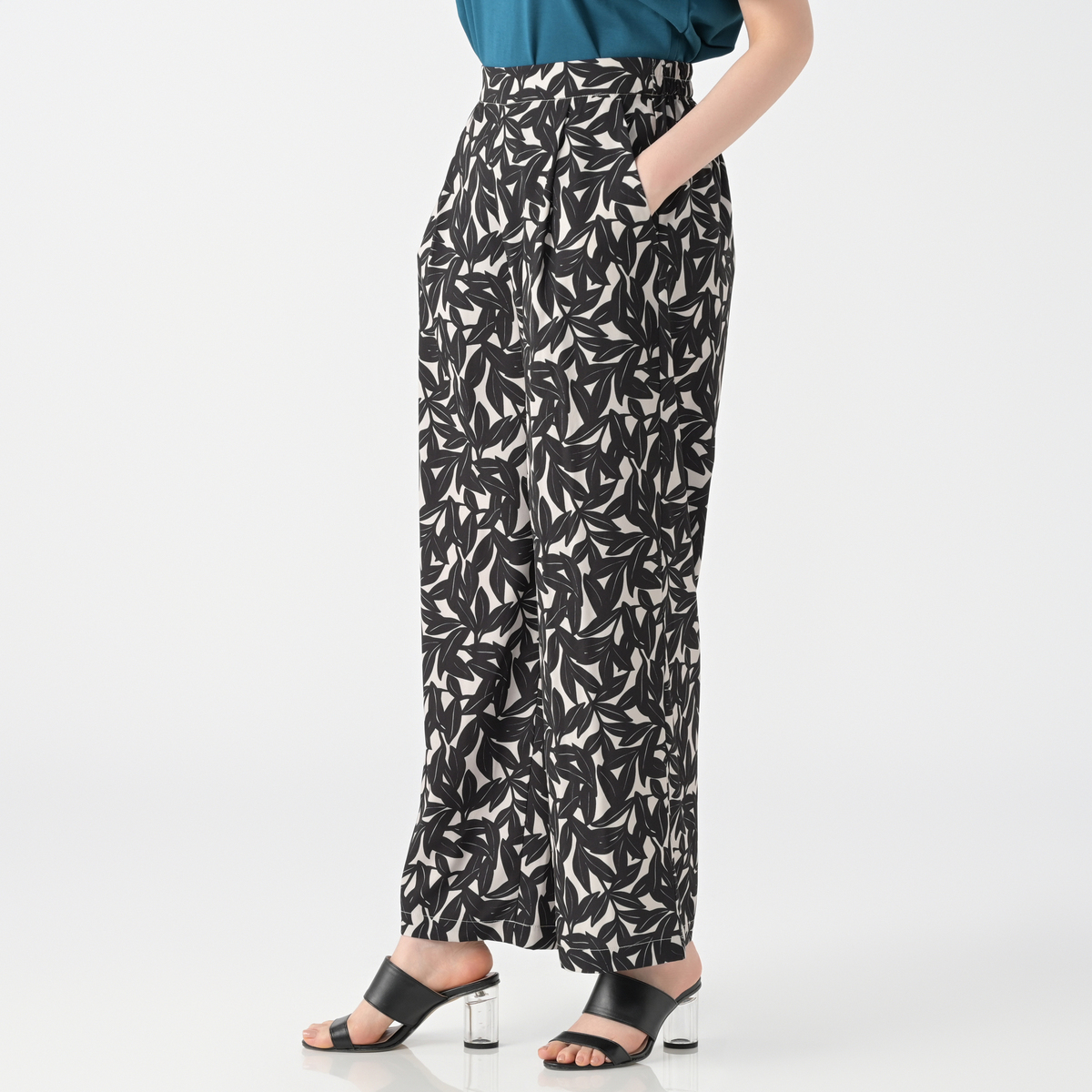 大きめのリーフプリントをあしらったワイドパンツ。グレージュに黒、ブラウンにネイビーと落ち着いた配色の2色展開で、コーディネートに取り入れやすい一着です。