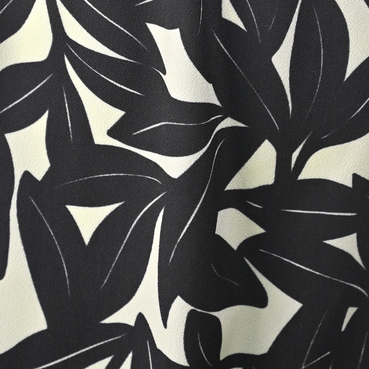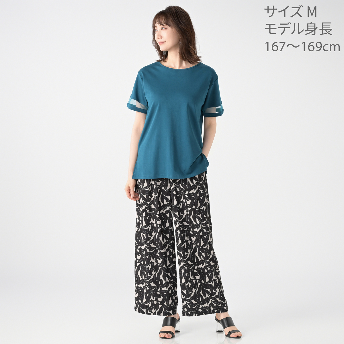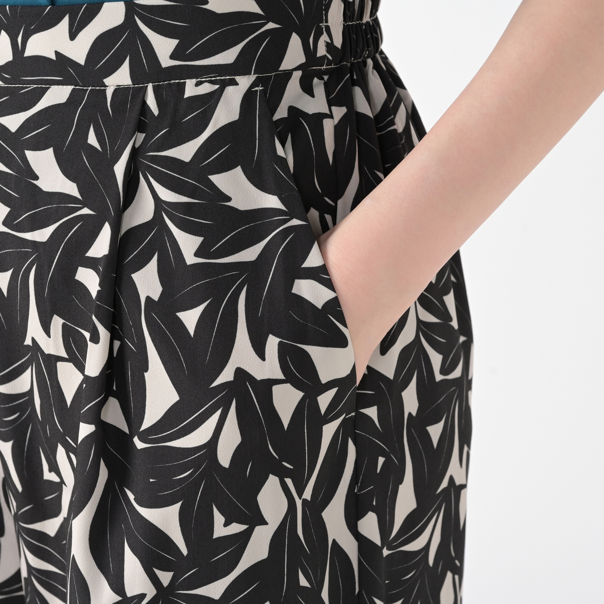 さらりとしたサテンのプリント生地を使用。前はタック入り、後ろはギャザーでまっすぐ落ちるワイドシルエットが特徴です