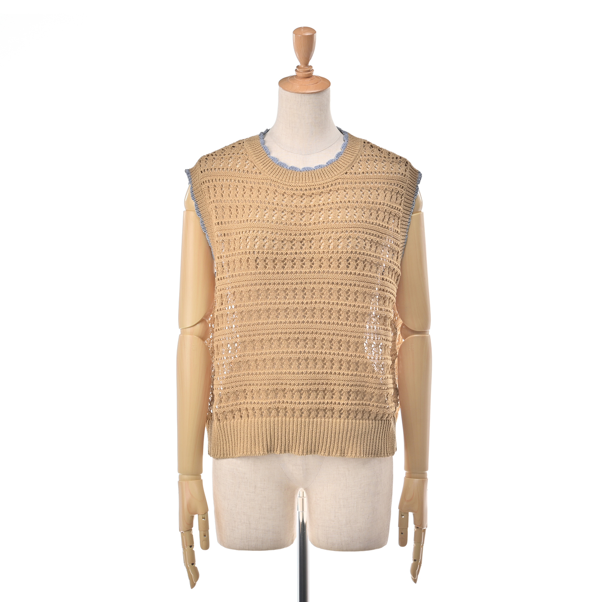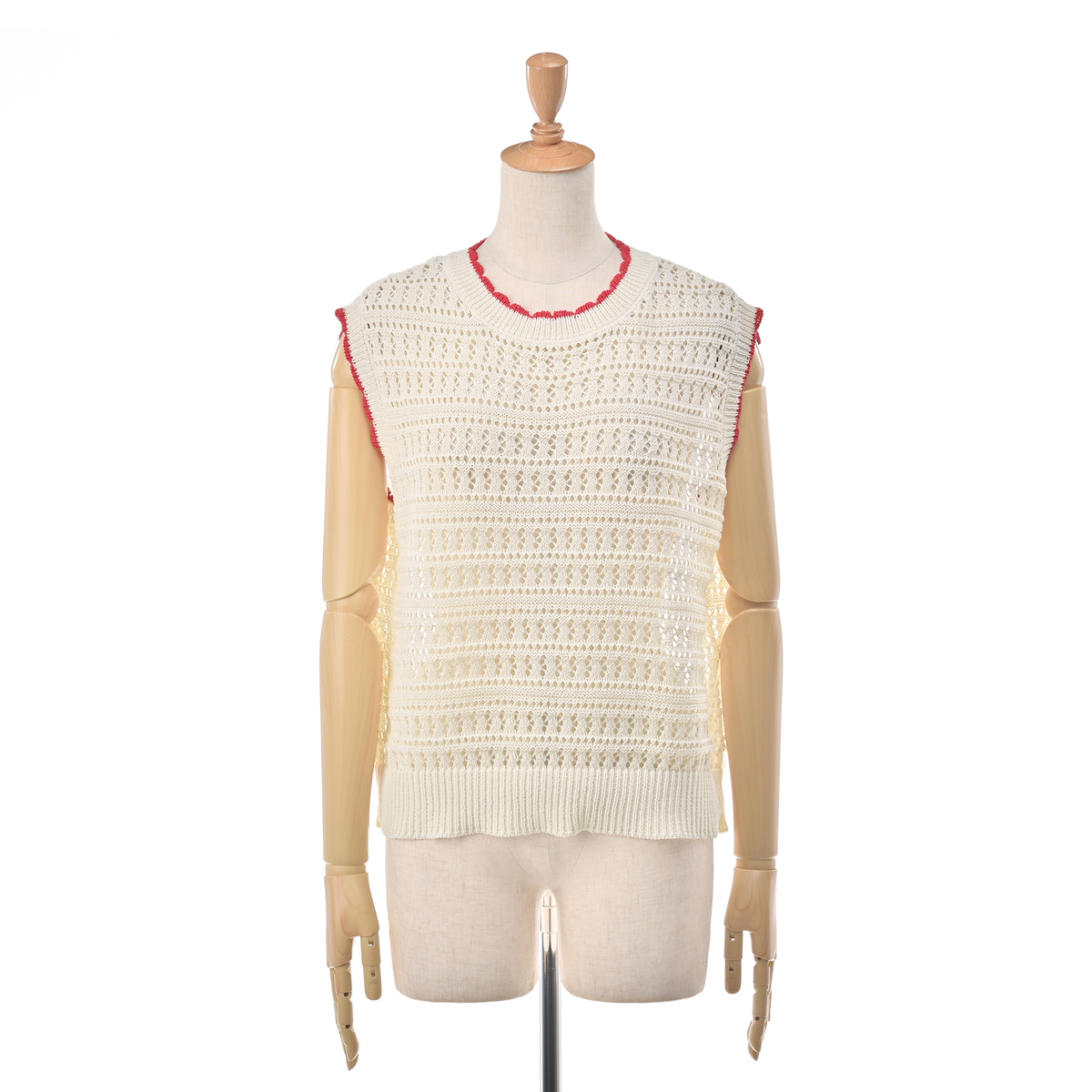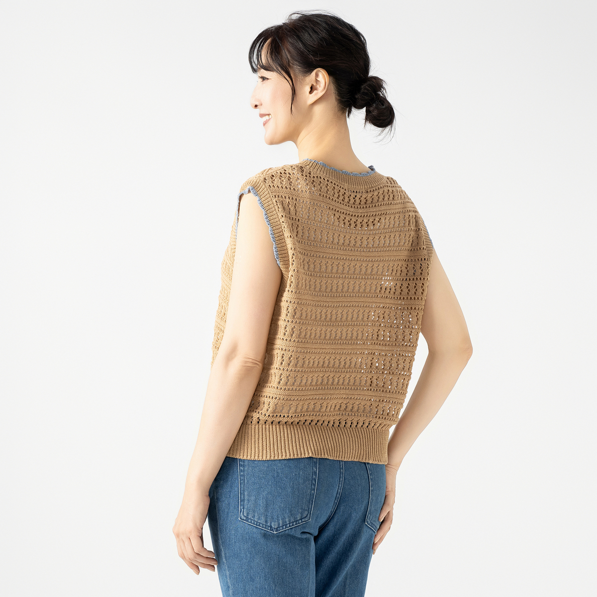 衿と袖口部分にカラー配色を施したノースリーブニット。涼し気な透かし柄で、カットソーやシャツに合わせればトレンド感のあるレイヤードスタイルに。肌離れがよい綿混素材で編みたてており、さらっとした風合いで、涼しくご着用いただけます
