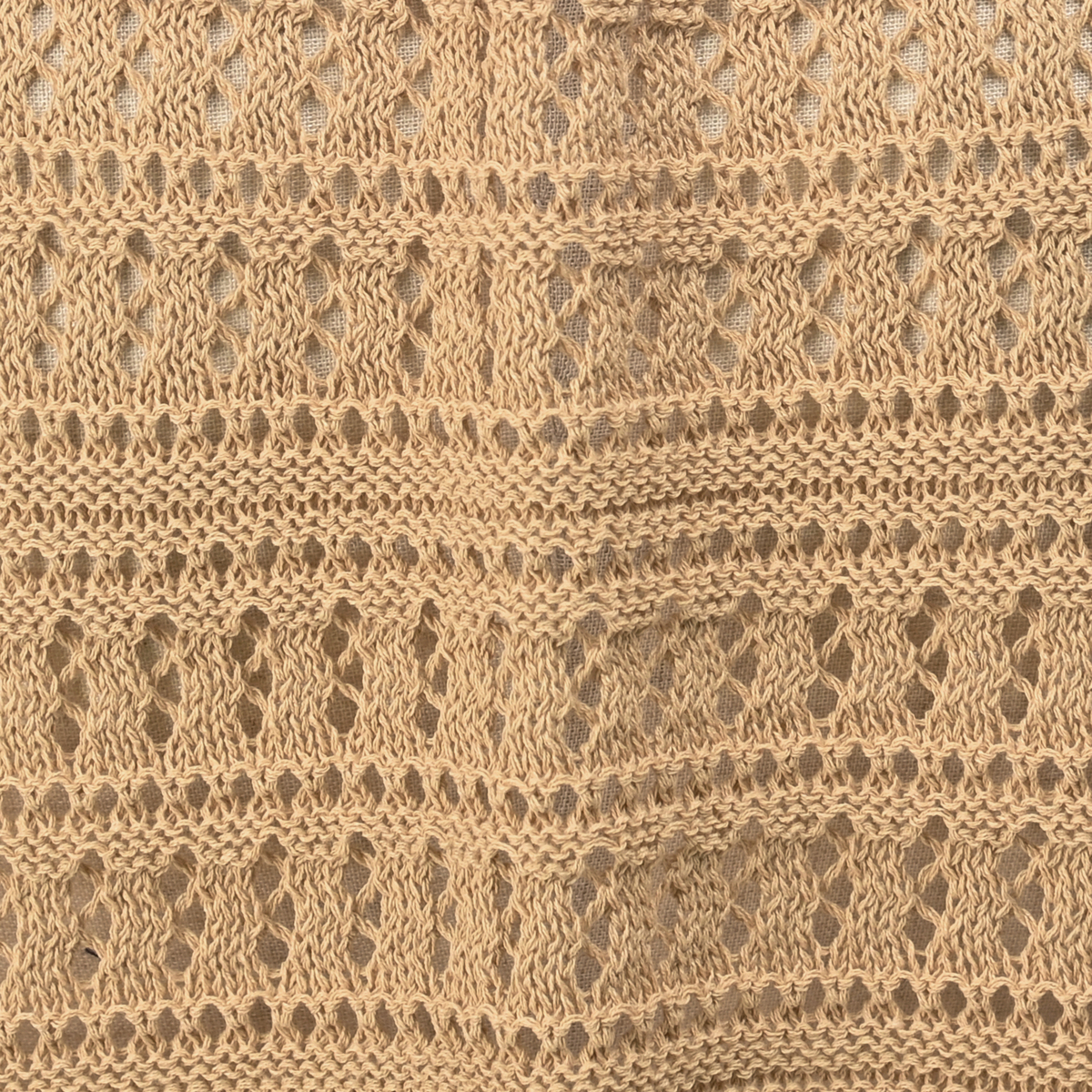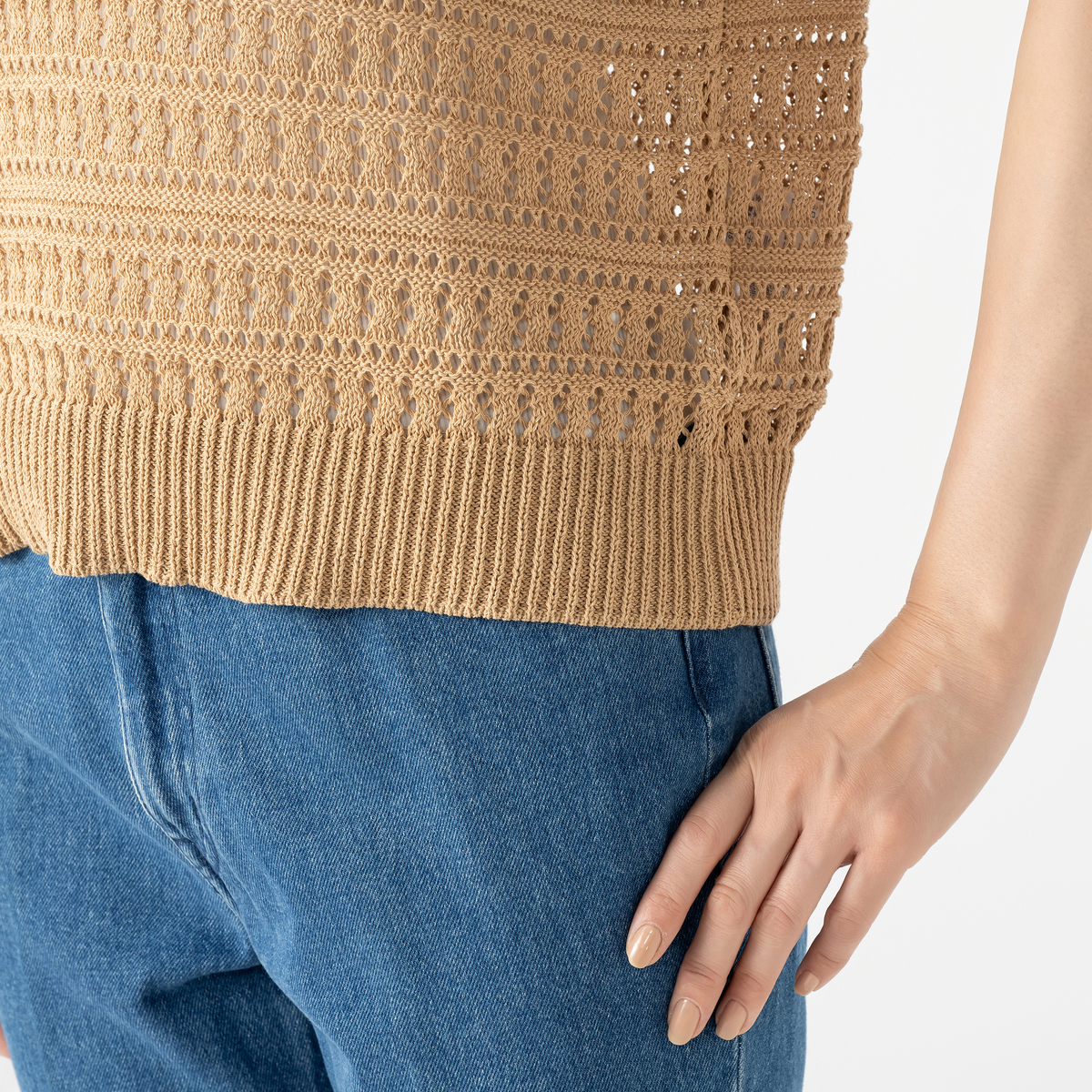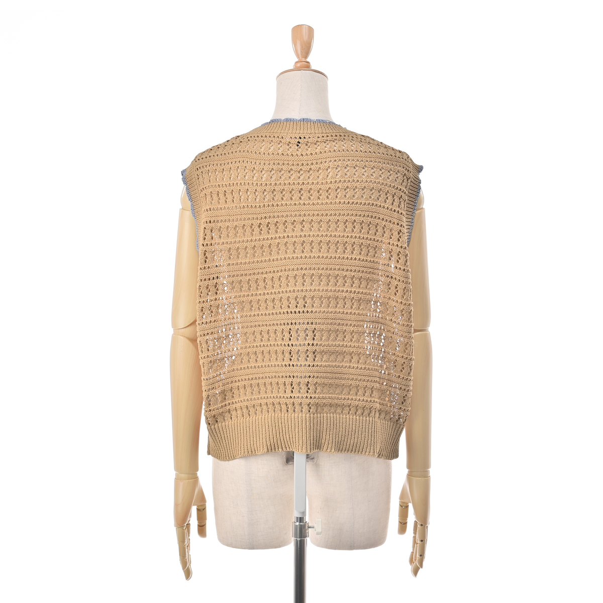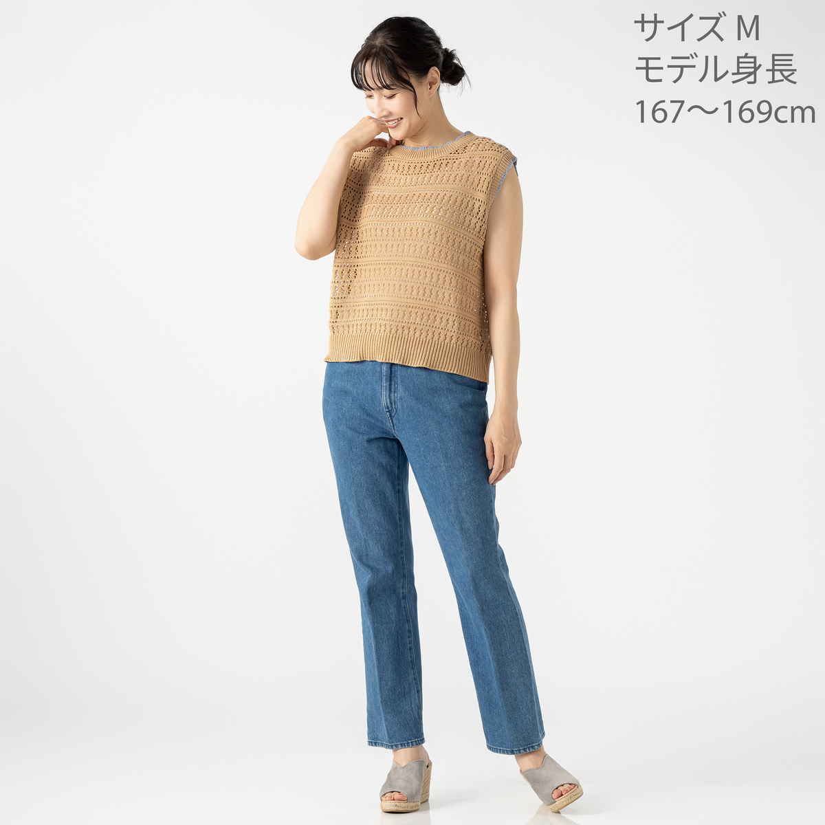 衿と袖口部分にカラー配色を施したノースリーブニット。涼し気な透かし柄で、カットソーやシャツに合わせればトレンド感のあるレイヤードスタイルに。肌離れがよい綿混素材で編みたてており、さらっとした風合いで、涼しくご着用いただけます