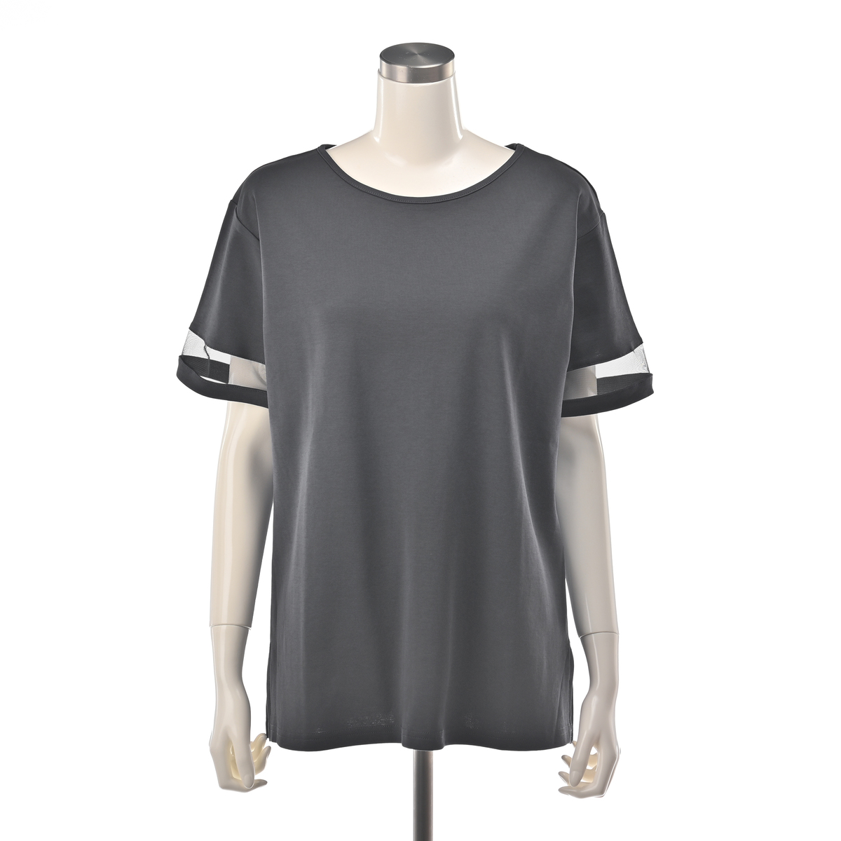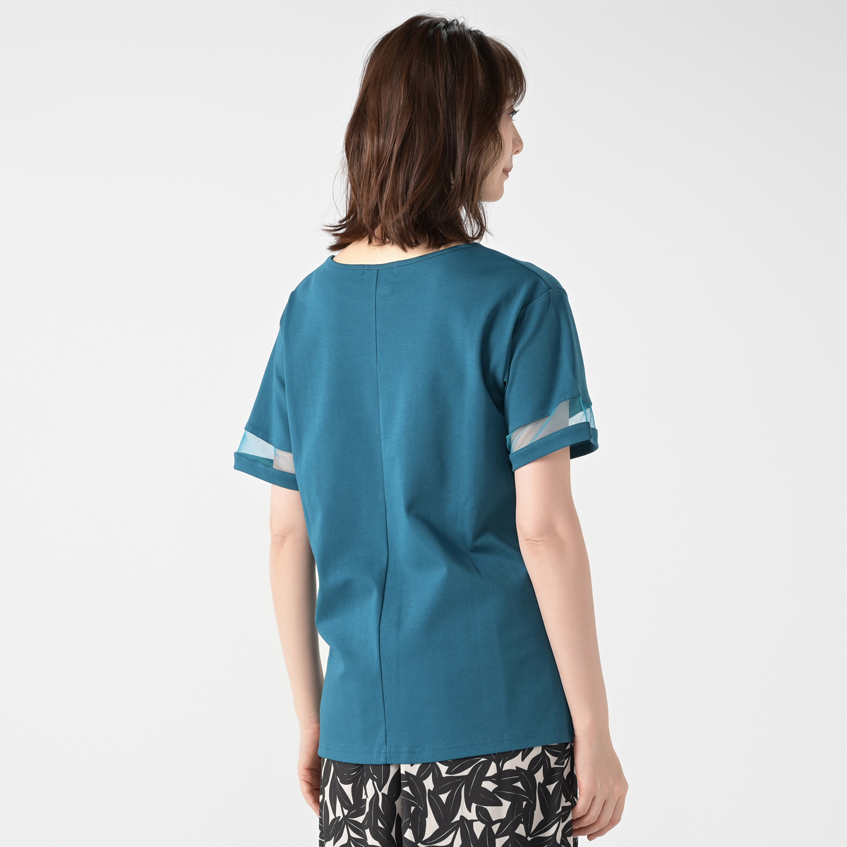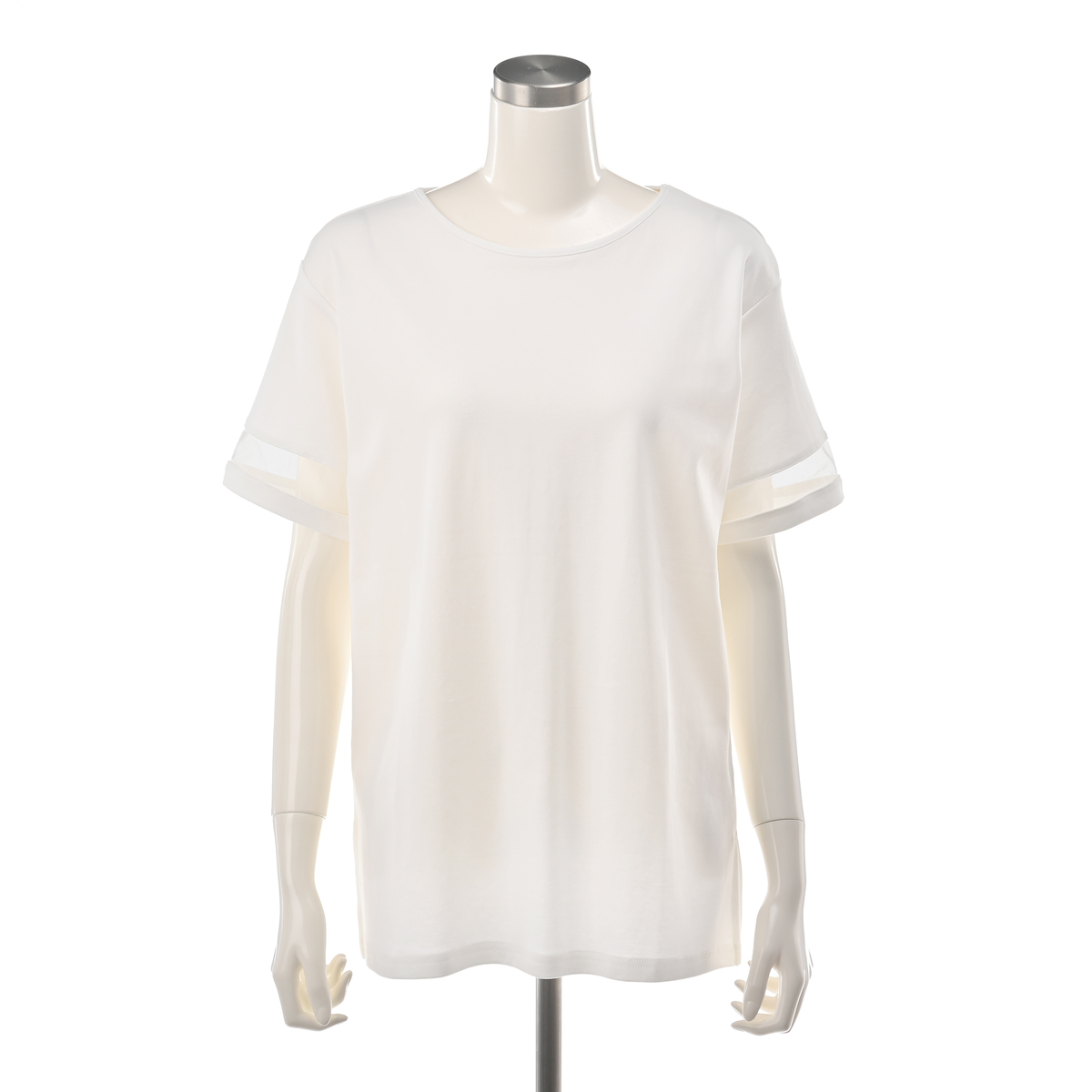 袖のシアーなチュール切替がポイントのカットソープルオーバー。シンプルなTシャツにさりげない透け感を加え、抜け感をプラスしました