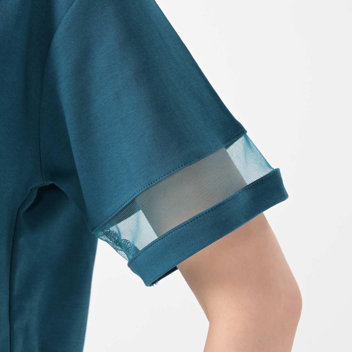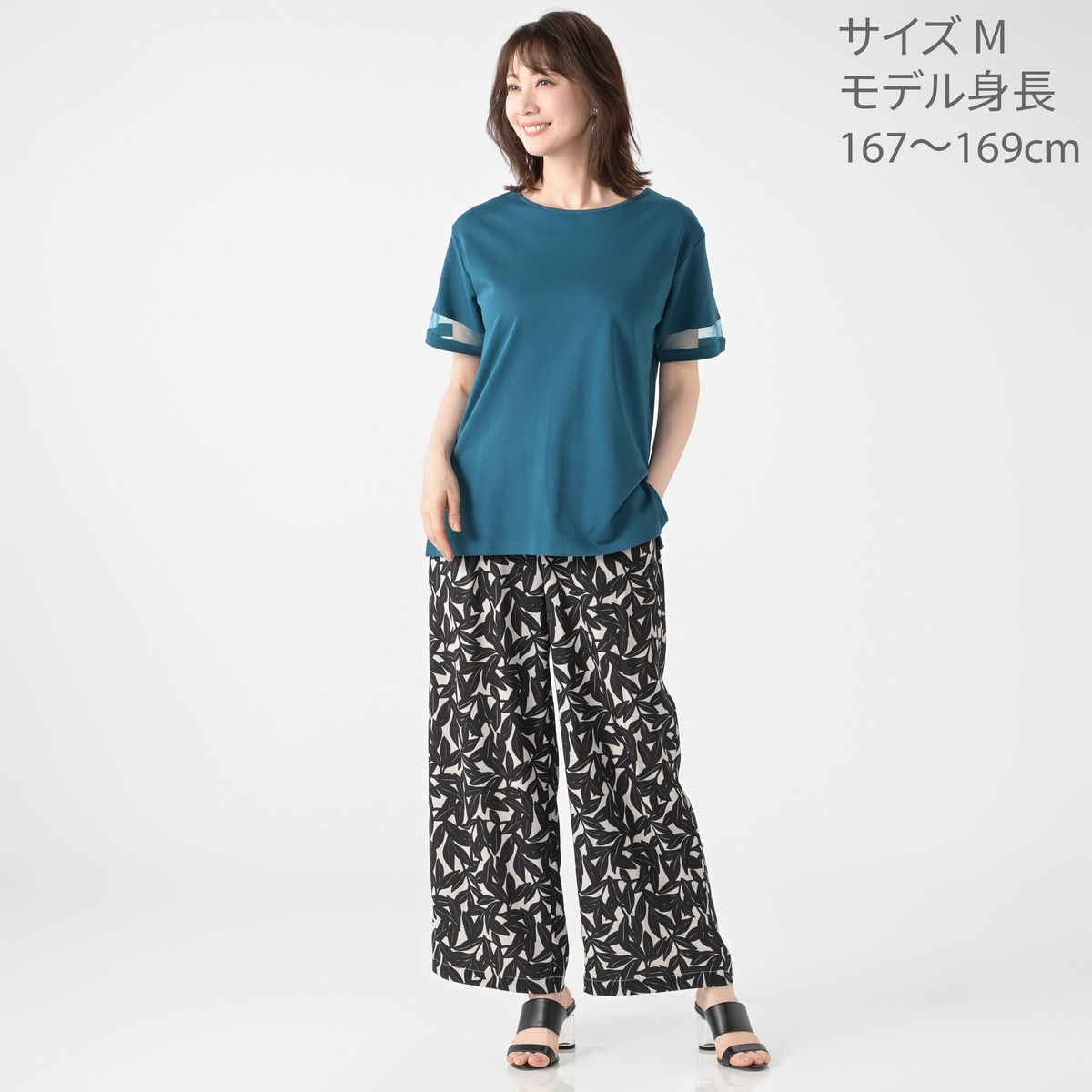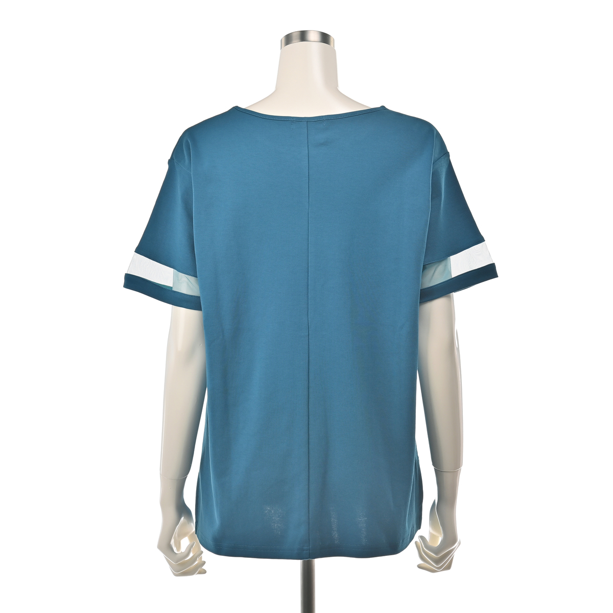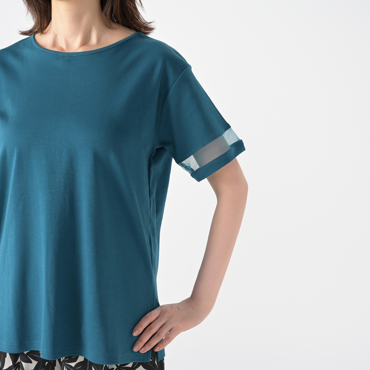 袖のシアーなチュール切替がポイントのカットソープルオーバー。シンプルなTシャツにさりげない透け感を加え、抜け感をプラスしました