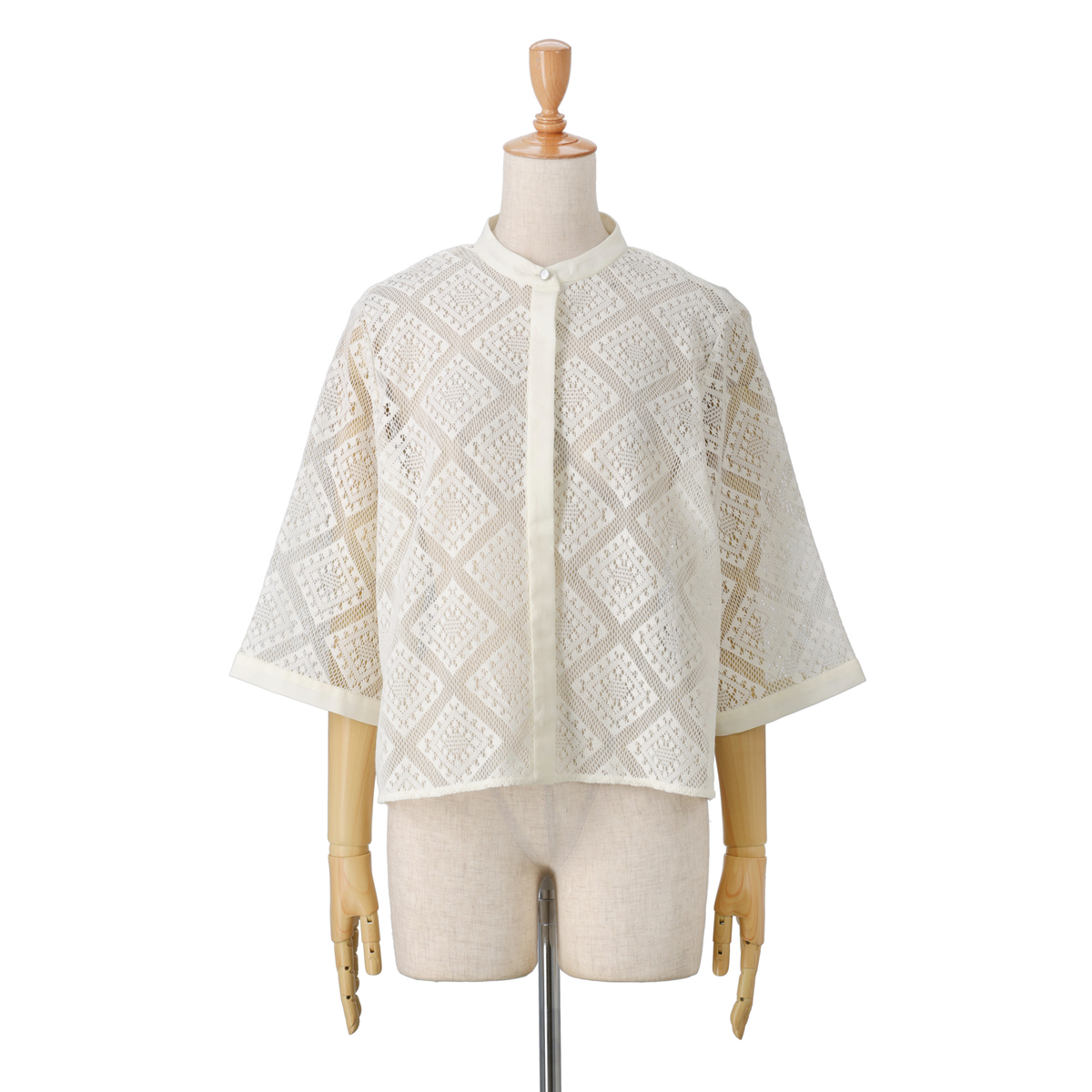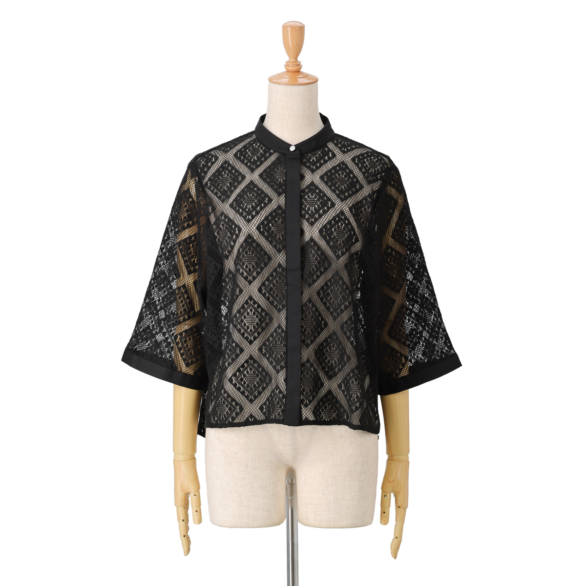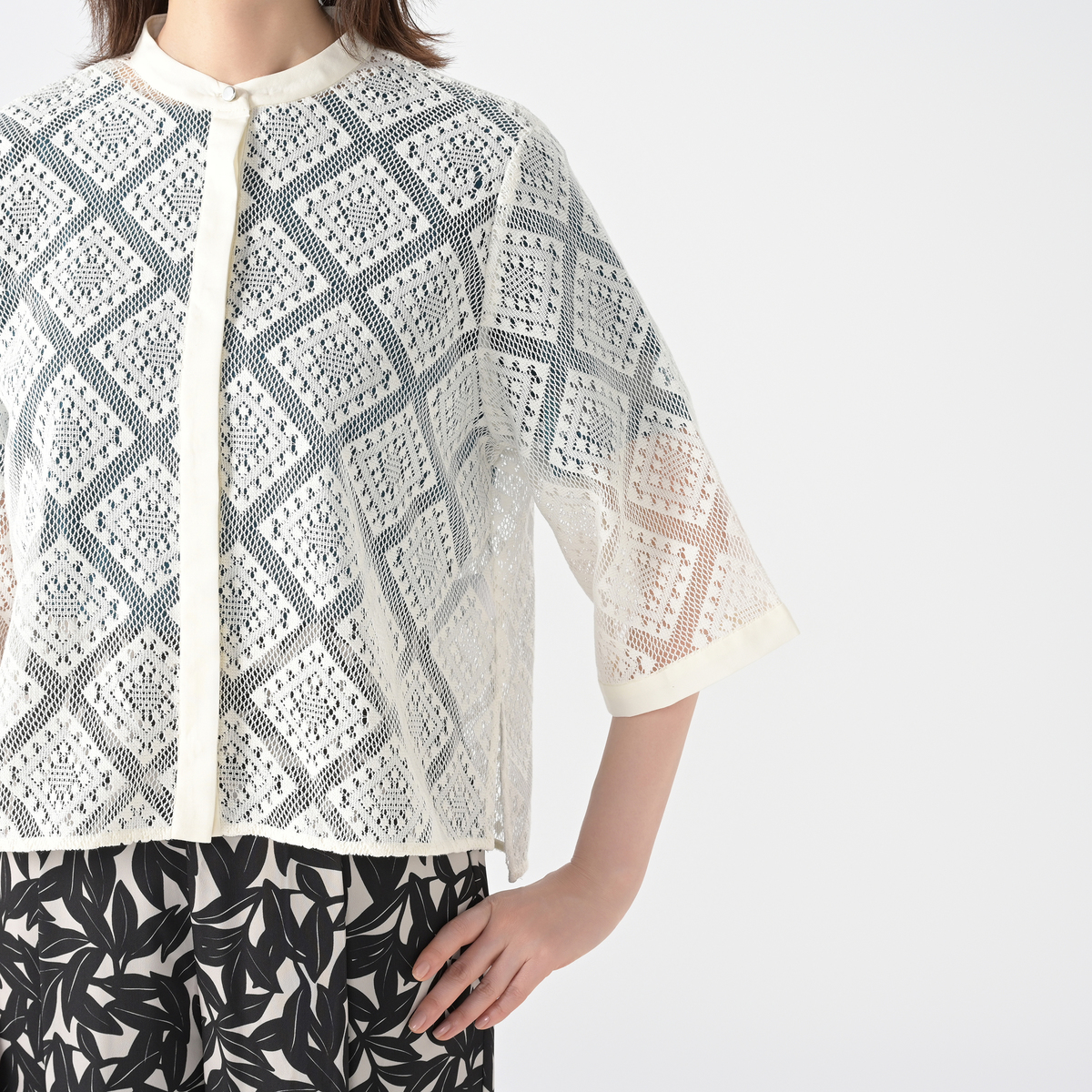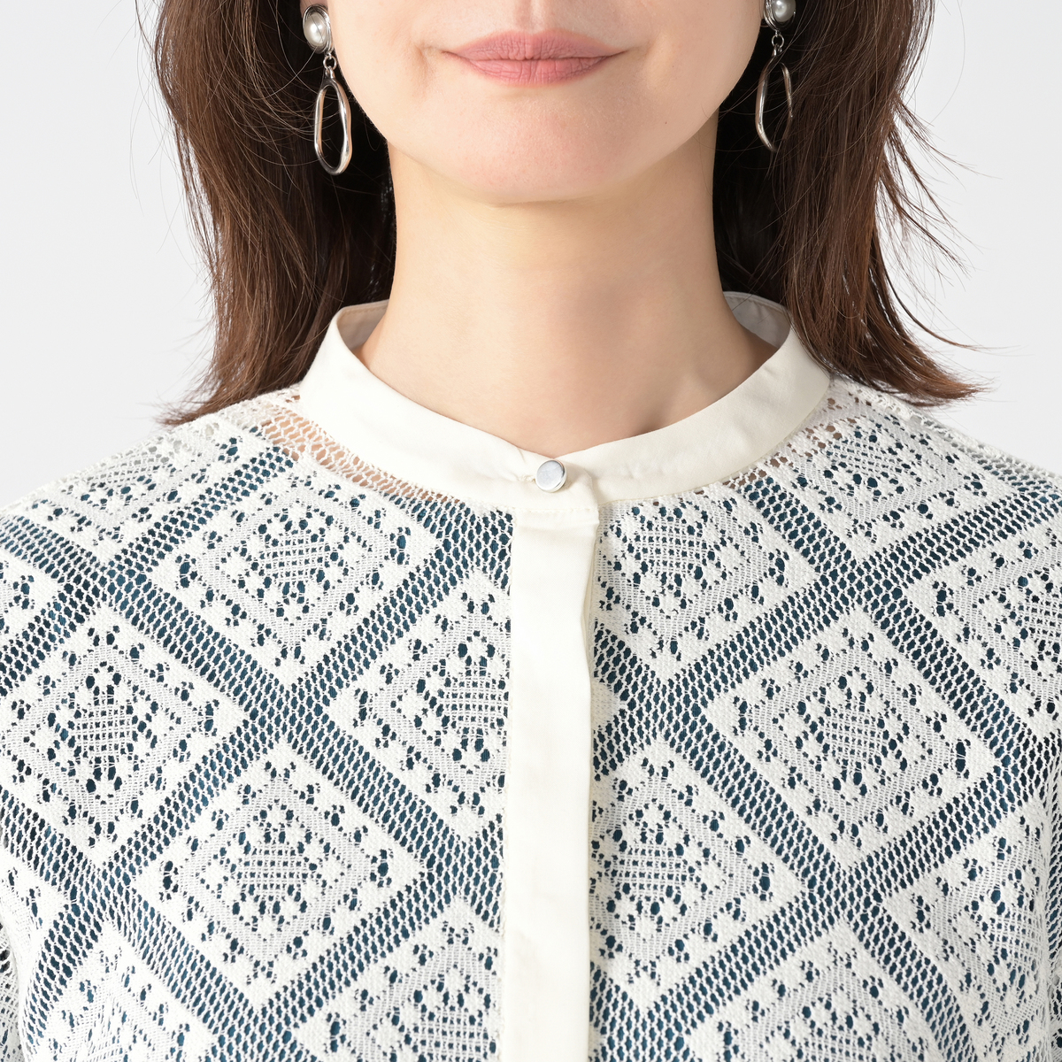 すっきりしたスタンドカラーで、レースの本体と衿、前立て、袖口の異素材切り替えが新鮮なデザイン。さっと合わせるだけでコーディネートを格上げしてくれる、エレガントな一枚です