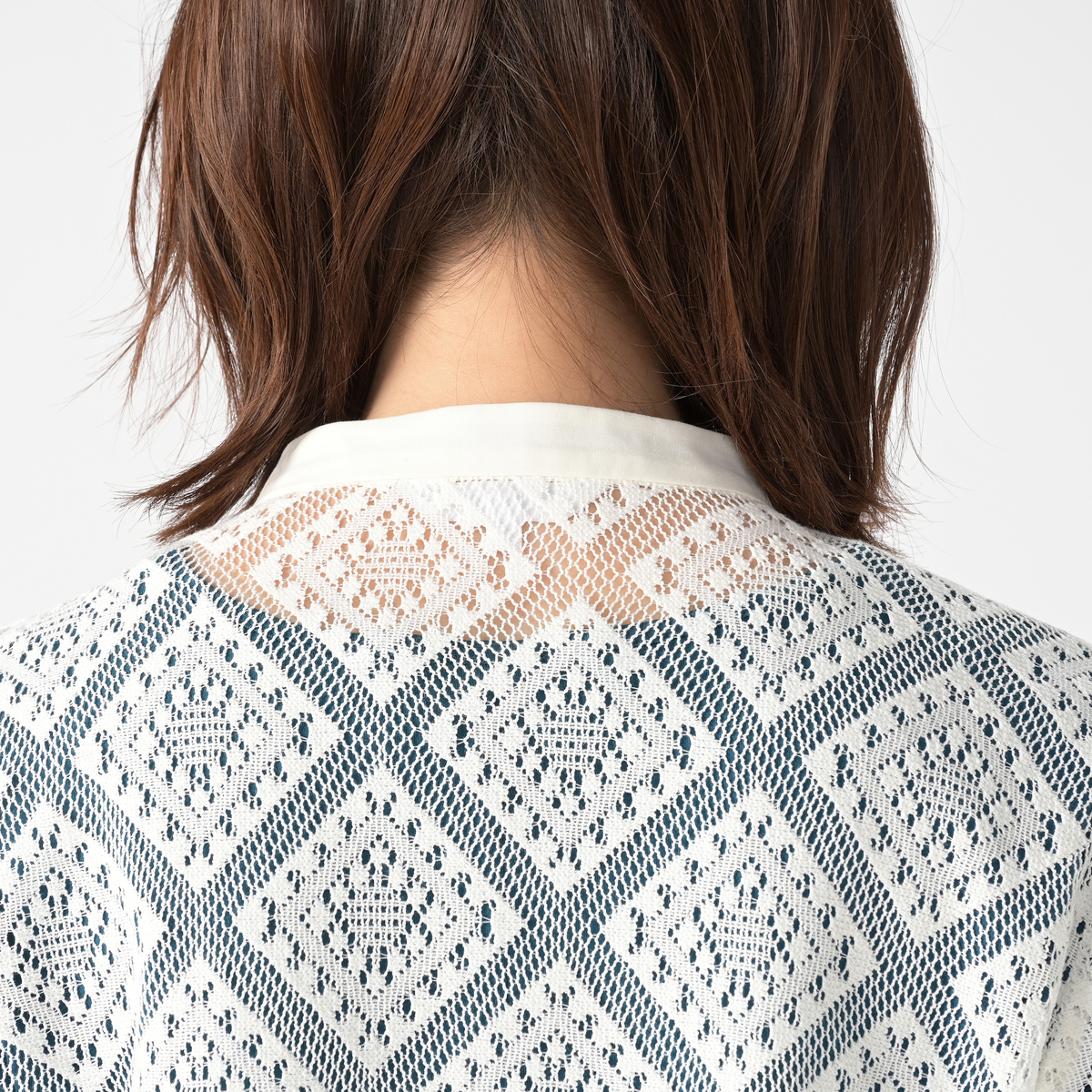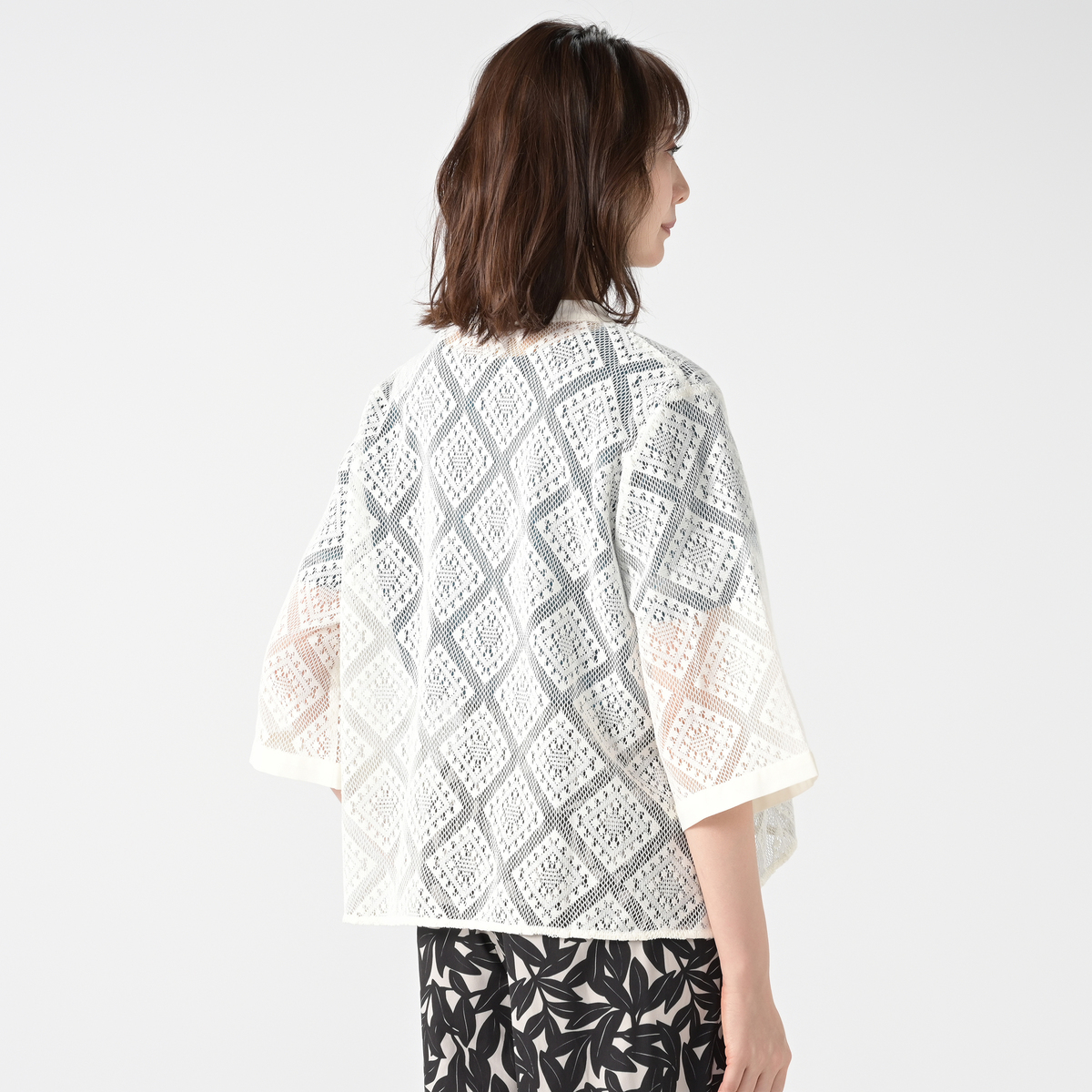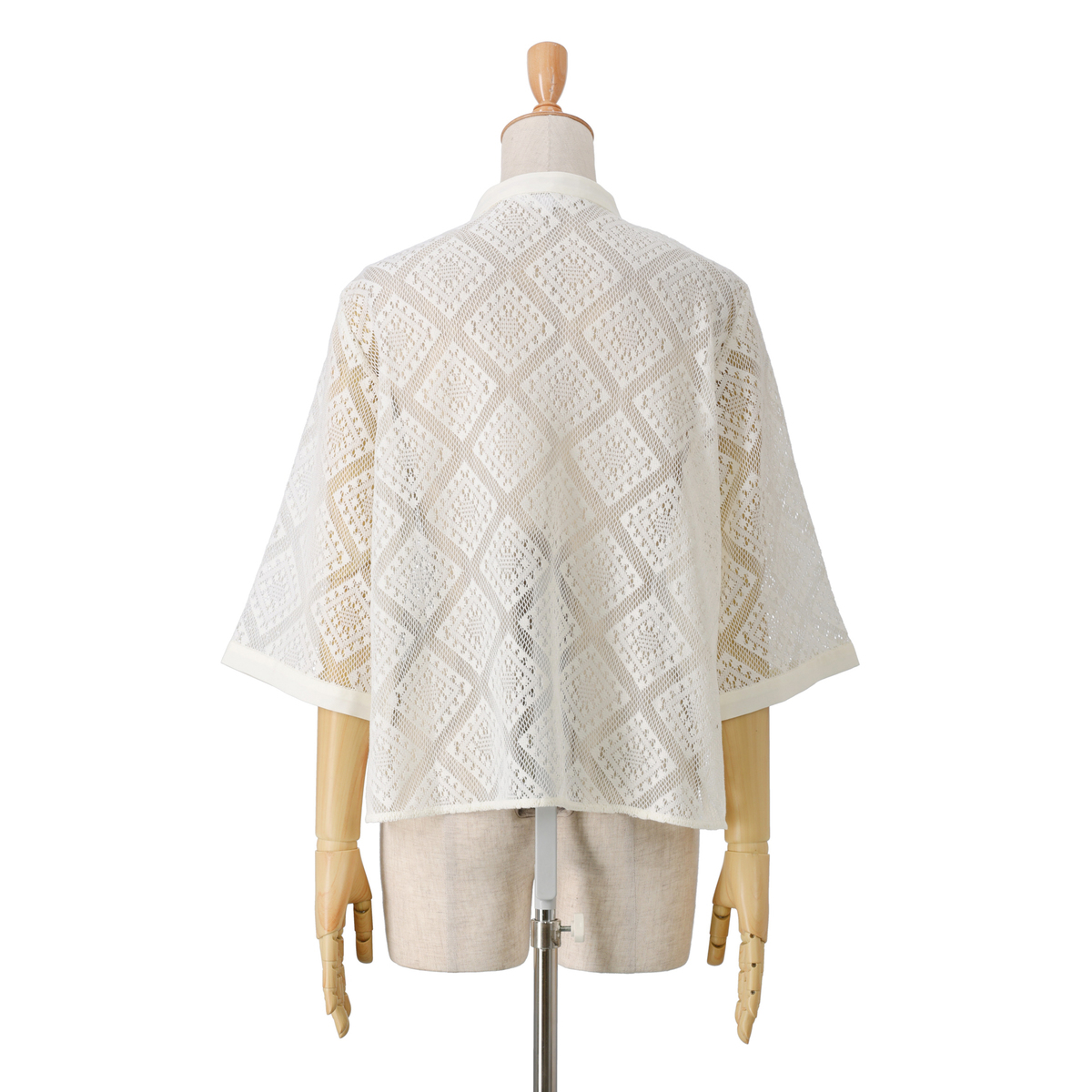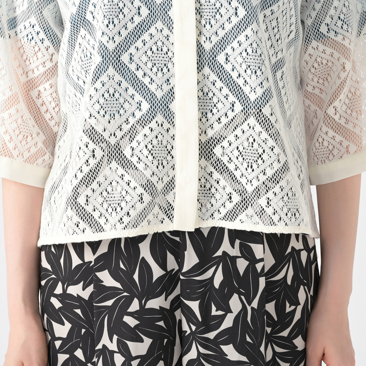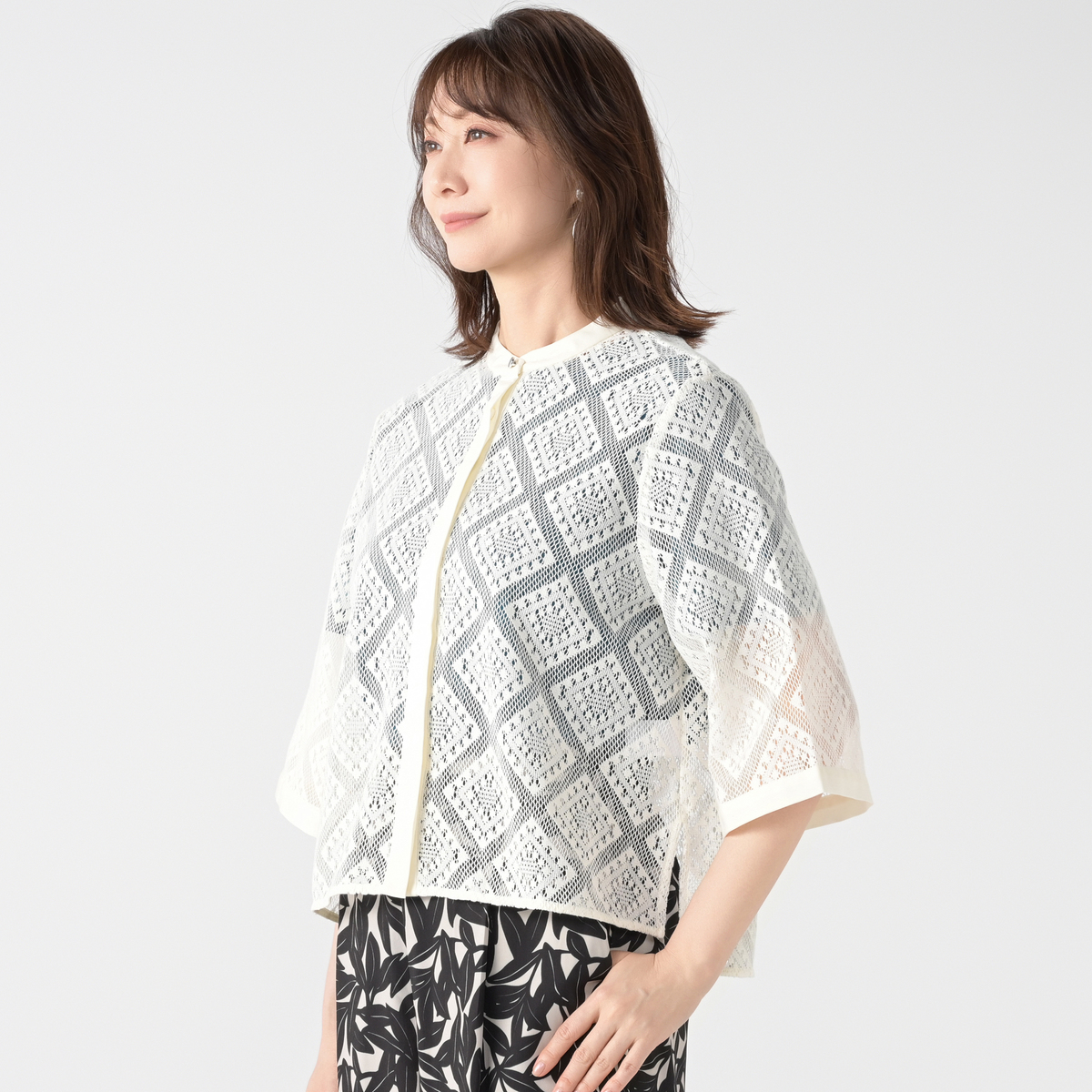 すっきりしたスタンドカラーで、レースの本体と衿、前立て、袖口の異素材切り替えが新鮮なデザイン。さっと合わせるだけでコーディネートを格上げしてくれる、エレガントな一枚です