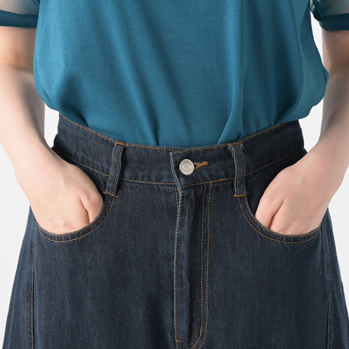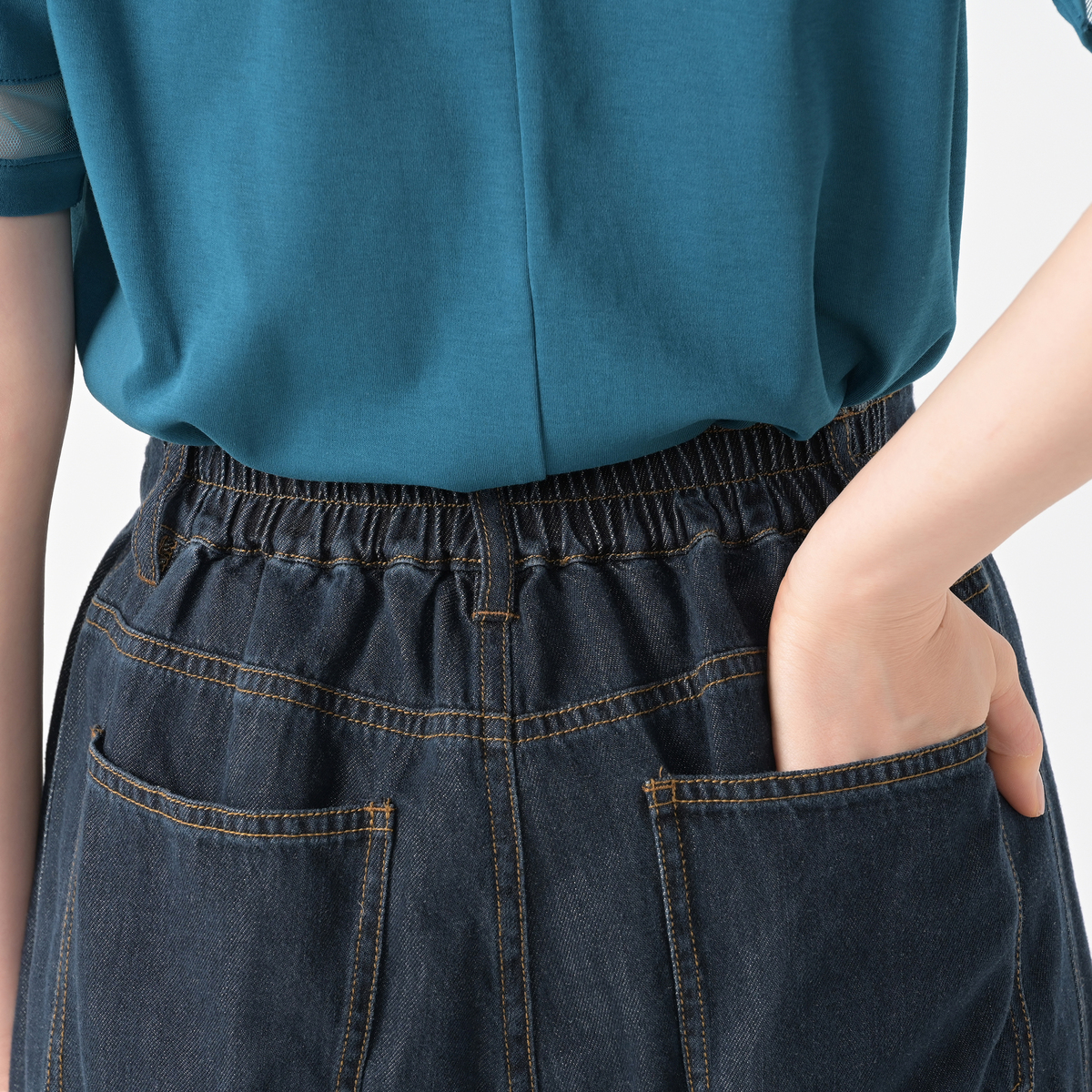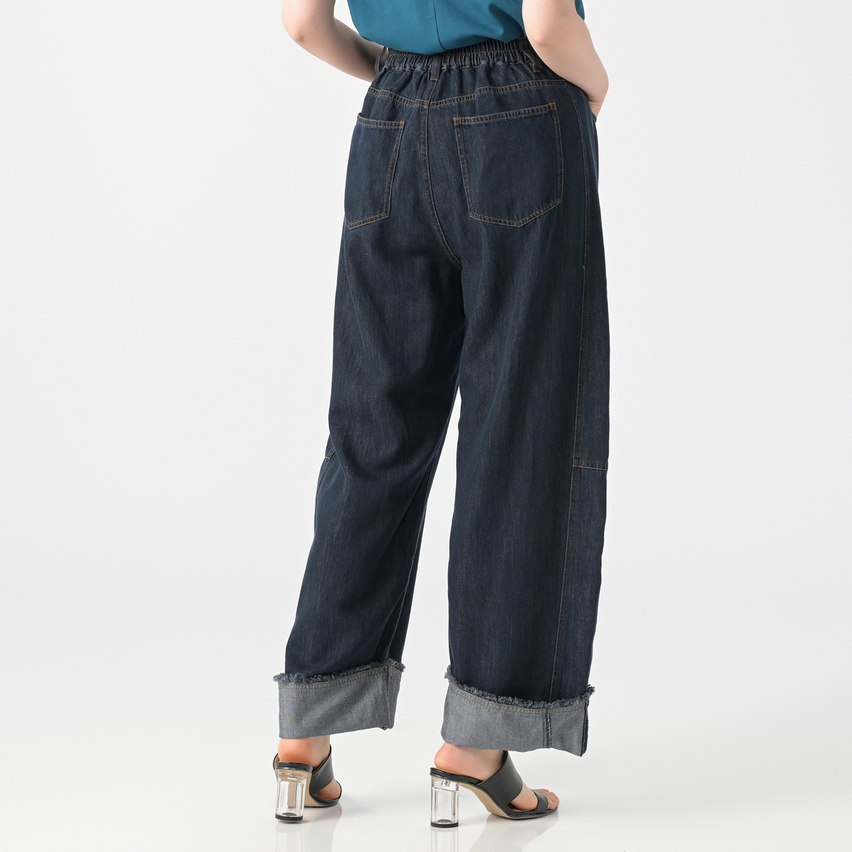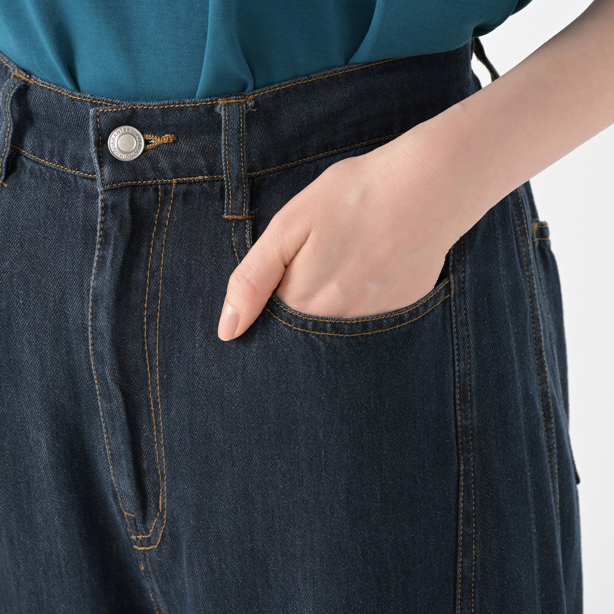 セルロース混で落ち感のよい、柔らかなデニムパンツ。裾をフリンジでターンバックしたデザインです。前中心はタックボタンとファスナー開き、後ろウエストはゴムギャザー入りで、穿き心地よく仕上げました