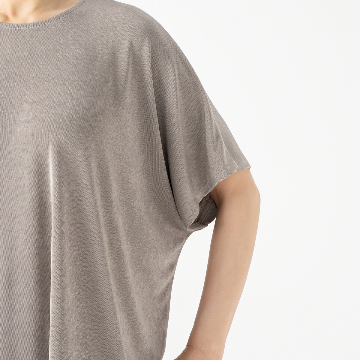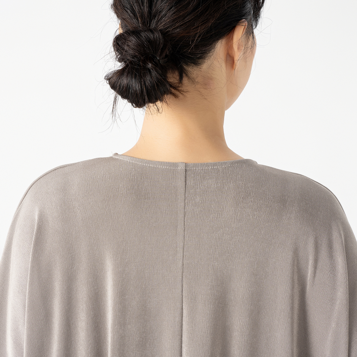 光沢感のあるリブニット素材を使用したドルマンスリーブプルオーバー。見る角度によって光沢の入る部分が変化し、陰影が洗練された大人の雰囲気を演出します