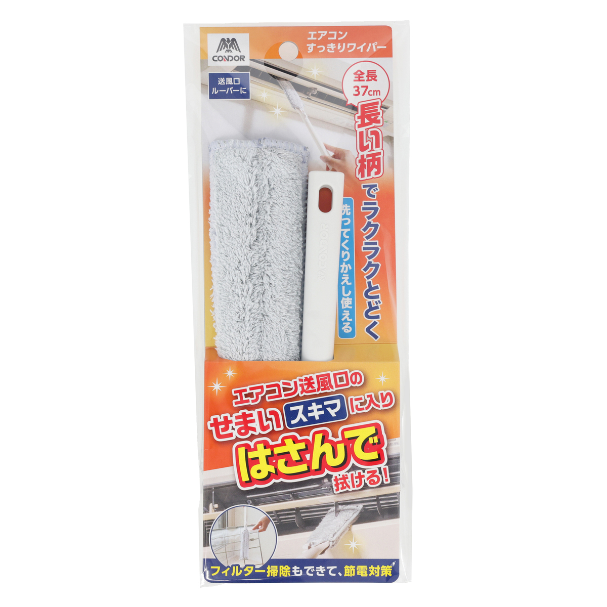 柔らかいモップを使用しているので、やさしくお掃除が可能。本体は約37cmと長さがあり、手が届きにくい場所のエアコン掃除もできます