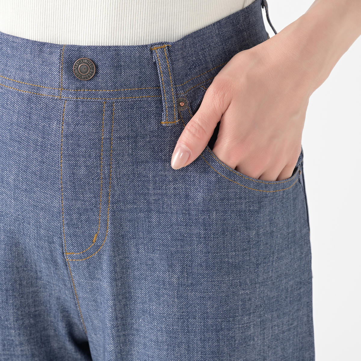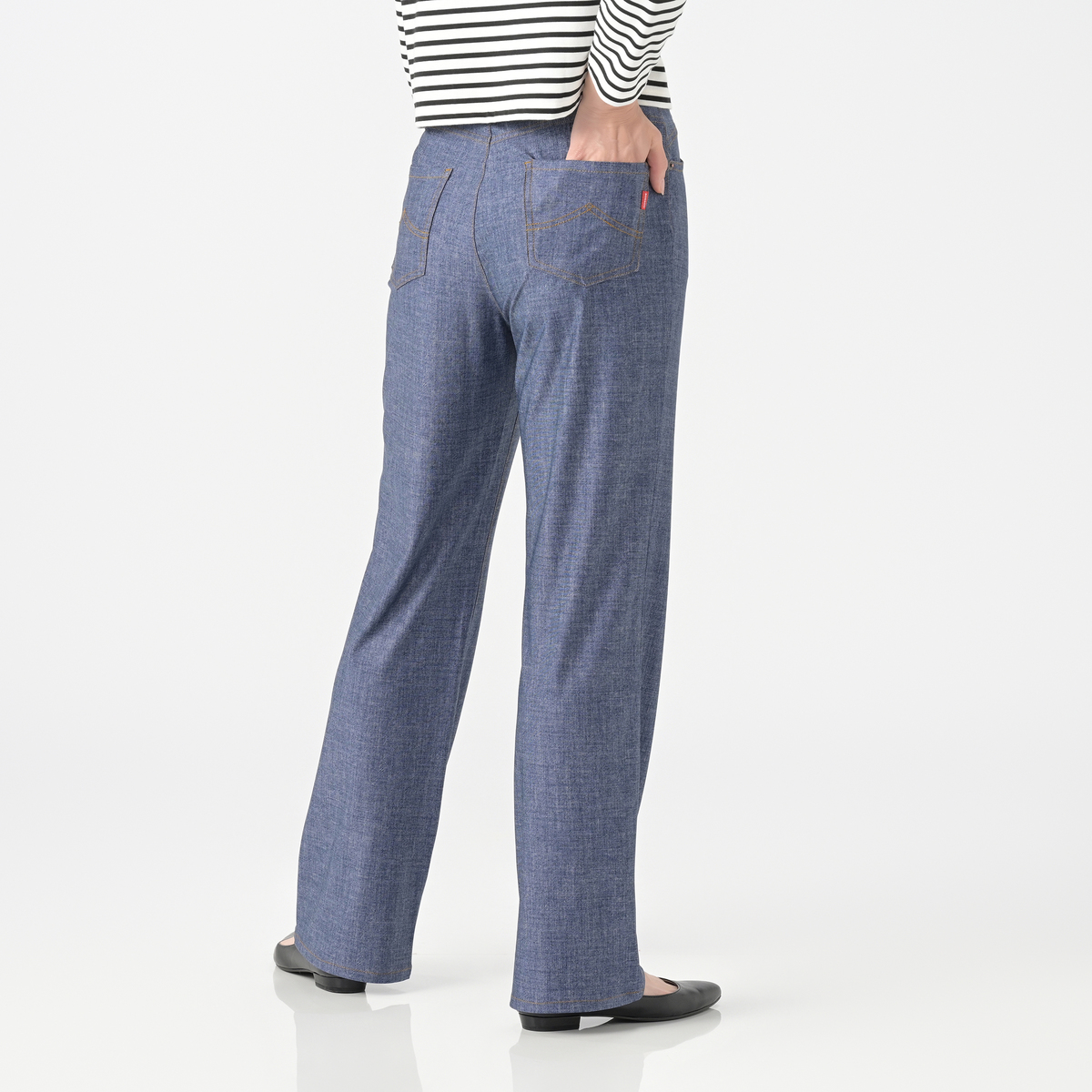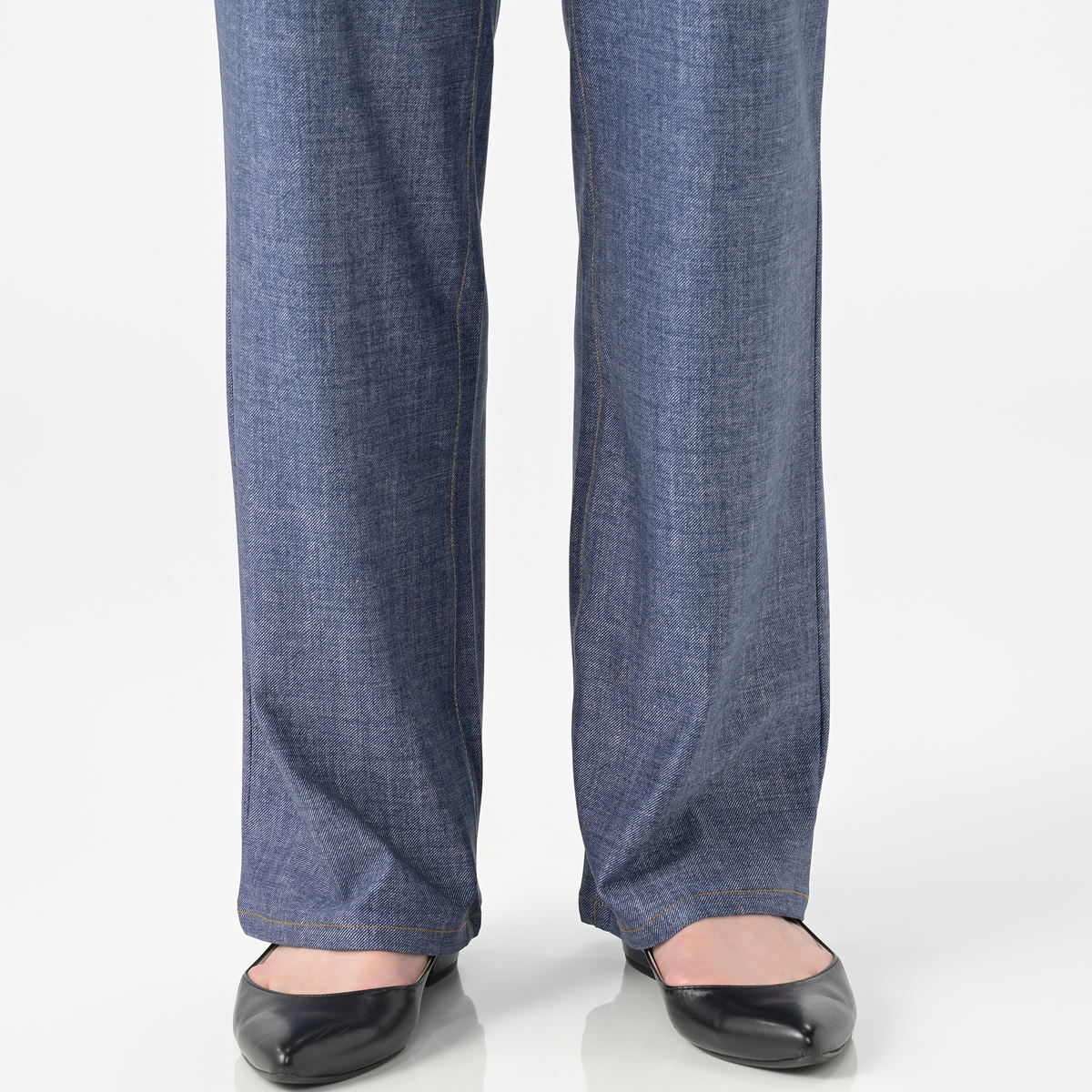 360度全方向に伸縮するデニム調素材で仕立てたストレートシルエットのパンツ。原料を先に染めてベースカラーを作り、その上に転写プリントを施すことで、リアルなデニム見えを追求しました