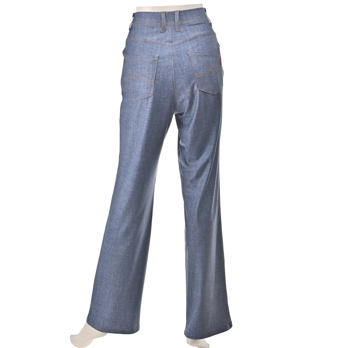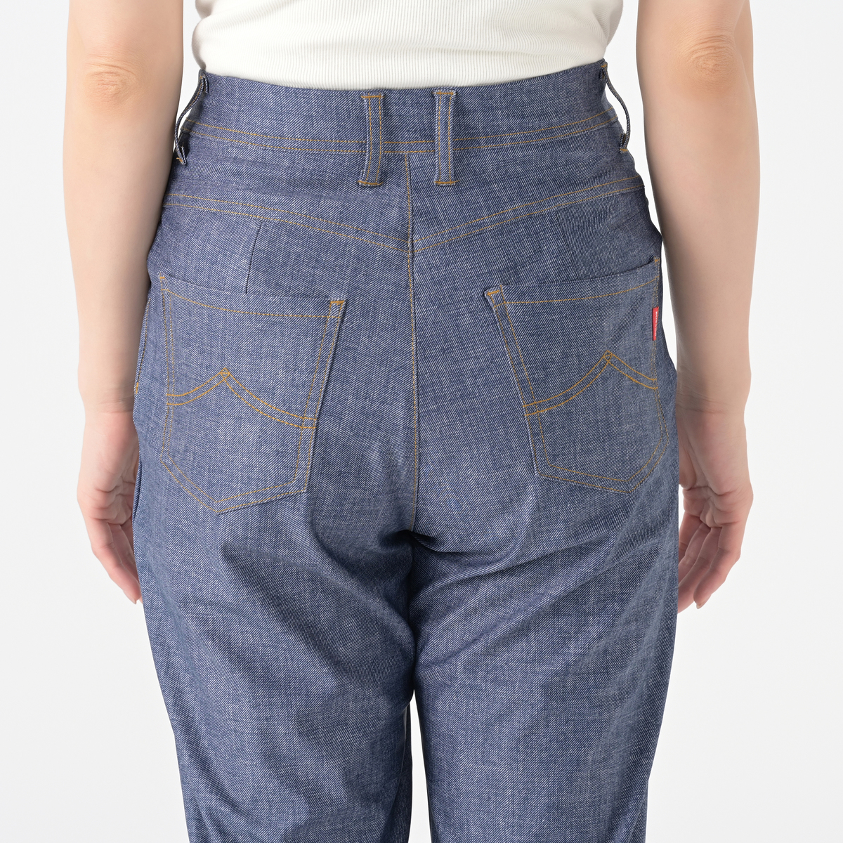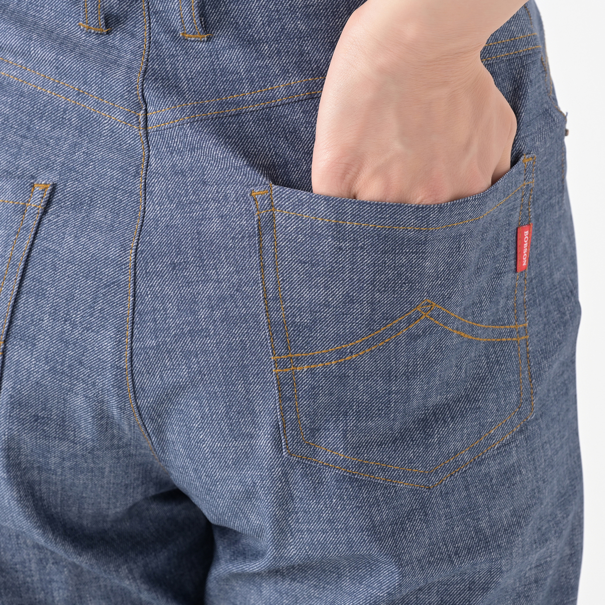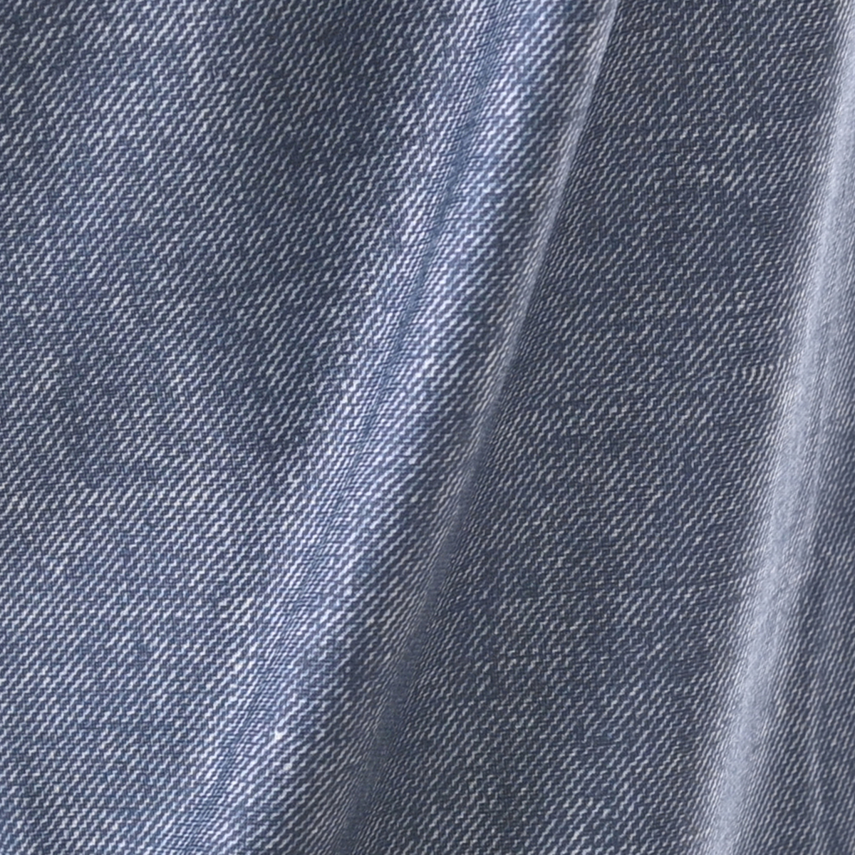 360度全方向に伸縮するデニム調素材で仕立てたストレートシルエットのパンツ。原料を先に染めてベースカラーを作り、その上に転写プリントを施すことで、リアルなデニム見えを追求しました