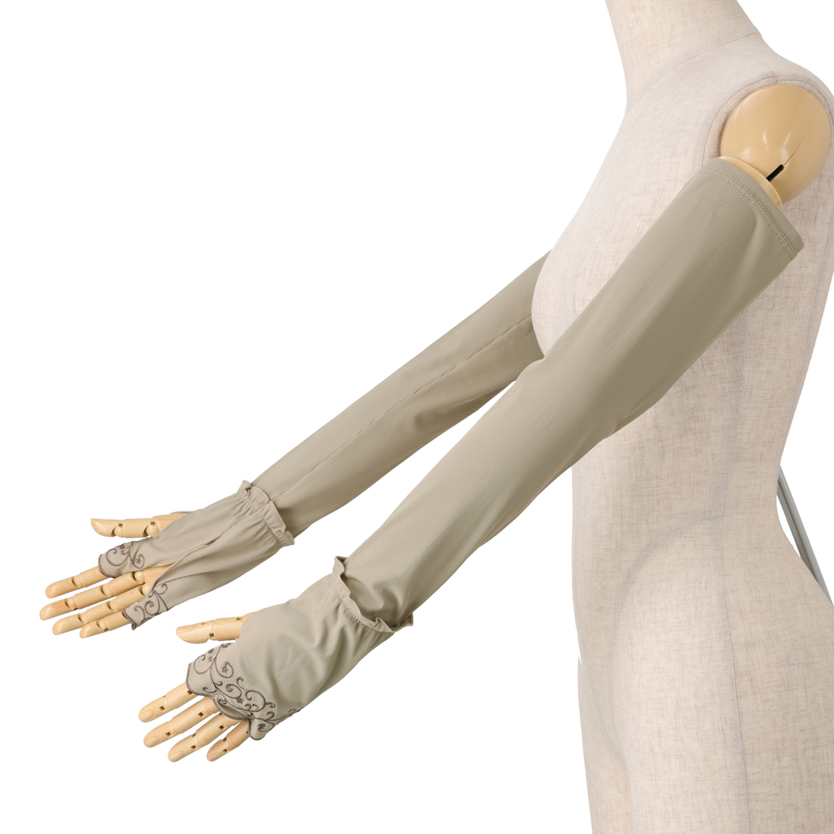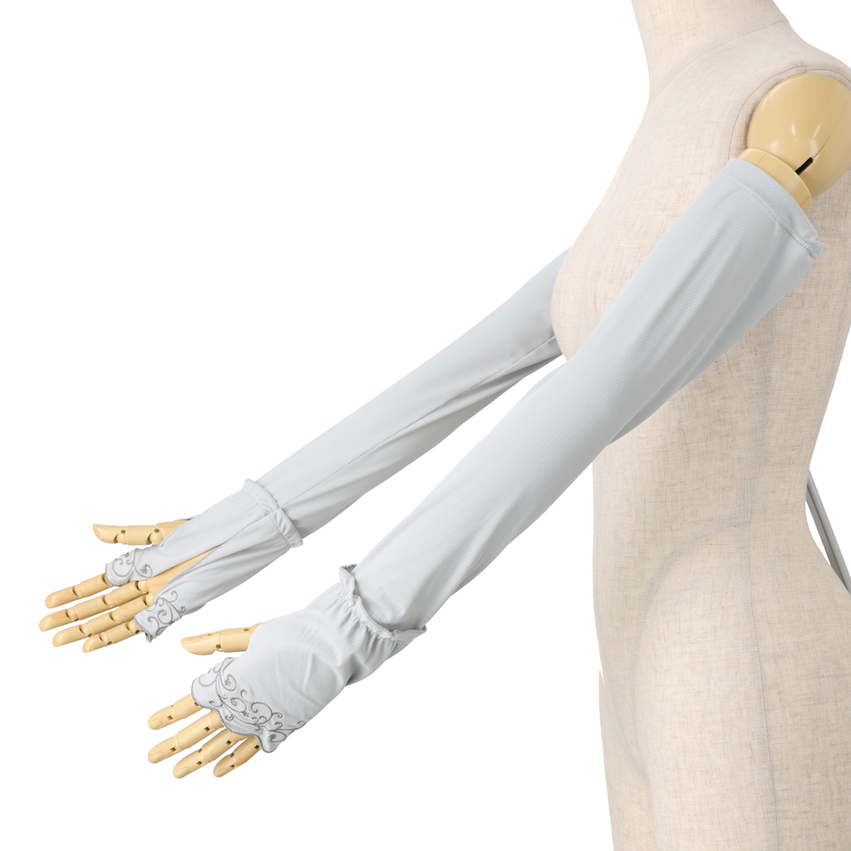 手先部分の刺しゅうがアクセント。接触冷感の生地を使用。さらっとなめらかな肌触りです。また、手洗いが可能なので、汗をかく季節でも気にせず使用できます