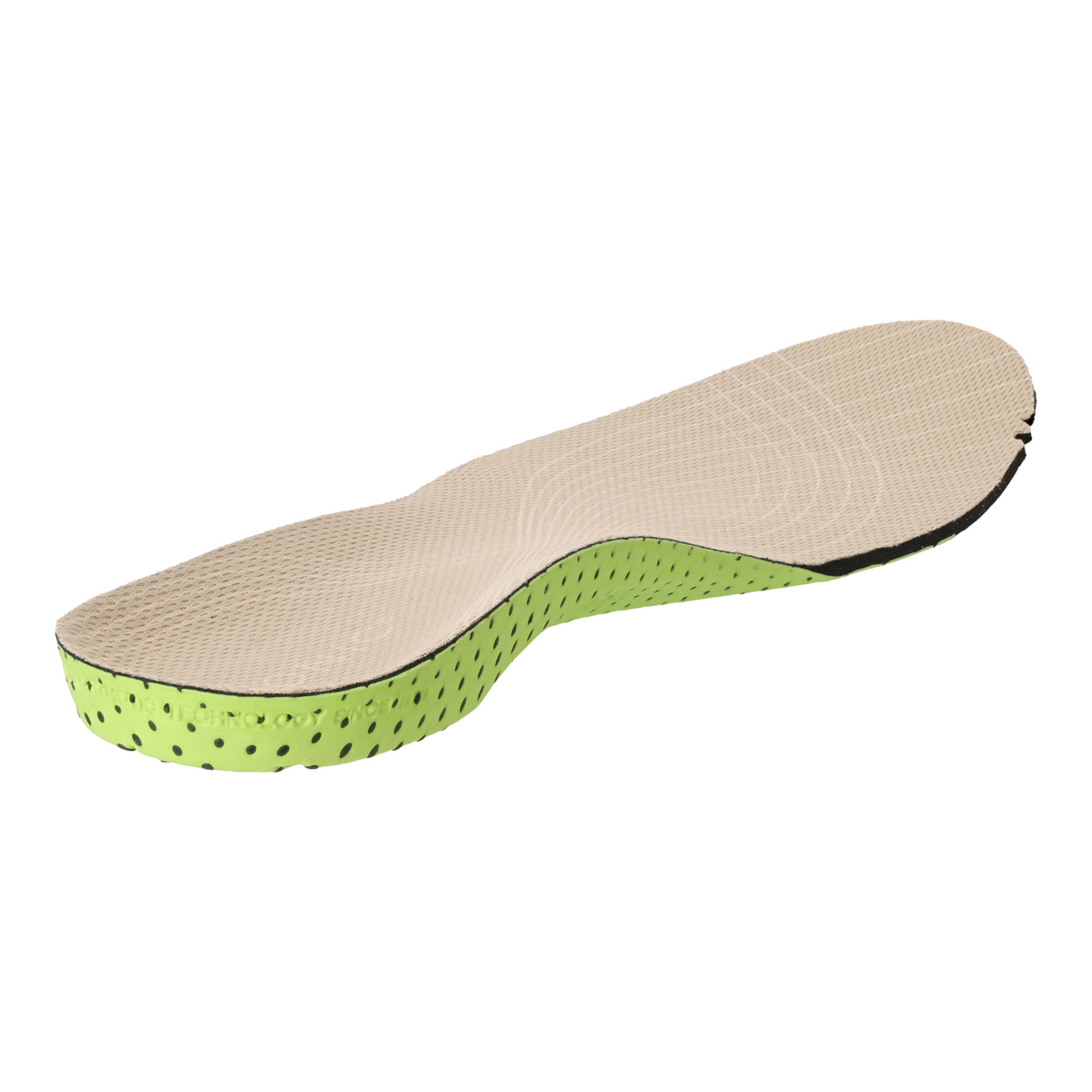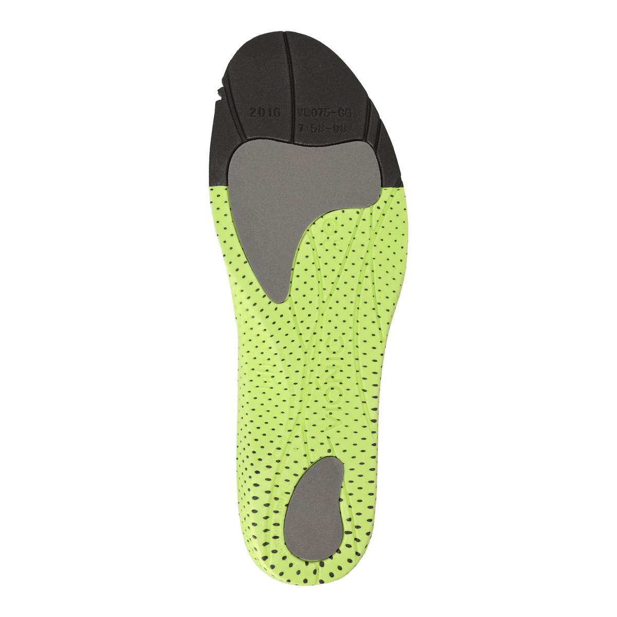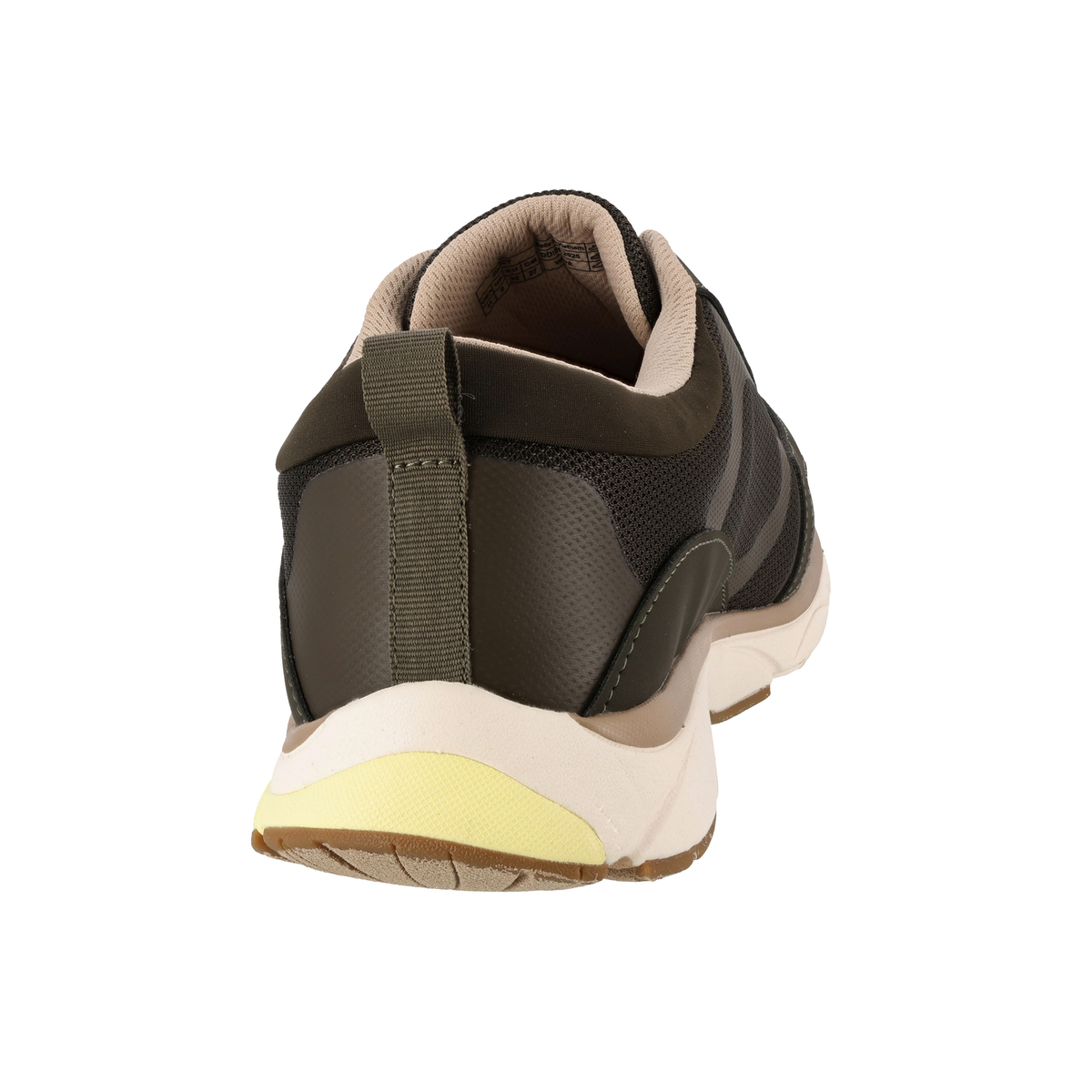 アッパー内側全体が厚みのあるクッションで覆われていて、足を優しく包み込みます。かかと部分に穴を空けることで通気性を高めているグリーン色のパーツ。硬めになっておりアーチサポートと安定性に優れています。歩行時の地面からの衝撃緩和のサポートの役割も果たします