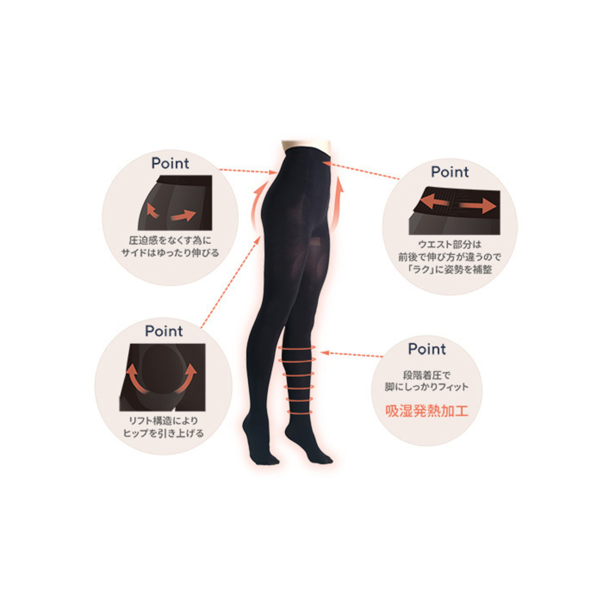 腹部・太腿・ふくらはぎのそれぞれの部位に合わせて段階的な着圧設計することでホールド感がありながらも動きやすく、均一ではなく強弱をつけた着圧ですっきり見せながらも日常の動きにやさしくフィットします