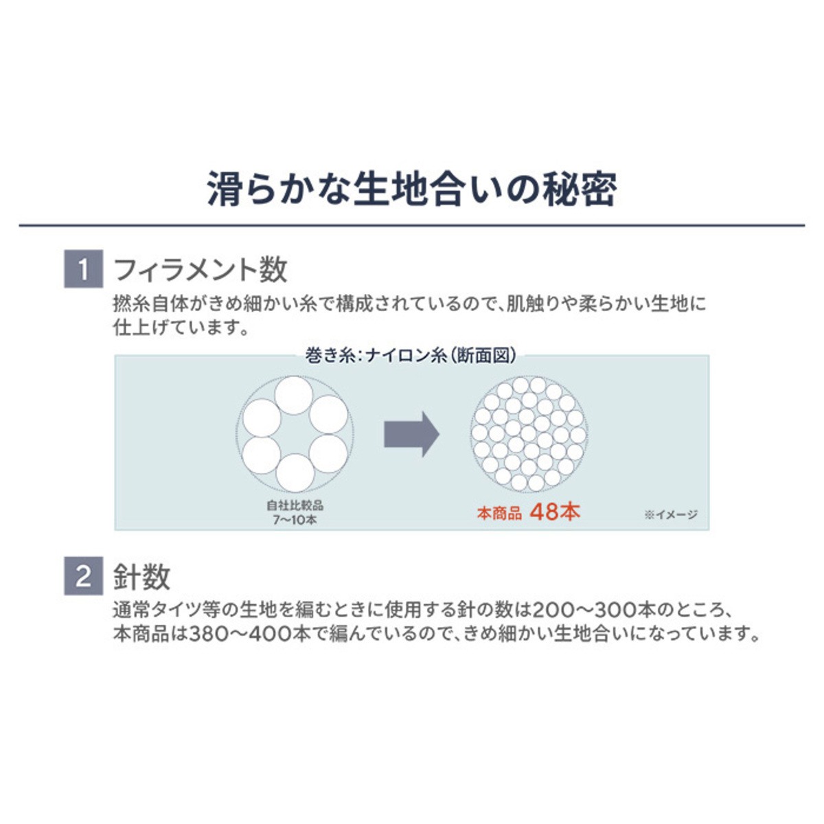[商品寸法(ヌード)cm] サイズ ヒップ M-L :(85〜98) L-LL :(90〜103) LL-3L:(95〜108) [素材] ナイロン 90%・ポリウレタン 10% 80デニール [お手入れ] 洗濯機洗い可 [推薦サイズ] M-L :身長150〜165cm、ヒップ:85〜98cm L-LL :身長155〜170cm、ヒップ:90〜103cm LL-3L:身長155〜170cm、ヒップ:95〜108cm [注意事項] ※水や汗、摩擦などにより色落ちや衣類など他のものに色が移ることがあります ※浸けおきはお避け下さい ※干す際は形を整え、しわを伸ばしてから干すようにしてください 【日本製】