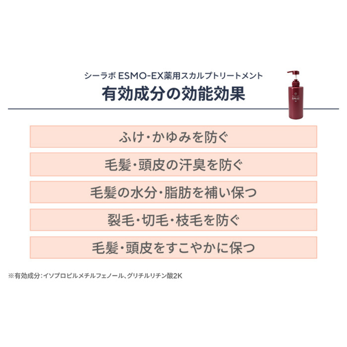 [商品内容] ・シーラボ薬用エスモEXスカルプトリートメント(医薬部外品)500g ・シーラボ薬用エスモEXスカルプトリートメント(医薬部外品)400g [使用方法] シャンプーの後に軽く水気をきってから適量を手に取り、毛先を中心に1分程度なじませます。その後よく洗い流してください [注意事項] ※頭皮に傷・はれもの・湿しん・かぶれ等のある場合には使用をおやめください ※使用中、または使用後に直射日光があたって頭皮に赤み・はれ・刺激等の異常があらわれた場合は、使用を中止し、皮膚科専門医等にご相談ください。そのまま使用を続けますと、症状を悪化させることがあります ※目に入ったときは、すぐに水で洗い流してください ※一度取り出した中身を再び容器の中に戻すことは絶対におやめください ※乳幼児の手の届かない所に保管し、極端に高温や低温・多湿な場所・直射日光の当たる場所には置かないでください ※天然由来原料使用のため、色調・香りに多少の違いが生じる場合がありますが、品質には問題はございません ■医薬部外品(ふけ・かゆみを防ぐ、毛髪・頭皮の汗臭を防ぐ、毛髪の水分・脂肪を補い保つ、裂毛・切毛・枝毛を防ぐ、毛髪・頭皮をすこやかに保つ) 【日本製】 [成分] 有効成分: イソプロピルメチルフェノール、グリチルリチン酸2K その他の成分: 水、硬化ナタネ油アルコール、濃グリセリン、メチルポリシロキサン、塩化アルキルトリメチルアンモニウム、加水分解コラーゲン末、ヒアルロン酸ヒドロキシプロピルトリモニウム、シア脂、部分水素添加ホホバ油、クエン酸、クエン酸Na、 グリセリル-N-(2-メタクリロイルオキシエチル)カルバメート・メタクリル酸ステアリル共重合体、グリセリンエチルヘキシルエーテル、高重合メチルポリシロキサン(1)、香料、BG、天然ビタミンE、ビタミンE、フェノキシエタノール、モノステアリン酸ポリエチレングリコール
