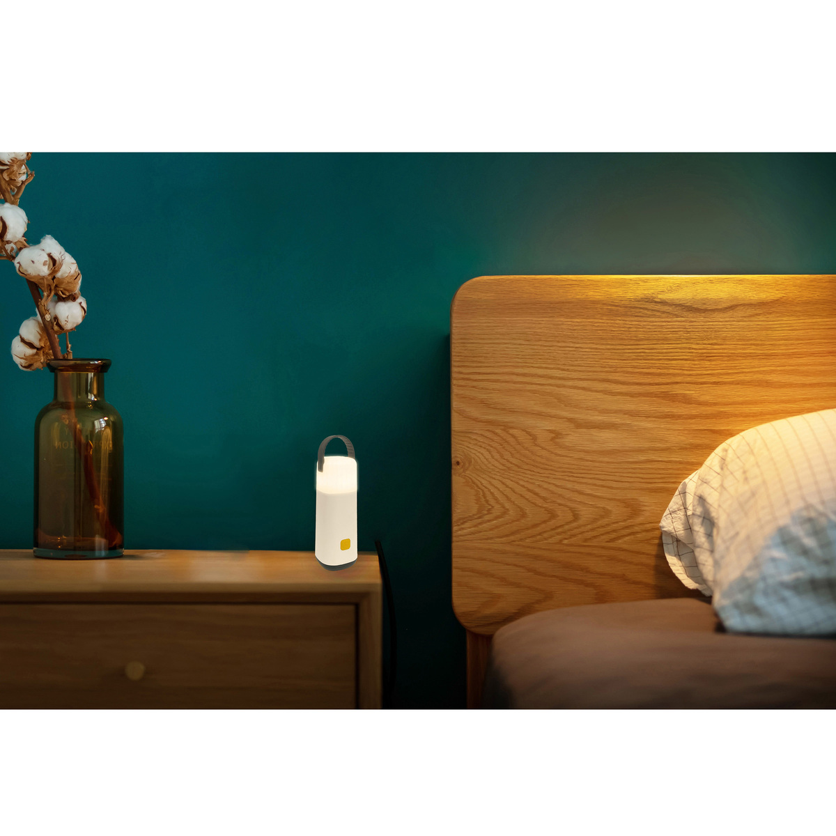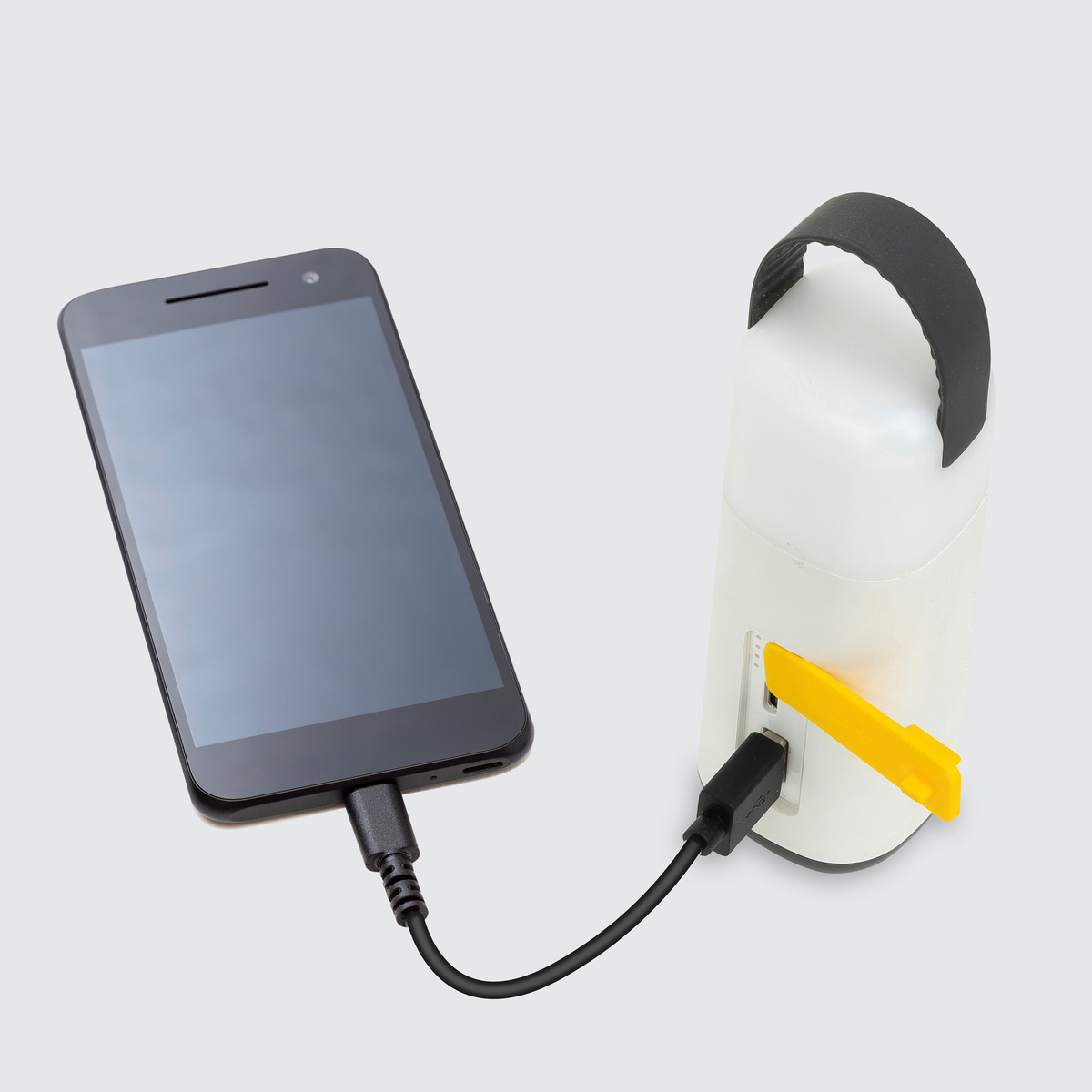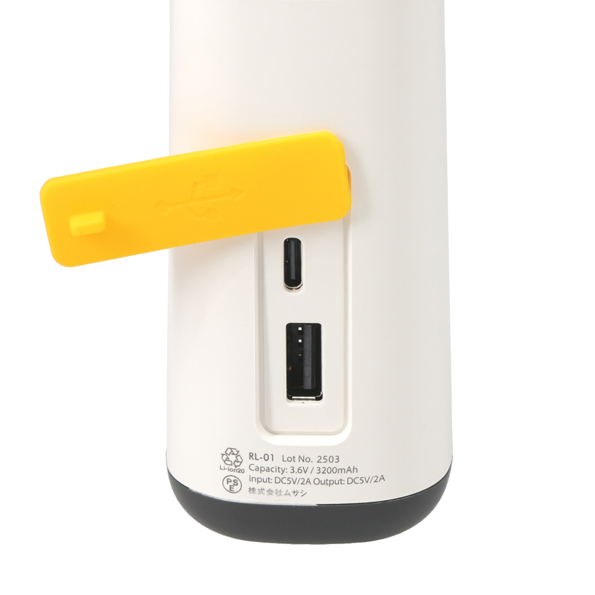 USB Type-A、USB Type-Cの差し口があるので、スマホ等の充電が可能に*。満充電時で約1800mAhの給電が可能です。ハンドル付きで、吊り下げてもご使用いただけます