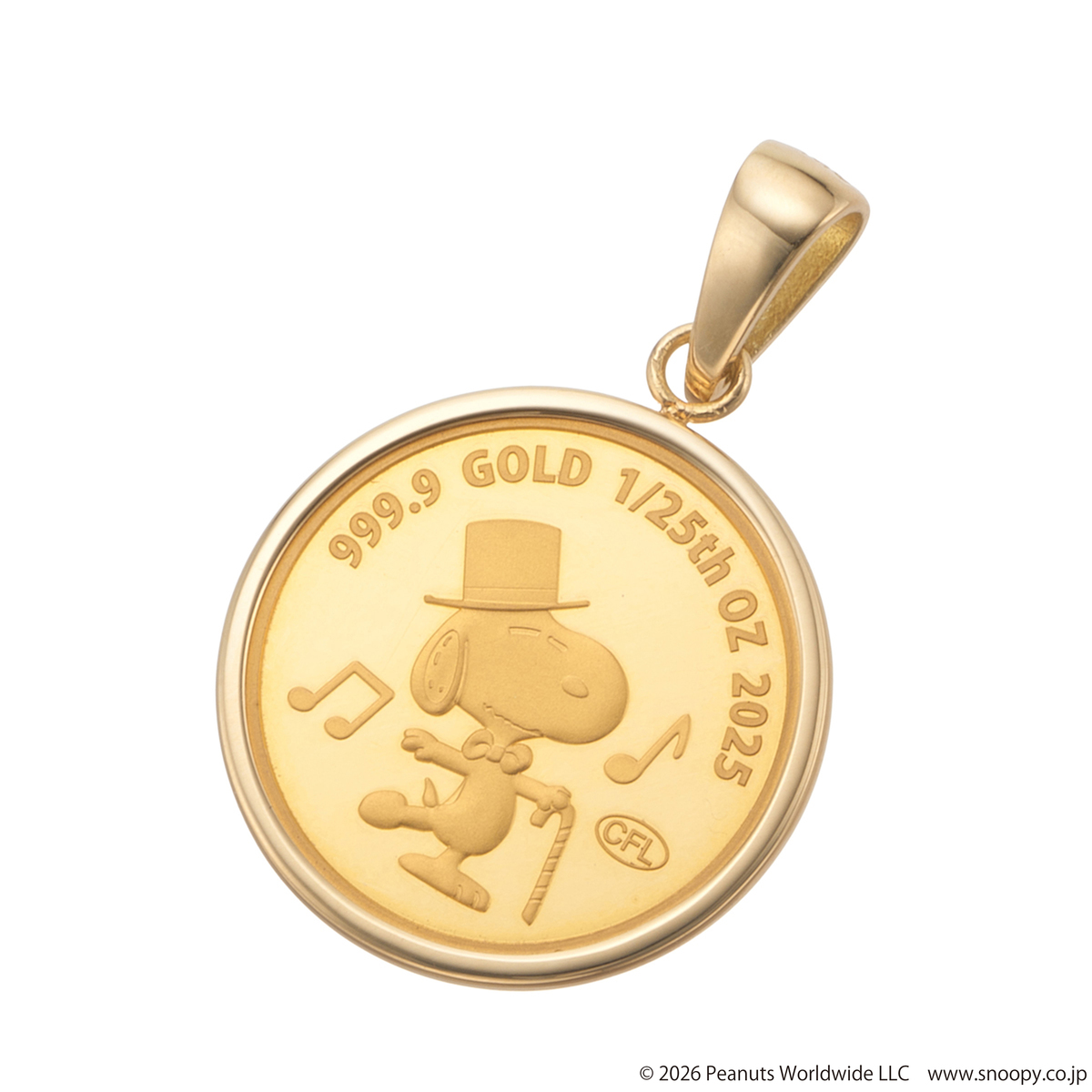 75周年を記念した純金メダルをペンダントヘッドに仕立てました。クラウンをかぶったスヌーピーと、ダイヤモンドの上にウッドストックが描かれた愛らしいデザイン。片面には正装をして楽しそうに音楽と触れ合うスヌーピーの姿が描かれています