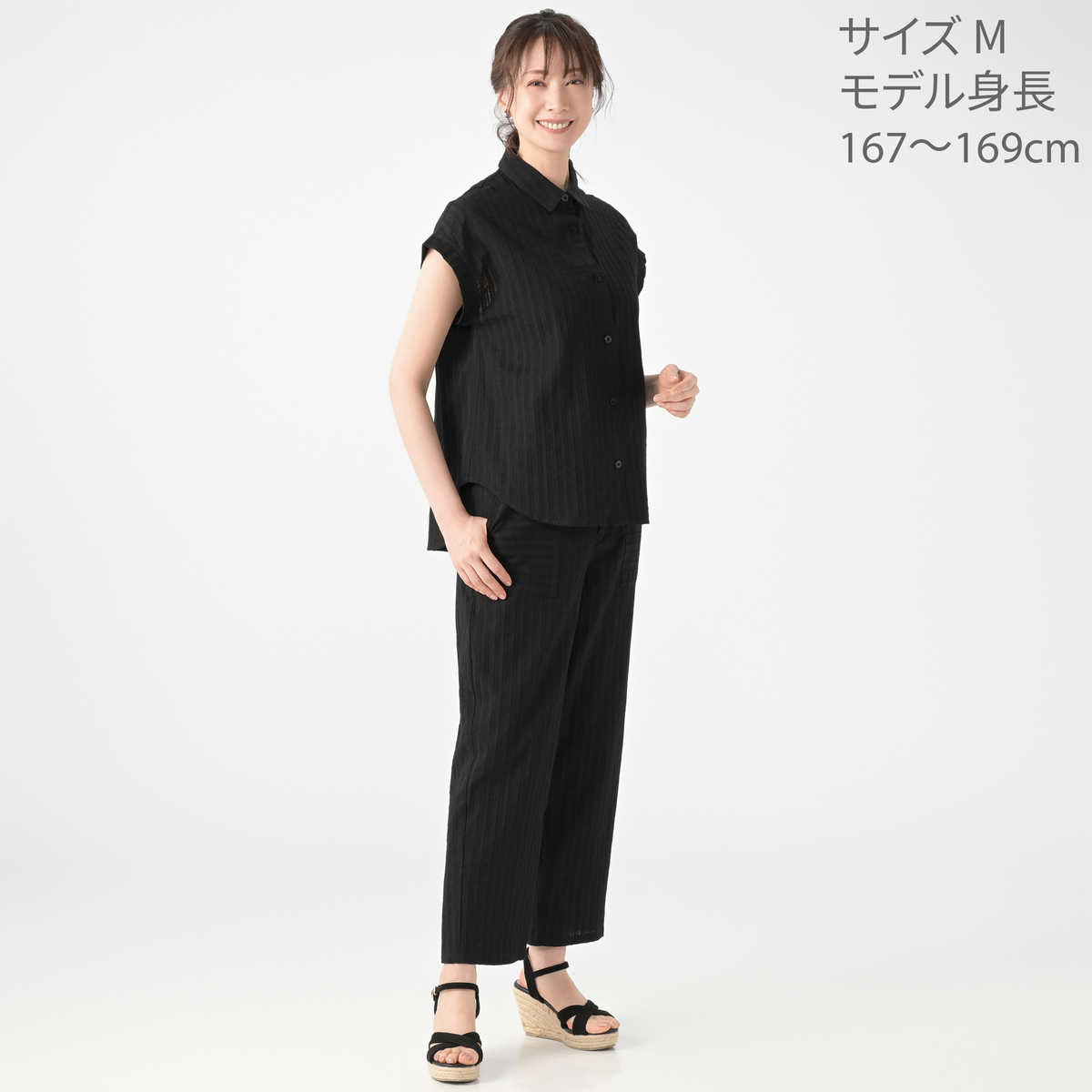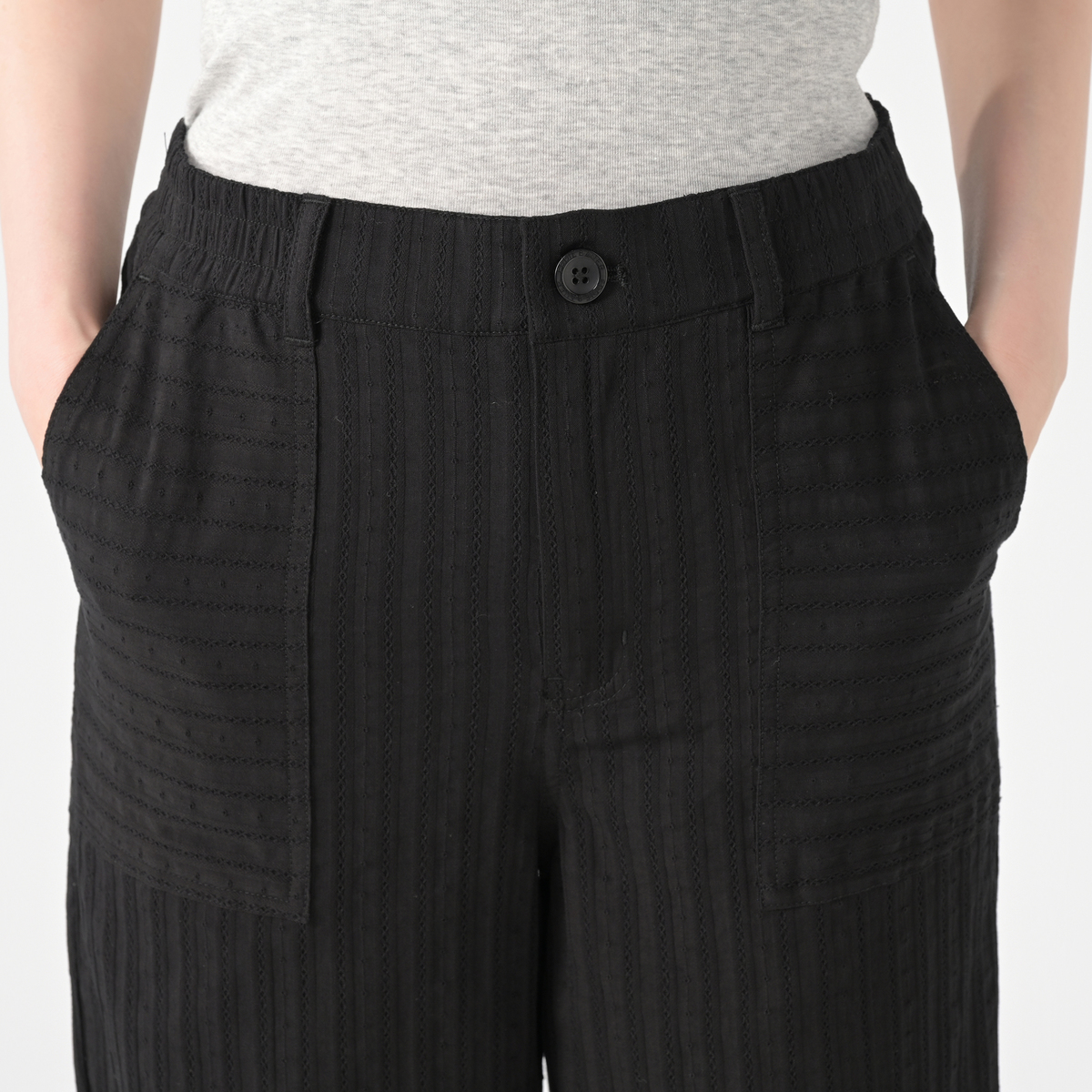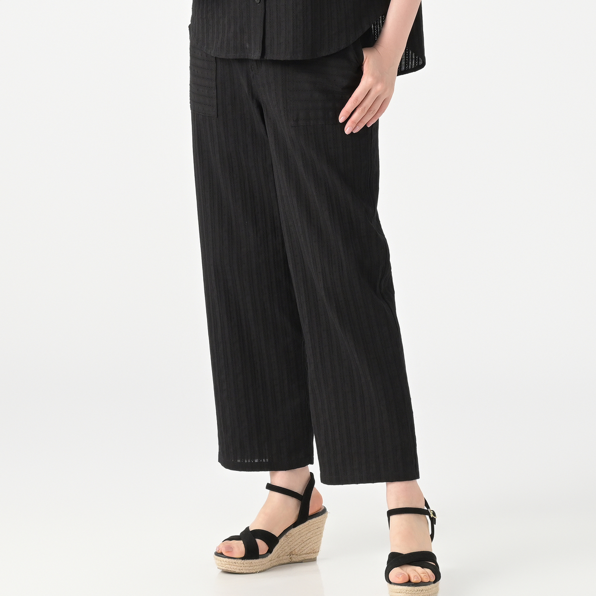 ゆったりとしたリラックス感のあるセミワイドパンツ 。ウエストはすっきりとした見た目ながら、前一部を除いたゴム仕様で、楽な穿き心地です