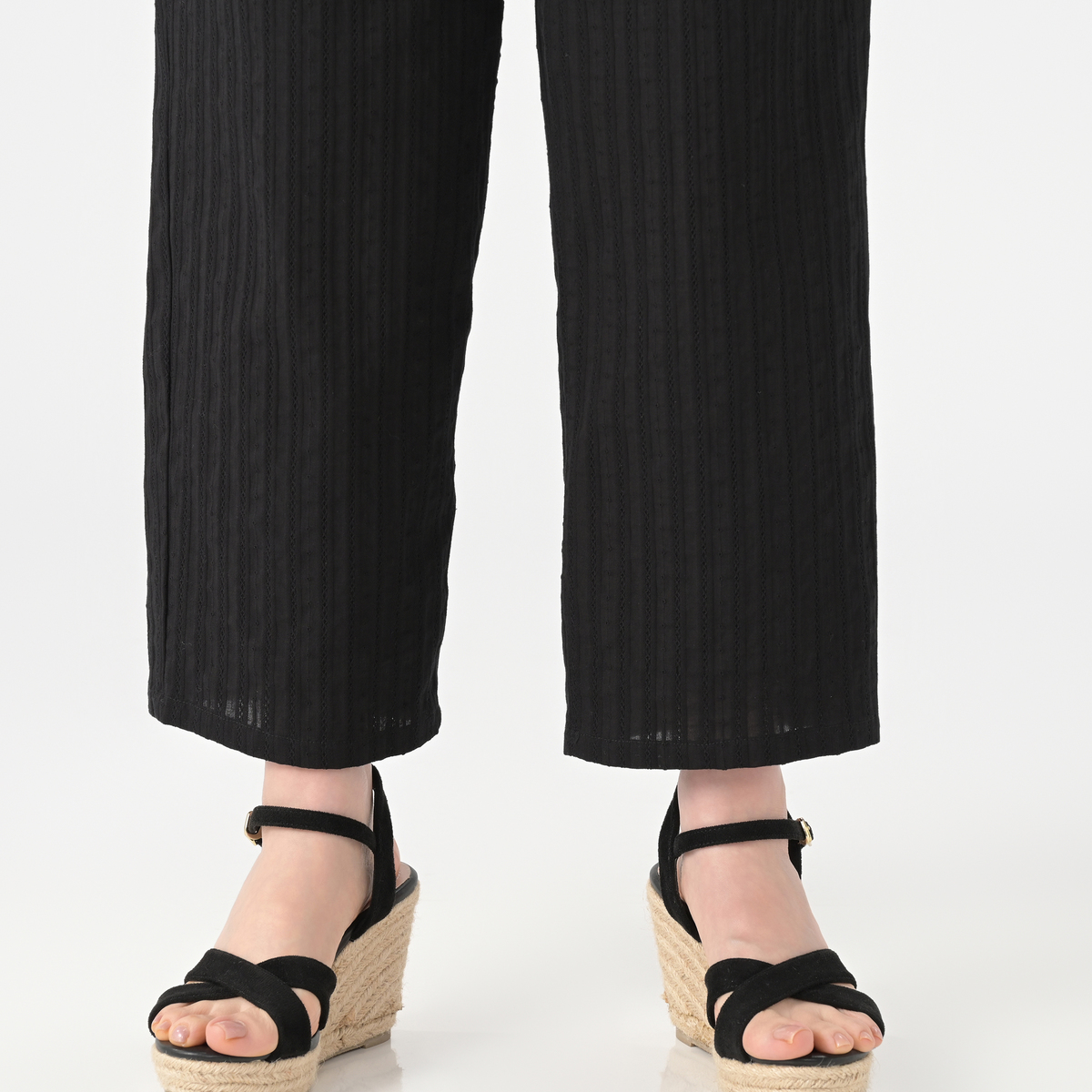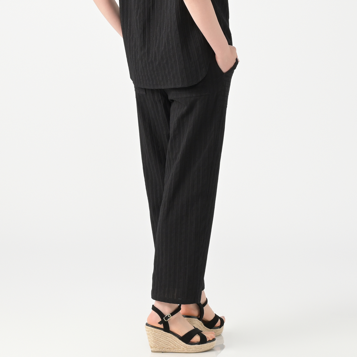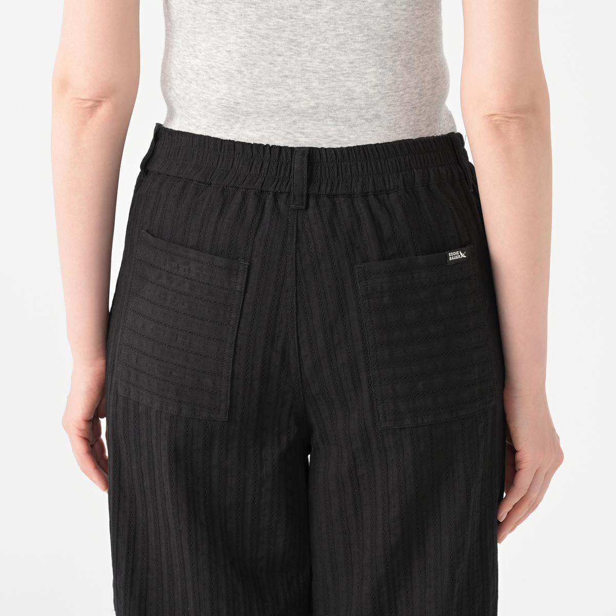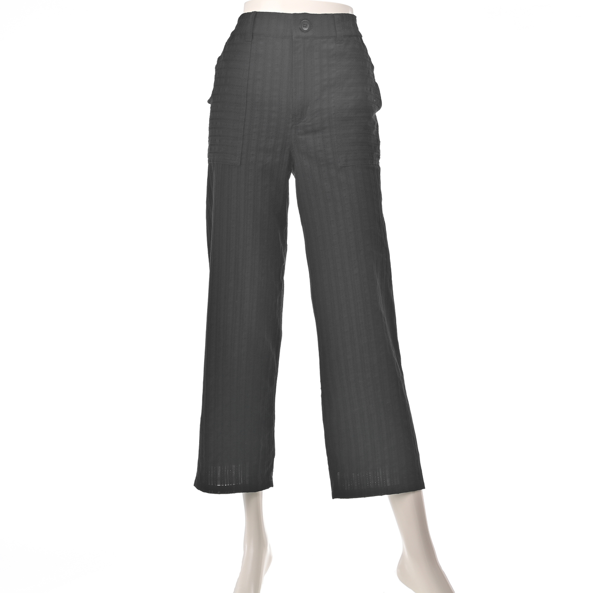 ゆったりとしたリラックス感のあるセミワイドパンツ 。ウエストはすっきりとした見た目ながら、前一部を除いたゴム仕様で、楽な穿き心地です