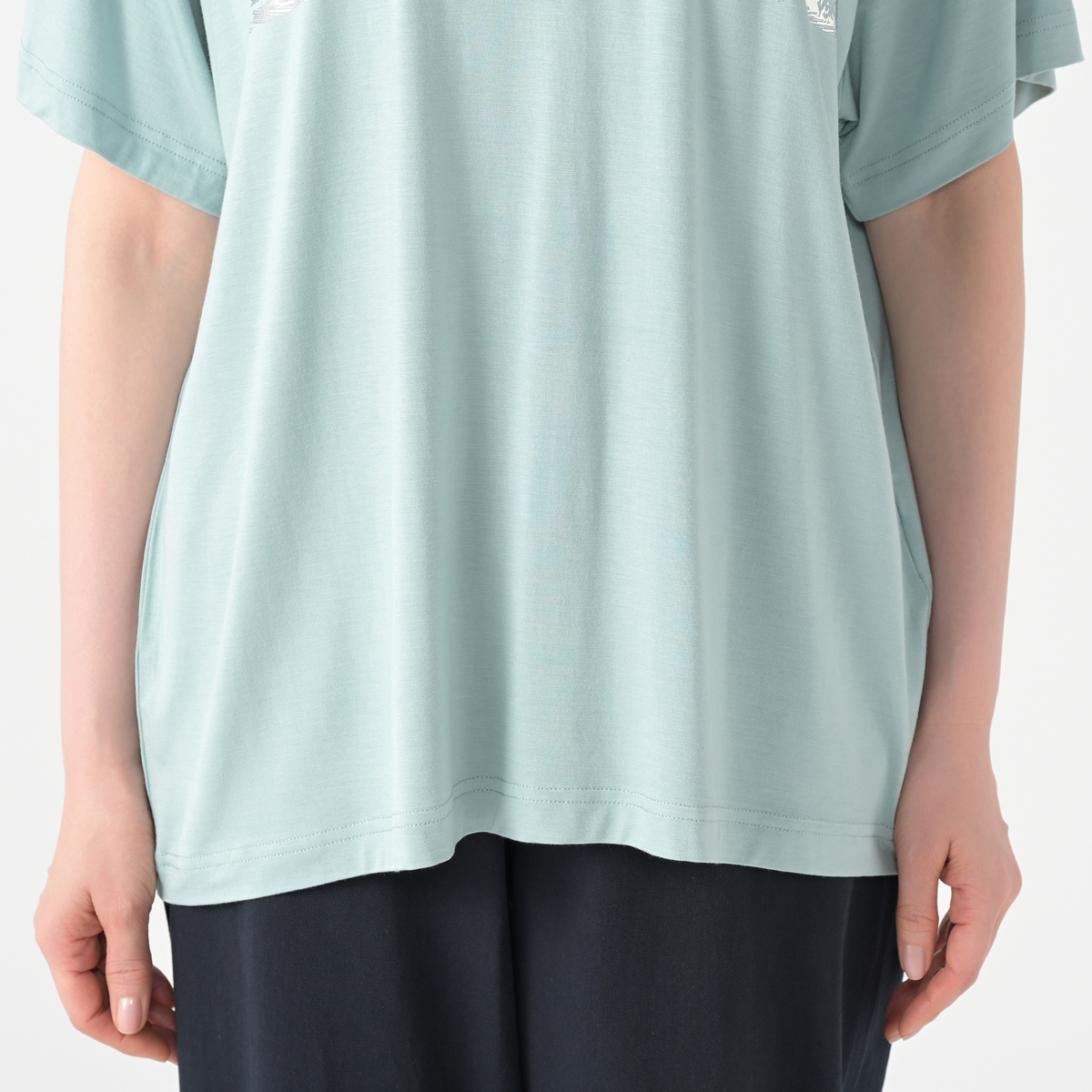 箔プリントあしらったTシャツ。シンプルながらも印象的なデザインで、日常にさりげない華やかさをプラス。スタイルに新鮮な輝きを添える一枚です