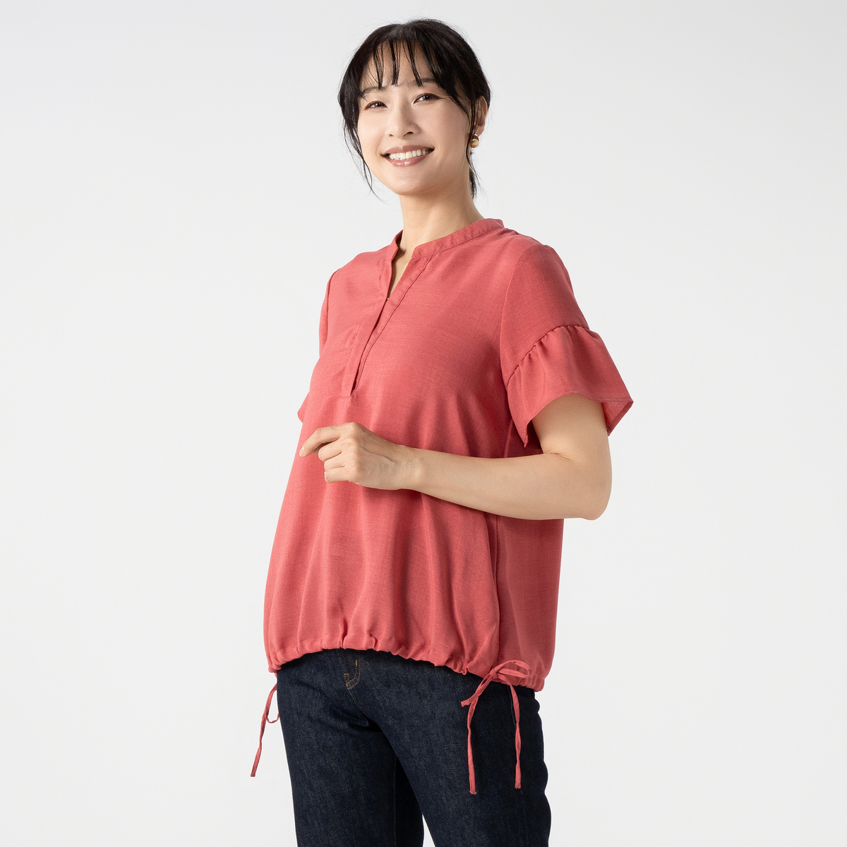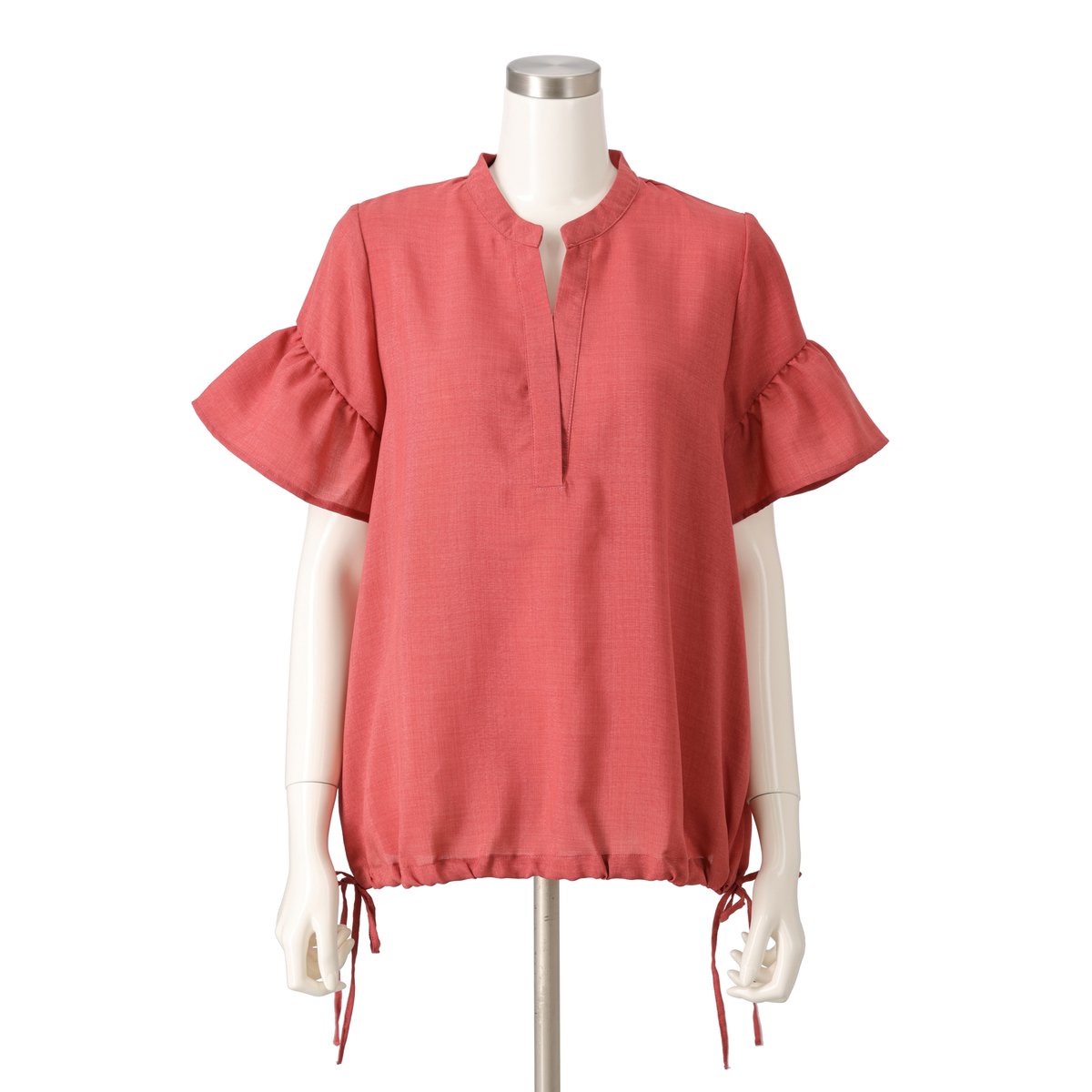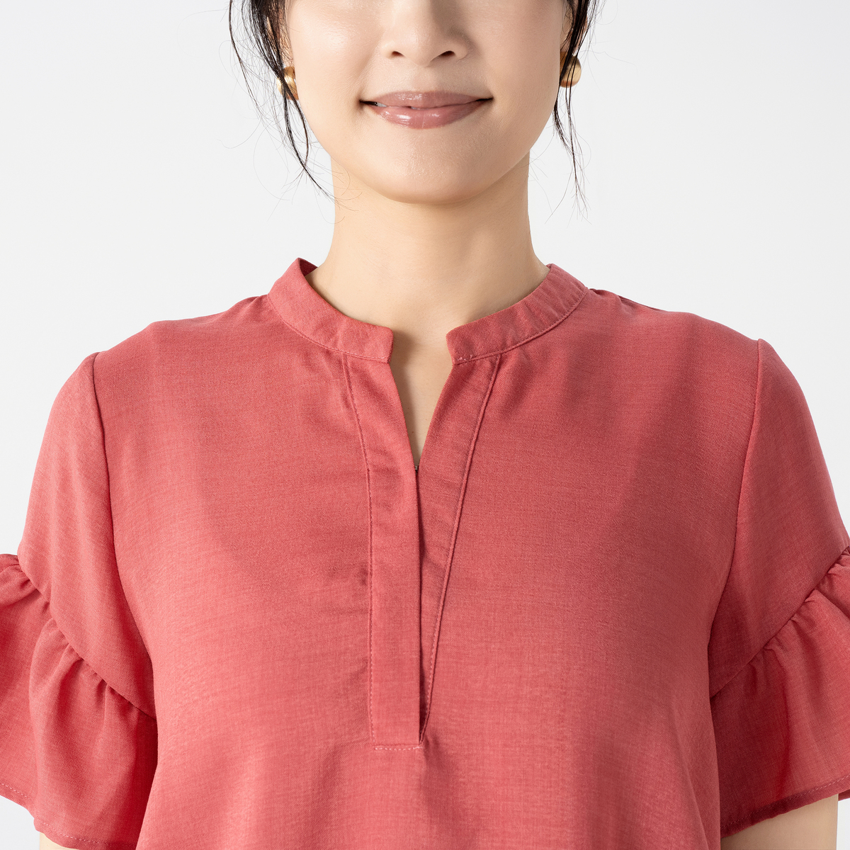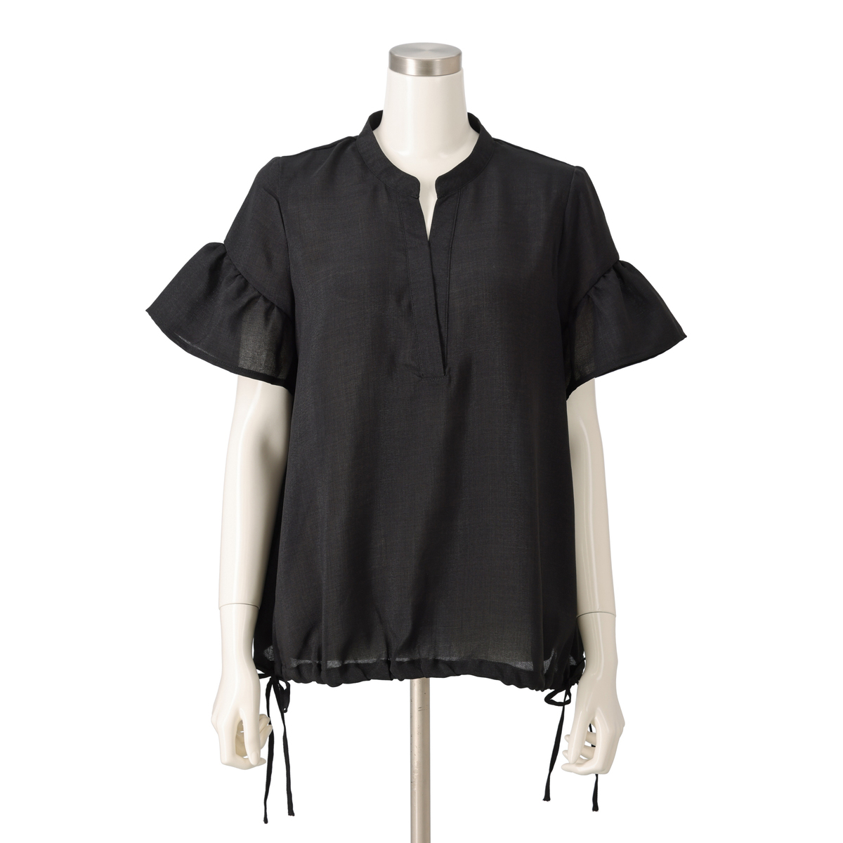 ギャザーフリルをあしらった、ゆったりとした袖口が腕周りをさりげなくカバー。衿元の深いV字前立てとバンドカラーで顔周りがすっきりと見えます