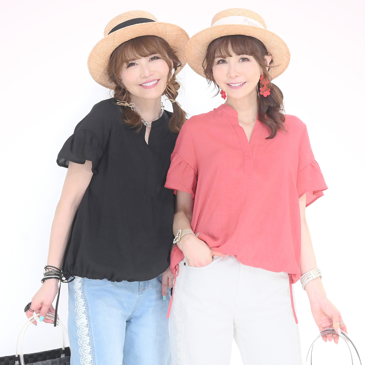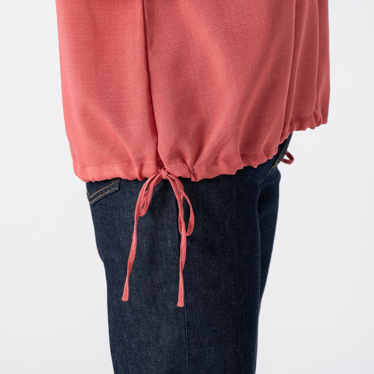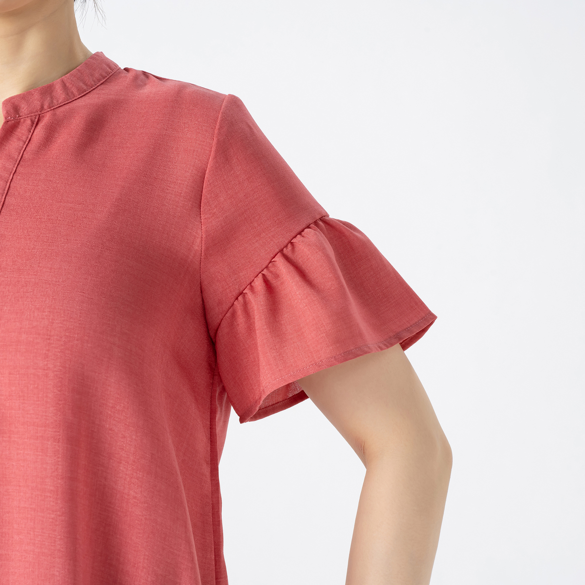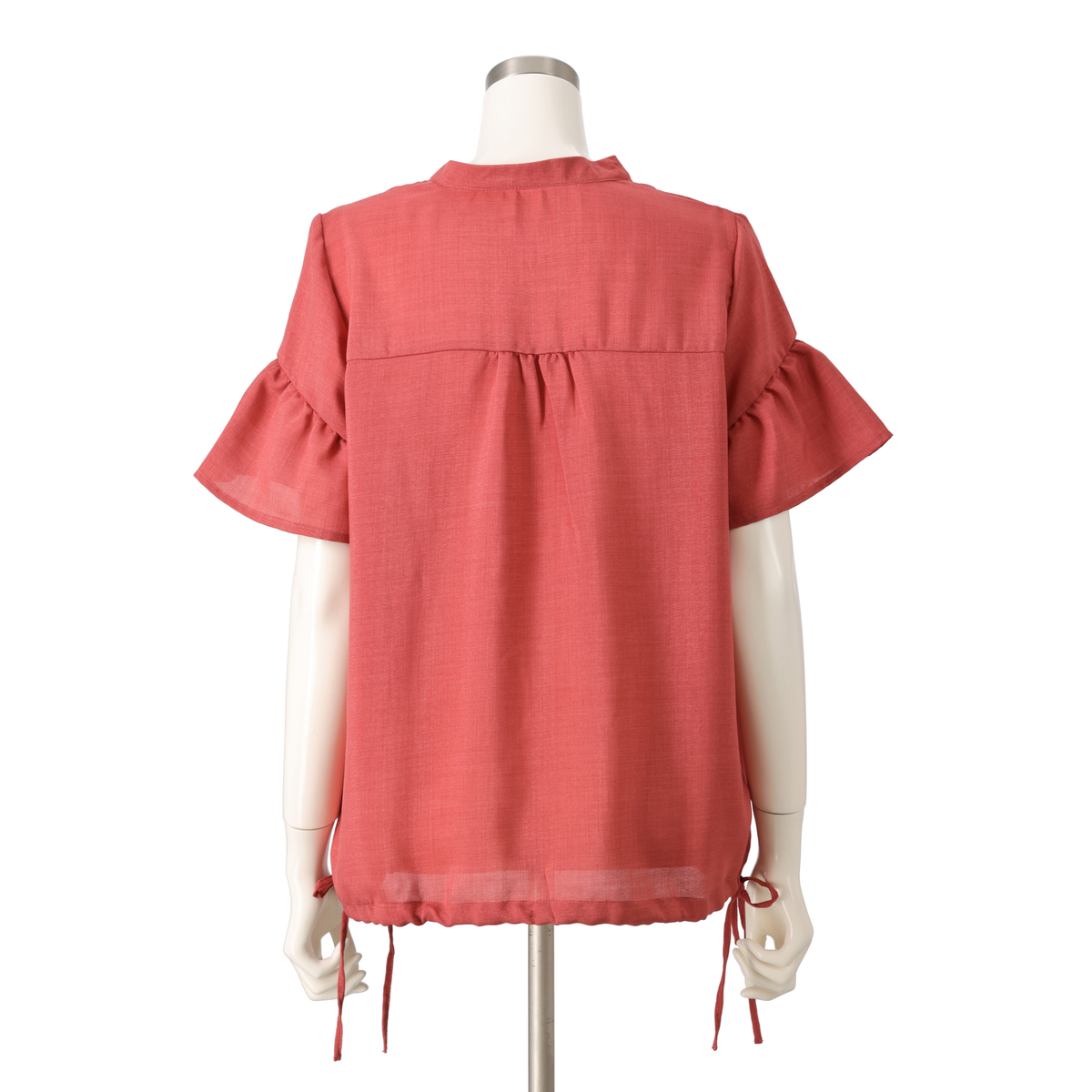 ギャザーフリルをあしらった、ゆったりとした袖口が腕周りをさりげなくカバー。衿元の深いV字前立てとバンドカラーで顔周りがすっきりと見えます