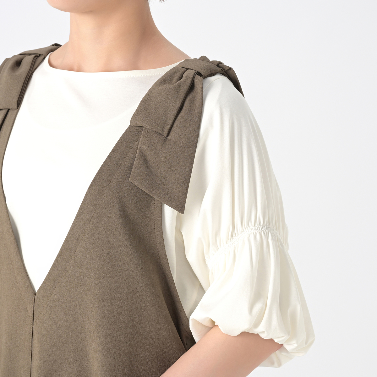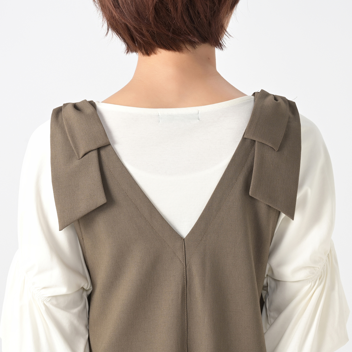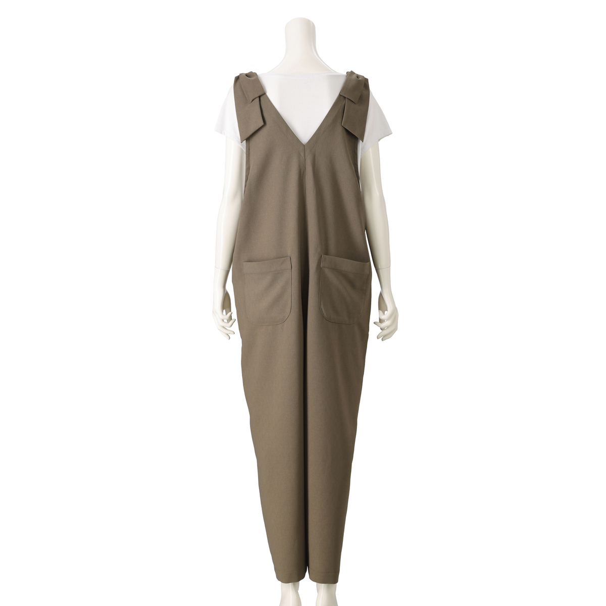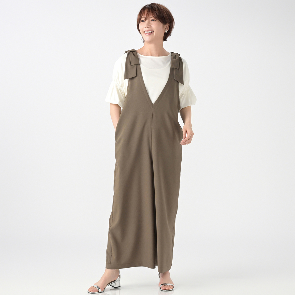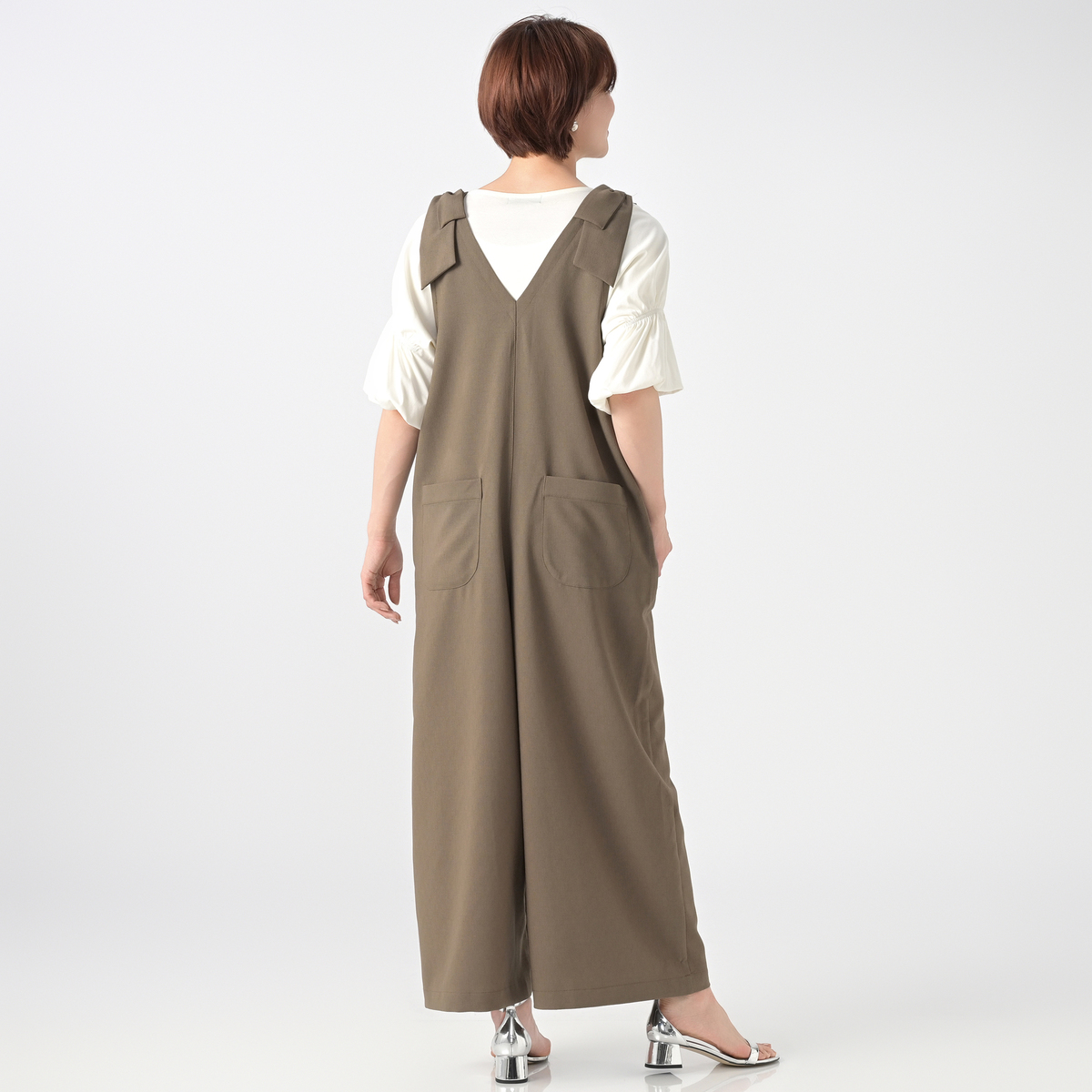 肩に共生地リボンをあしらったサロペット。深いVネックがシンプルながら目を惹くデザインで、大人っぽく着用できます。立体的な肩のリボンが大人可愛さを引き立ててくれます