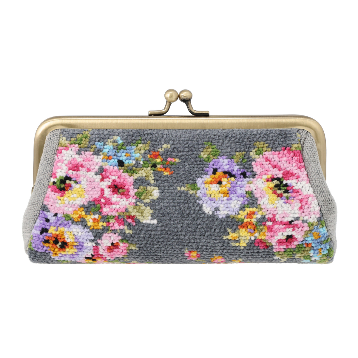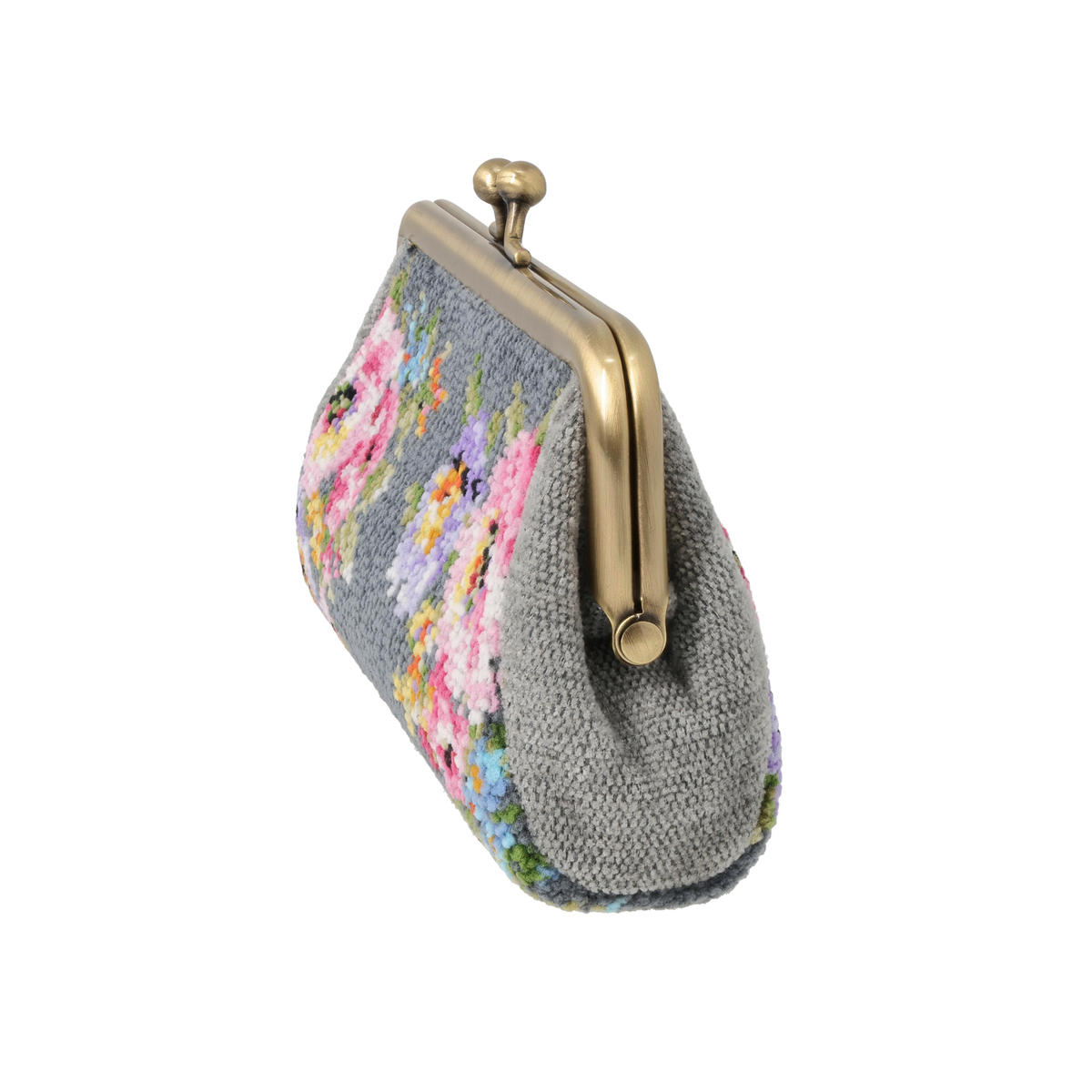 全面にシェニール織を使用した華やかなポーチ。がま口式の開閉で、片手でも簡単に開けられます
