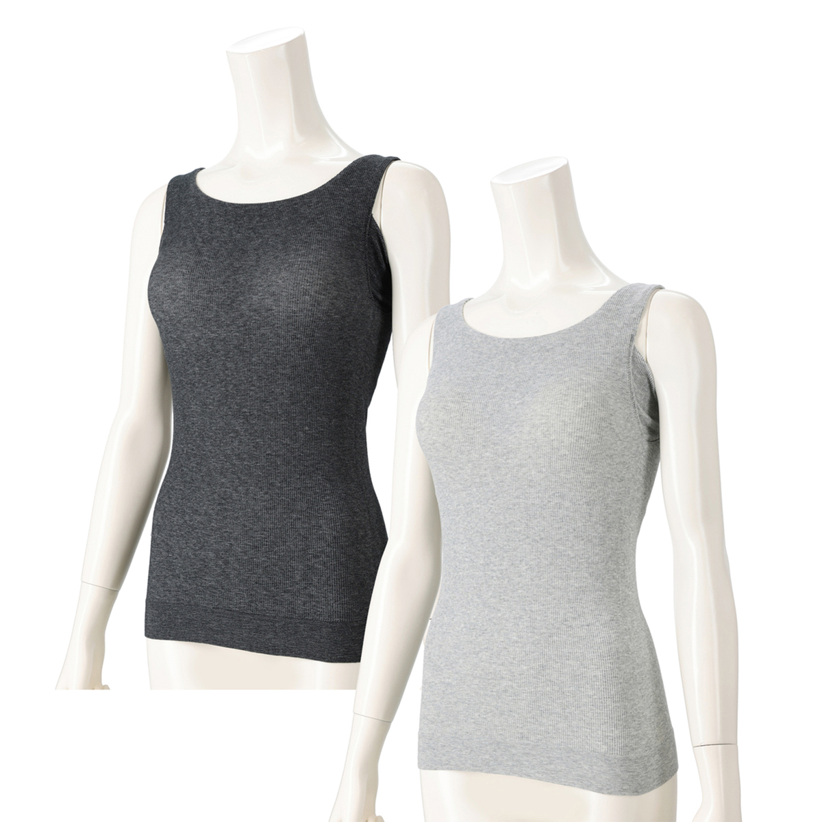 身頃の肌側(内側)の編地にモールドカップのブラを内蔵させた一体型。表の編地と2重のパワーでバストから背中までぐるっとサポート。背筋もスッキリで、下辺(アンダー)を身頃に縫い付けないフラシ仕上げなので、身体の動きにフィットしやすく快適です