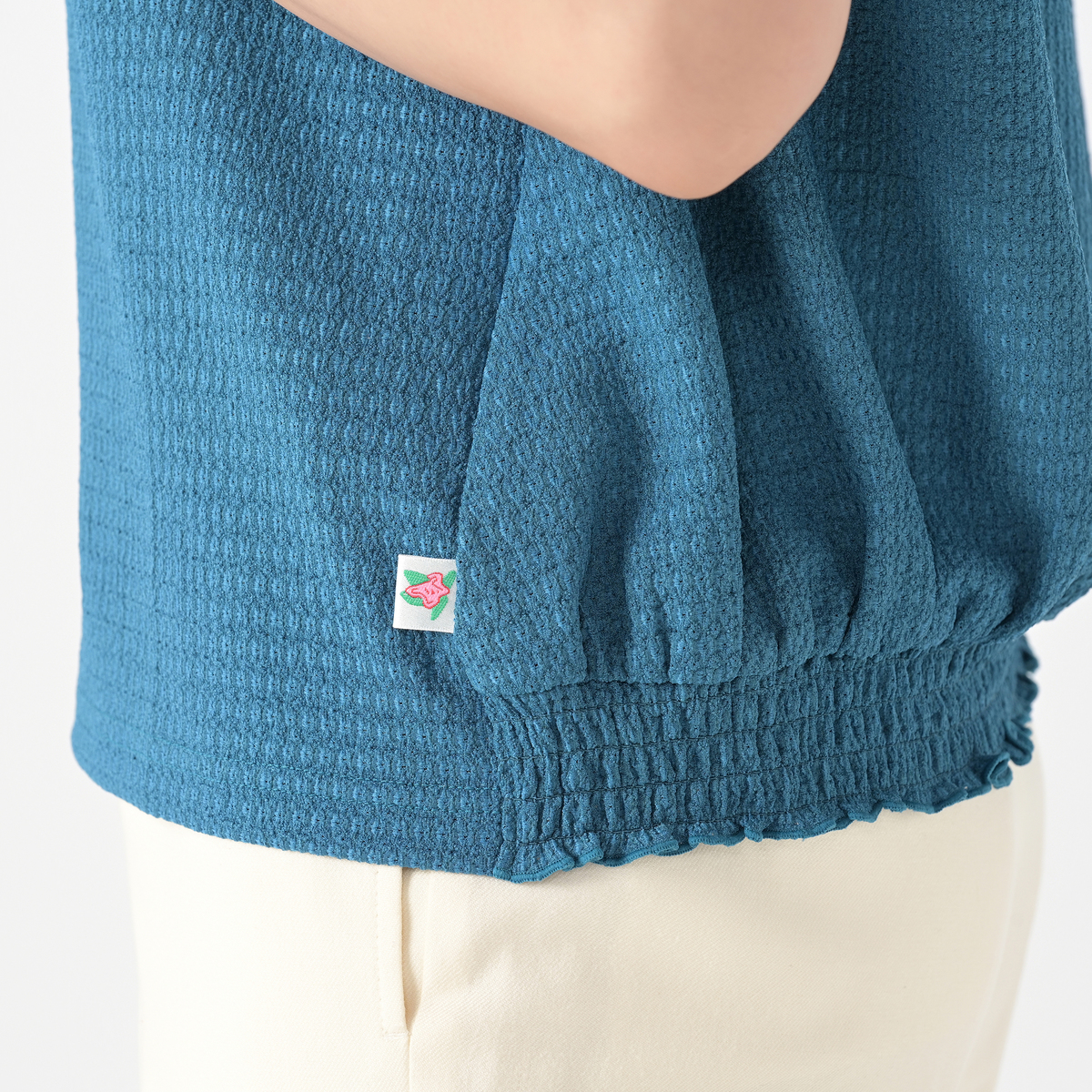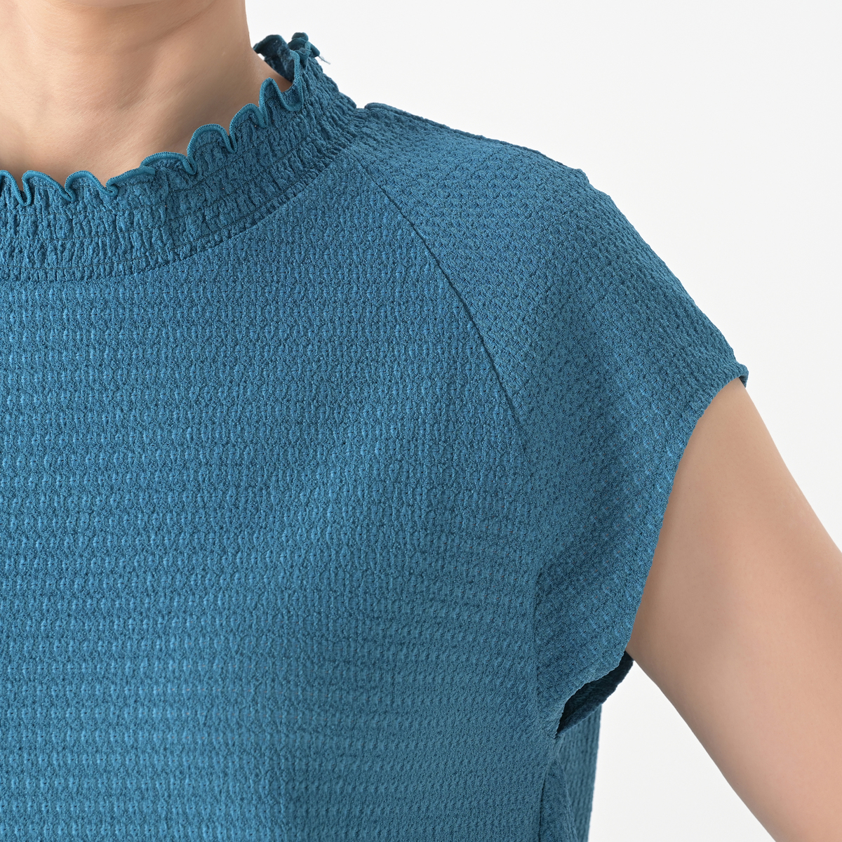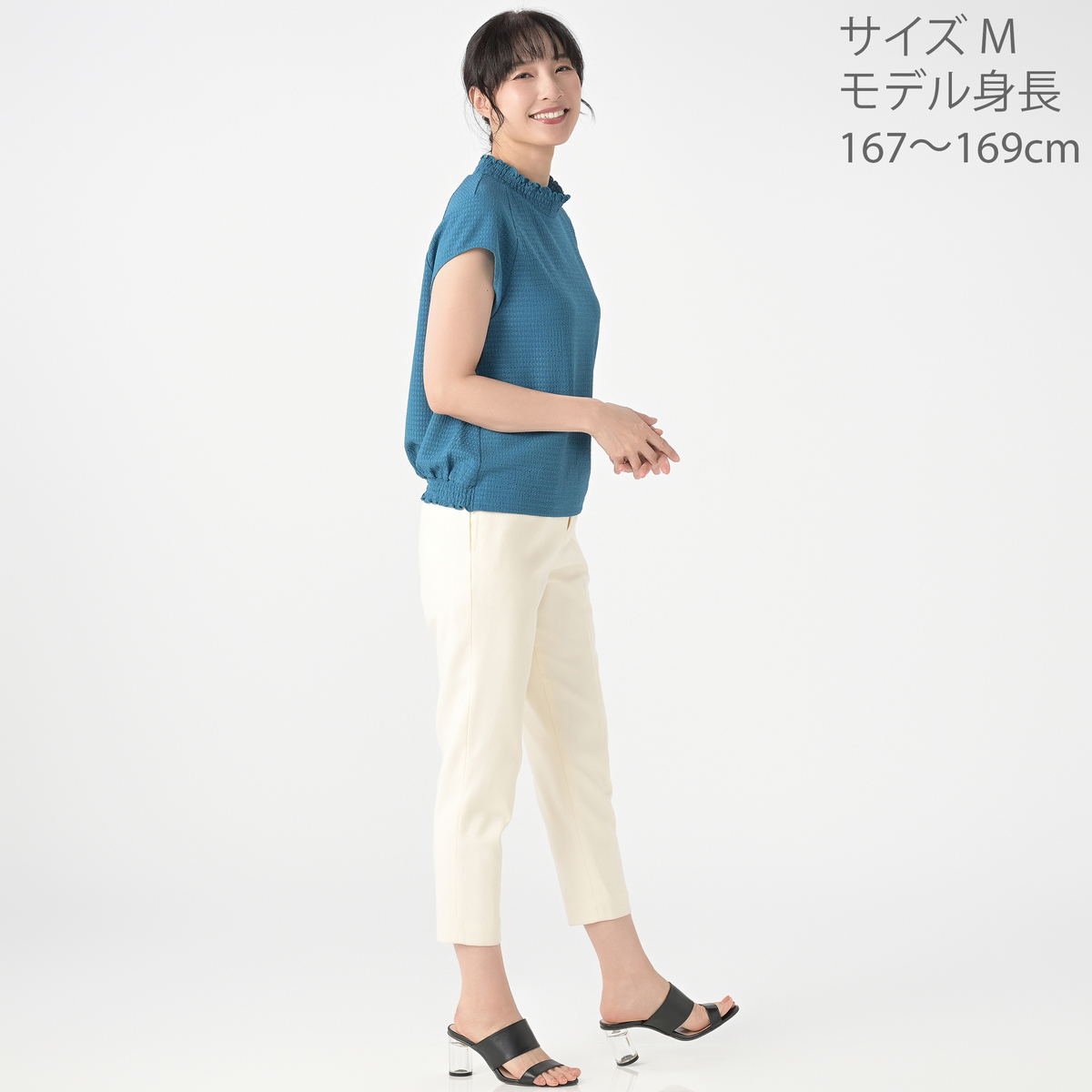 シンプルに見えながら、シャーリングデザインが上品な華やかさをプラス。コーデに加えるだけで、いつものスタイルが華やぎます