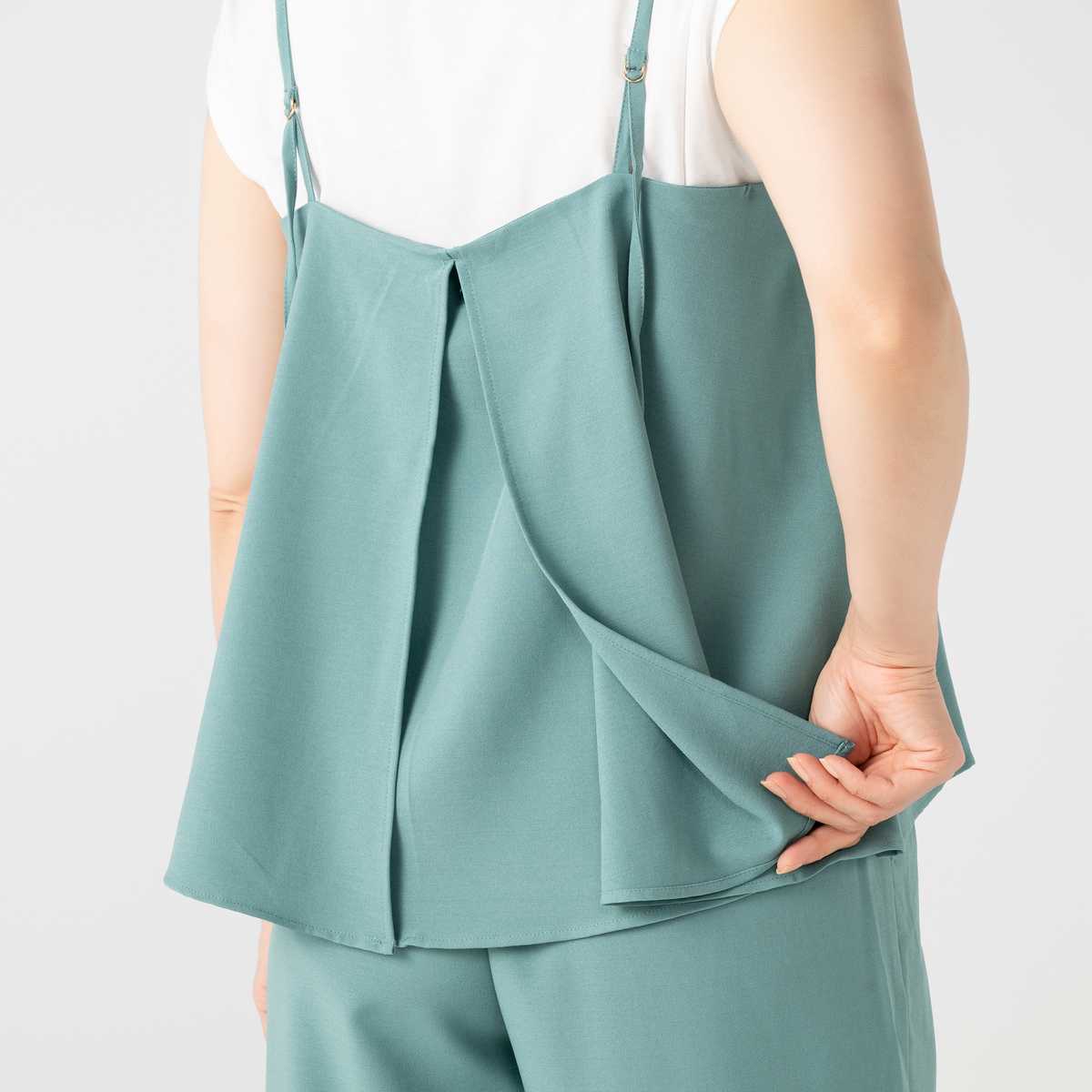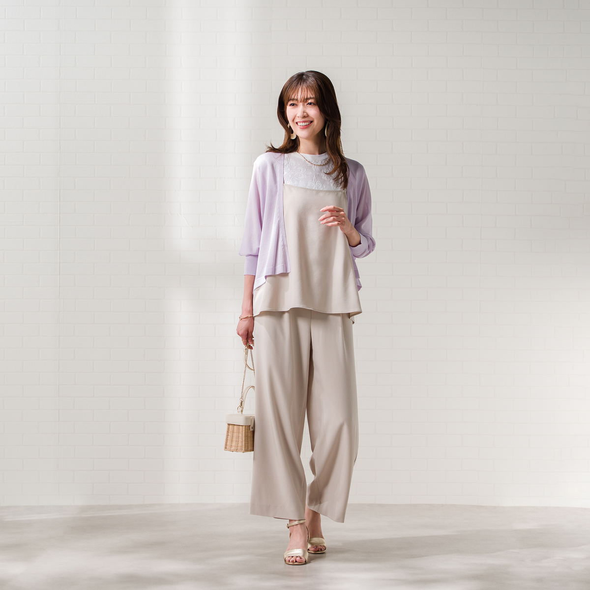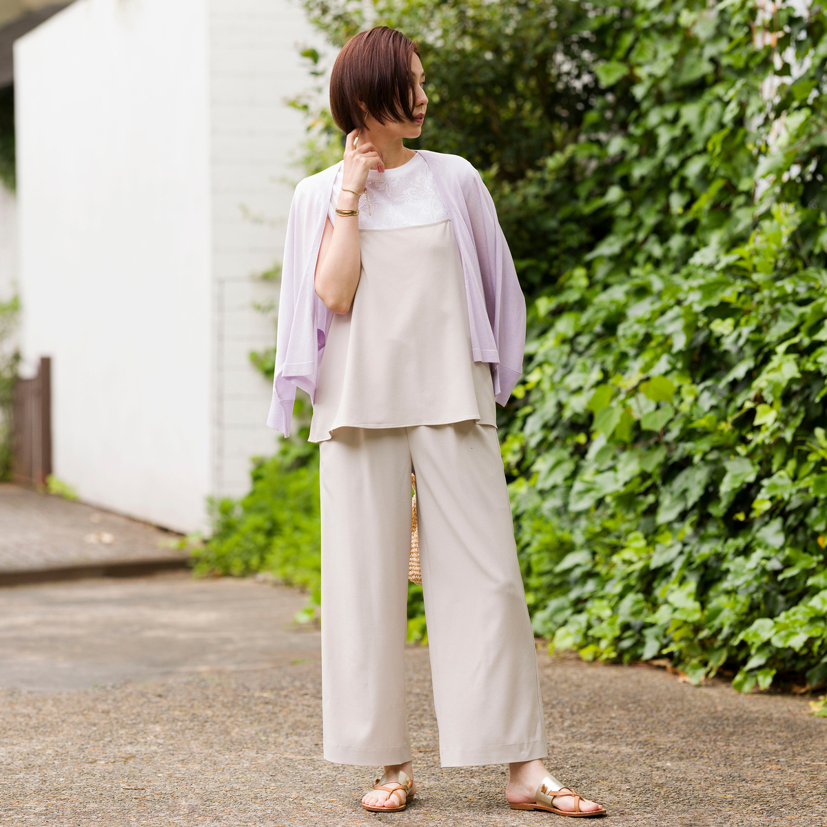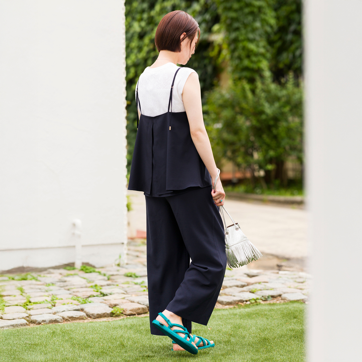 キャミソールとパンツのセットアップは、一見、幼く見えがちですが、こちらのオンエアを見ていて、大人が着用していてもオシャレ見えしたのでネイビーを購入しました。後ろ姿も、素敵で、このお洋服を着用して出掛けると、友人や、知人の集まりや勤務先でも評判が良くて、とっても嬉しかったです。何を合わせるかで、カジュアルにもエレガントにも装えて、ネイビーを選んで良かったです。
